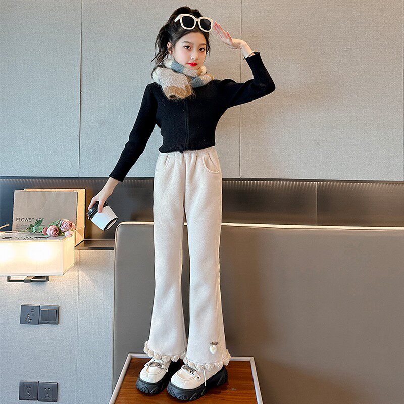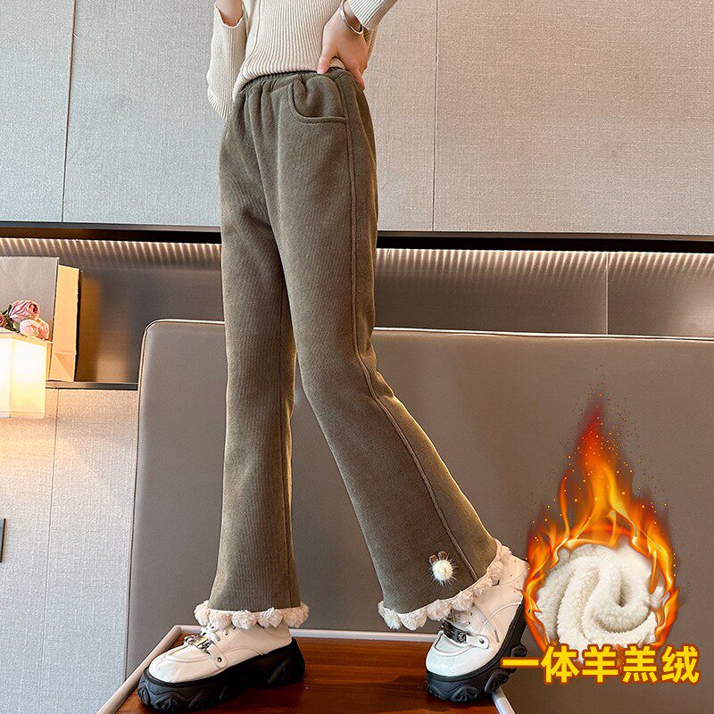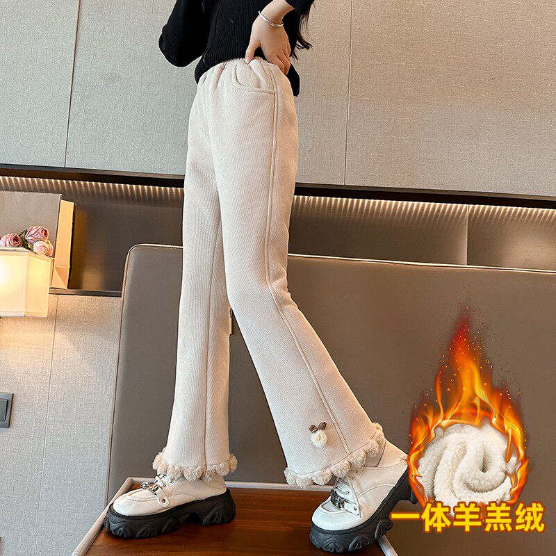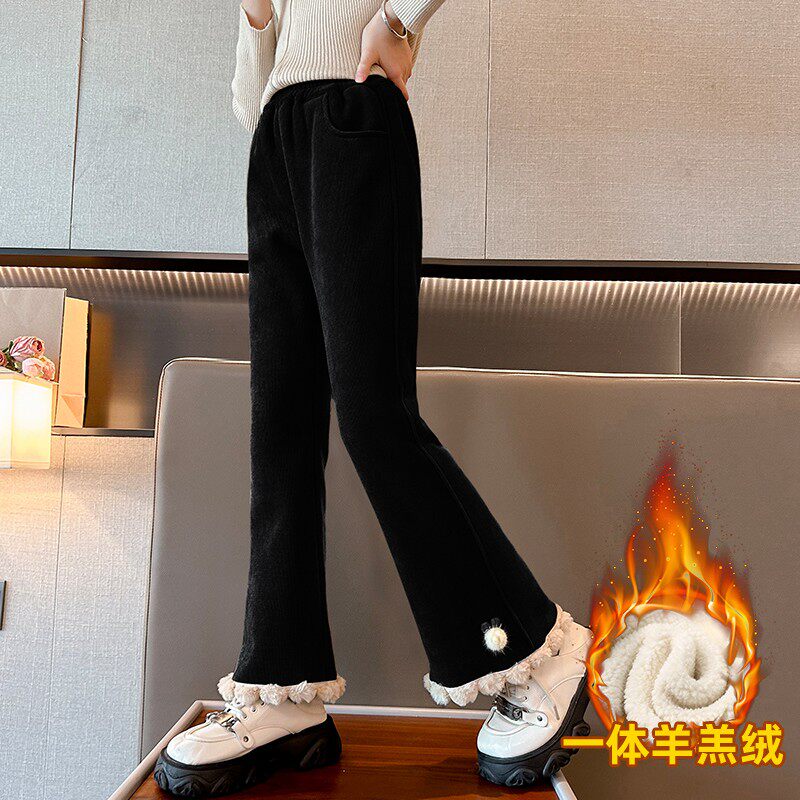 女童羊羔绒喇叭裤秋冬款2025新款女大童加厚女孩冬季儿童加绒裤子