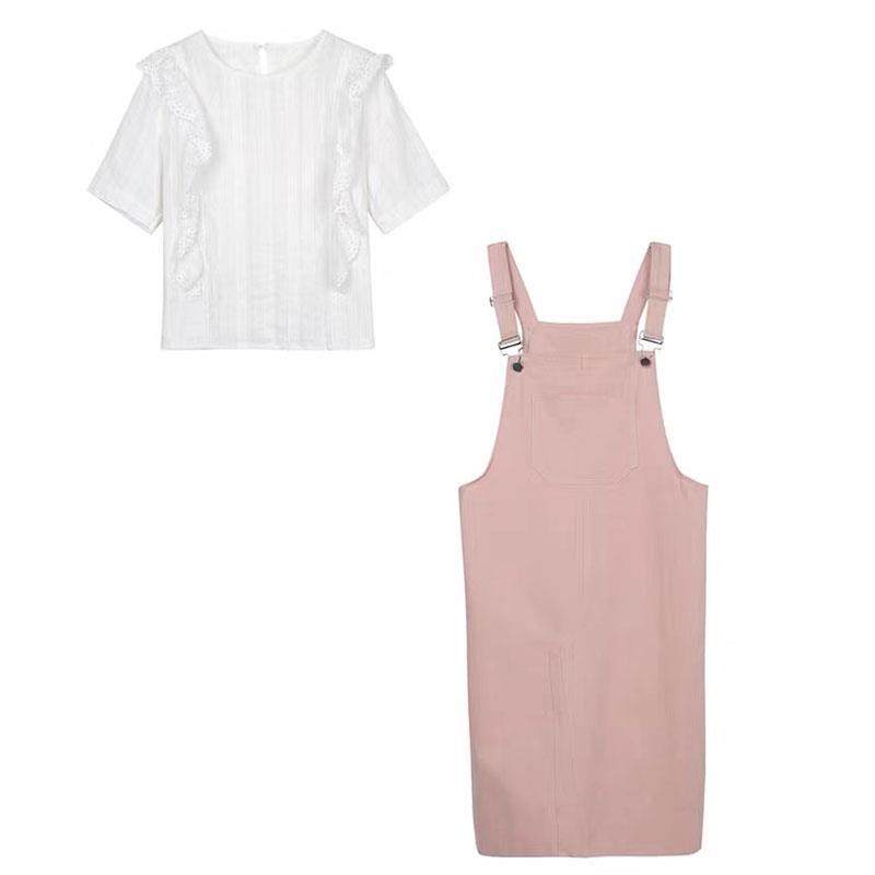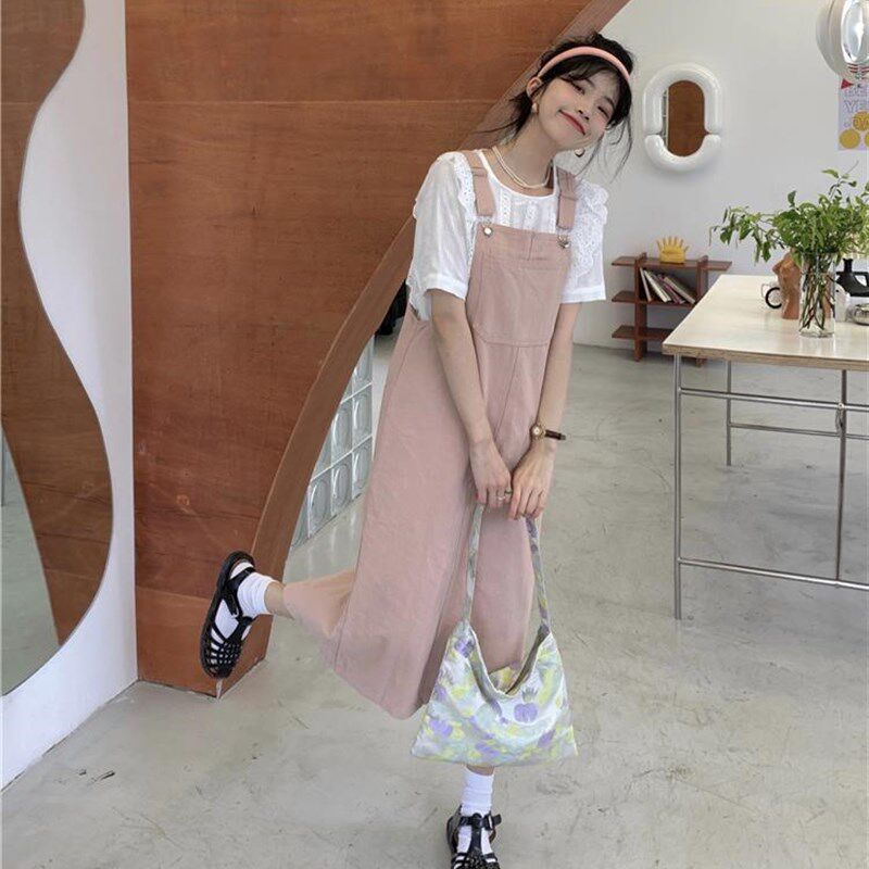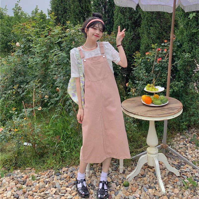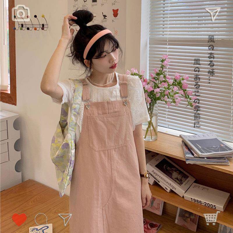 春秋桔梗茶系奶甜牛仔背带连衣裙女夏季两件套装洋气粉色长款裙子