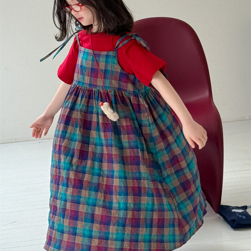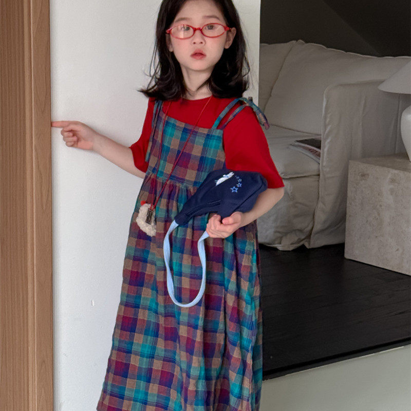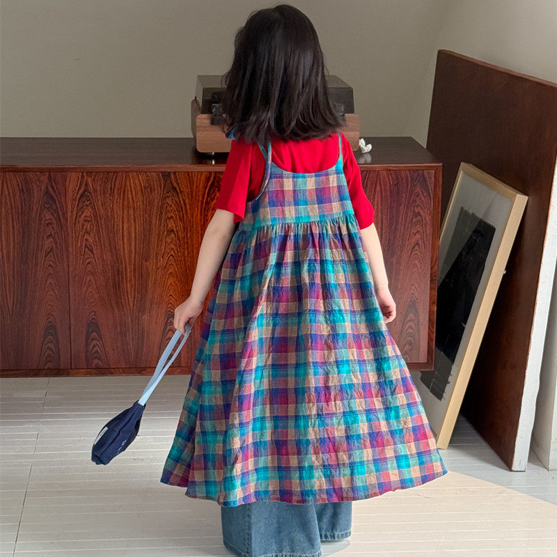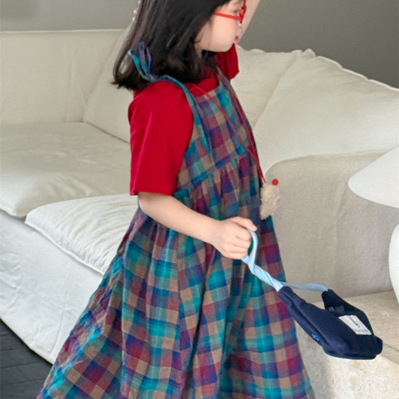 女童韩版彩色格子吊带裙夏季新品儿童休闲宽松连衣裙内搭红色T恤