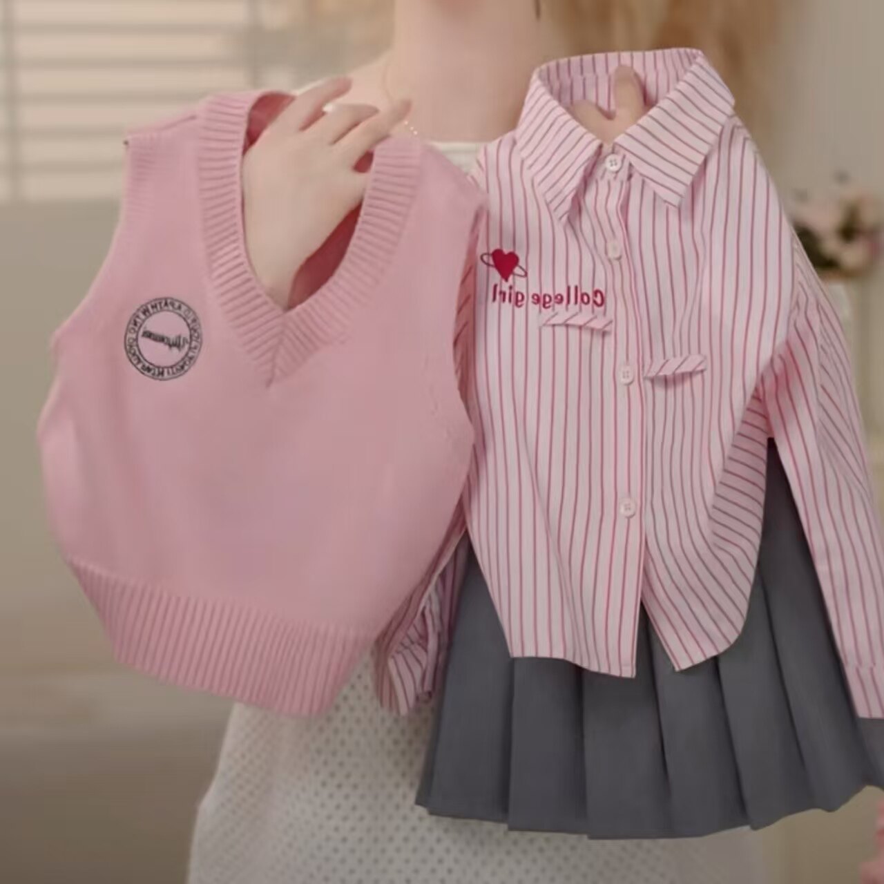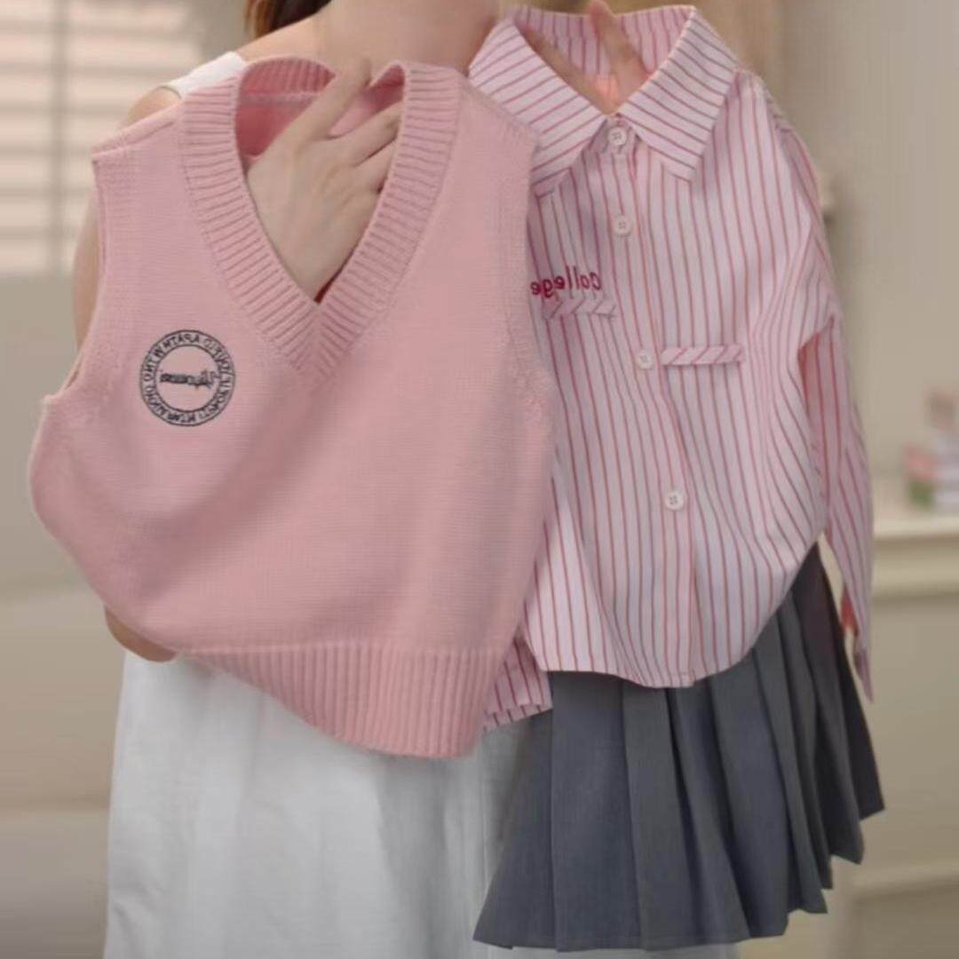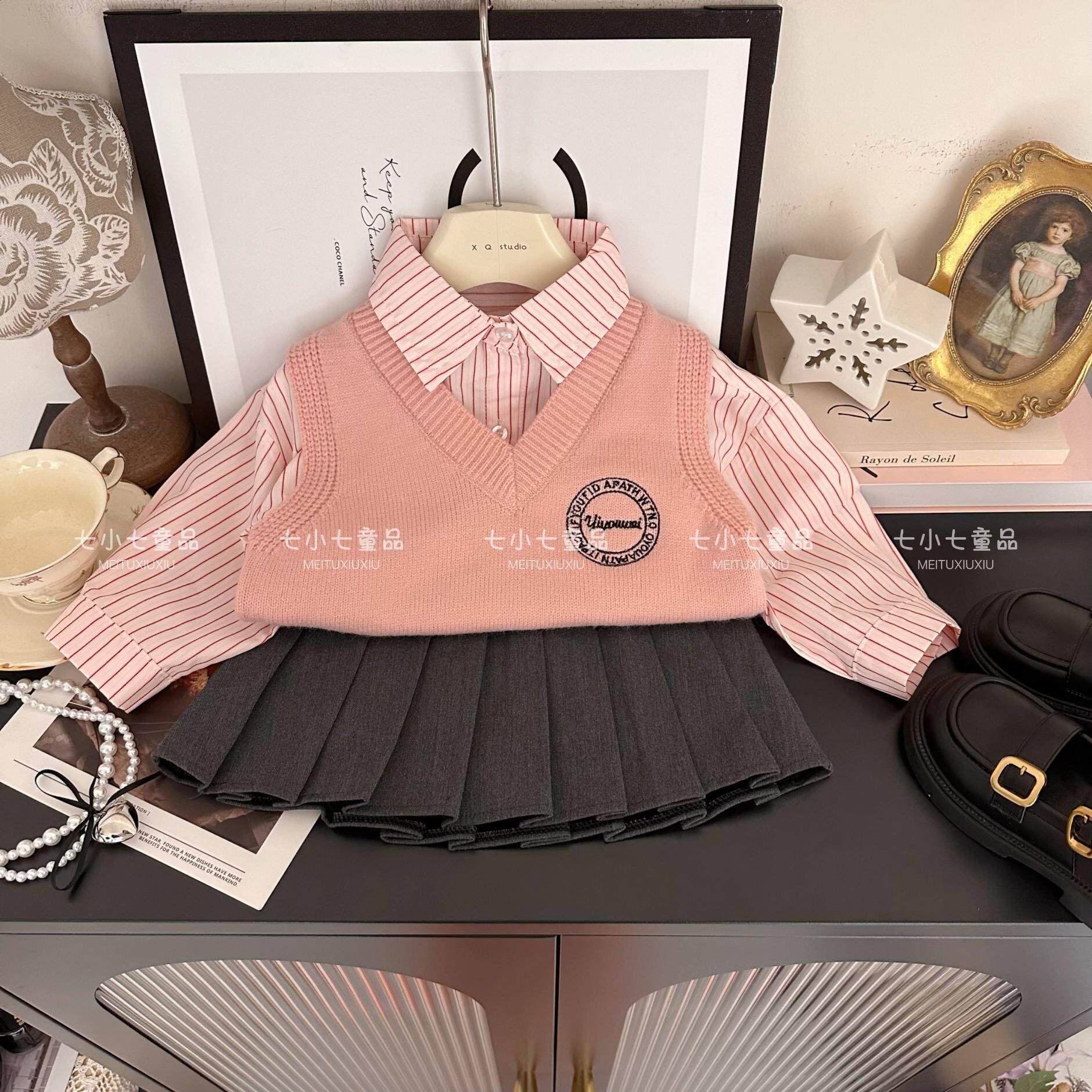 女童套装2026秋季新款儿童韩版粉色衬衫刺绣马甲毛衣百褶裙三件套