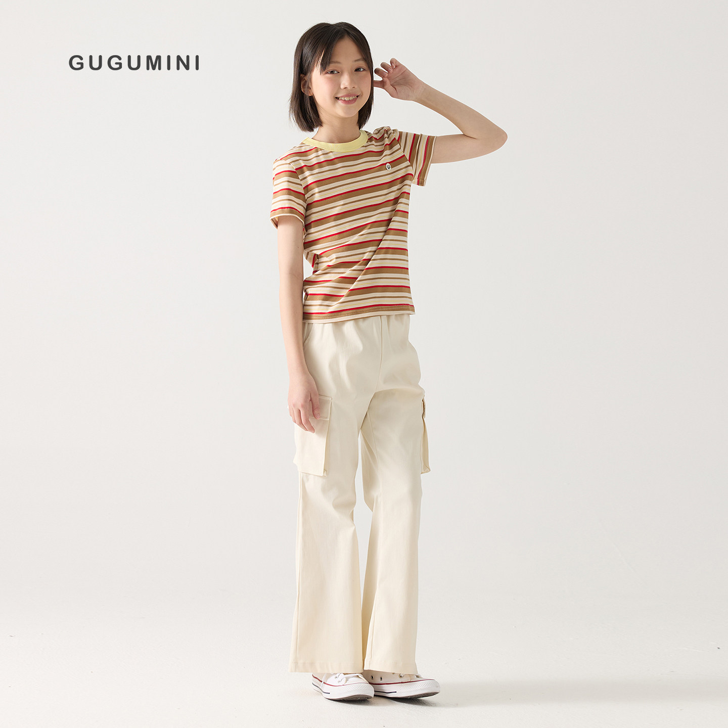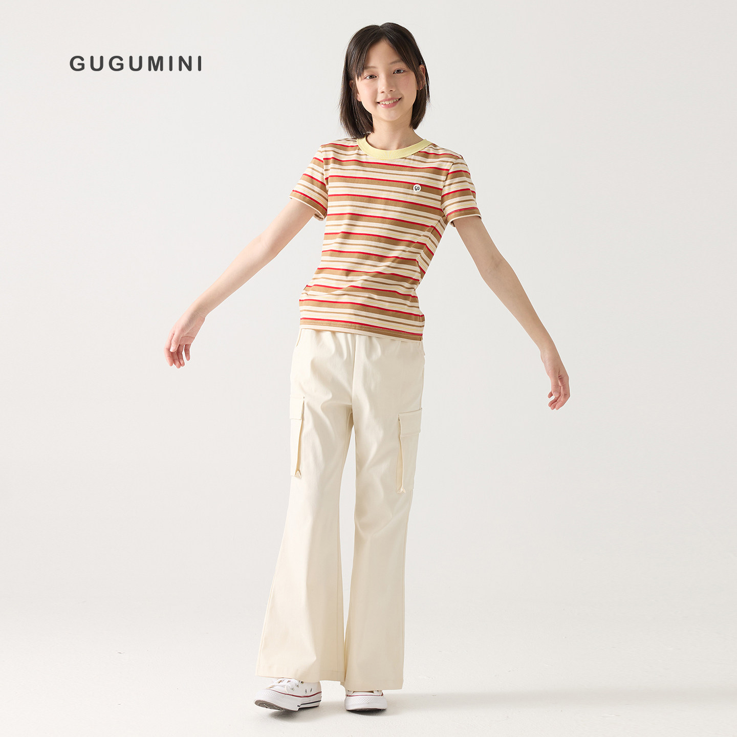 gugumini童装2026春夏女童全棉透气舒适经典百搭彩色条纹短袖T恤