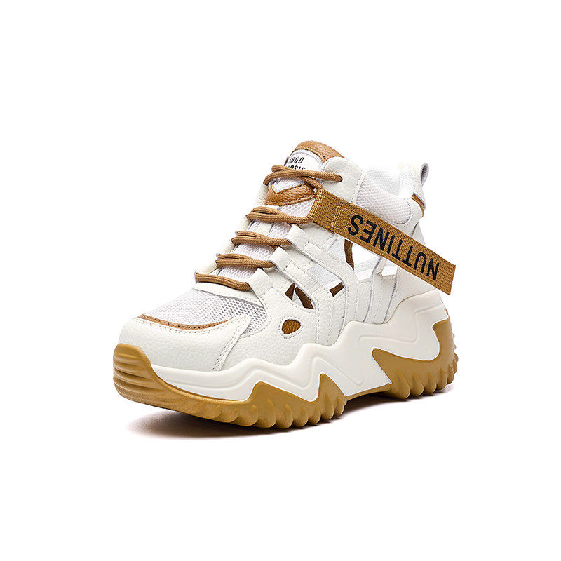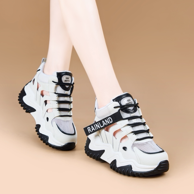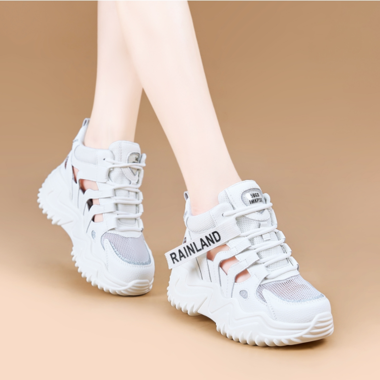 隐形内增高小白鞋真皮网面透气镂空老爹鞋女夏季厚底运动休闲凉鞋