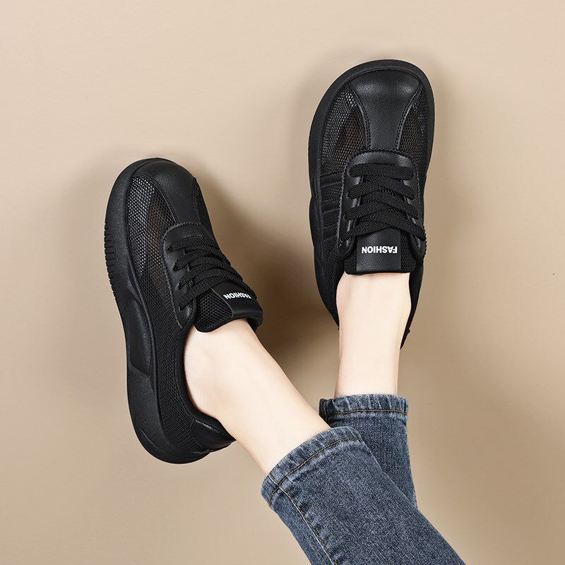 全黑色透气工作鞋女夏季久站不累脚软底网面运动鞋防滑餐饮厨房鞋