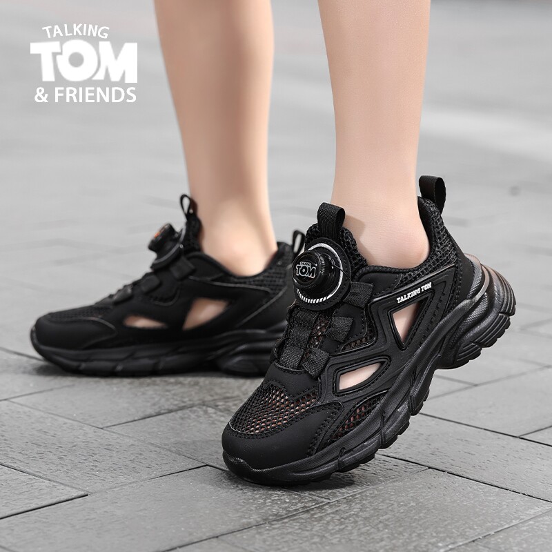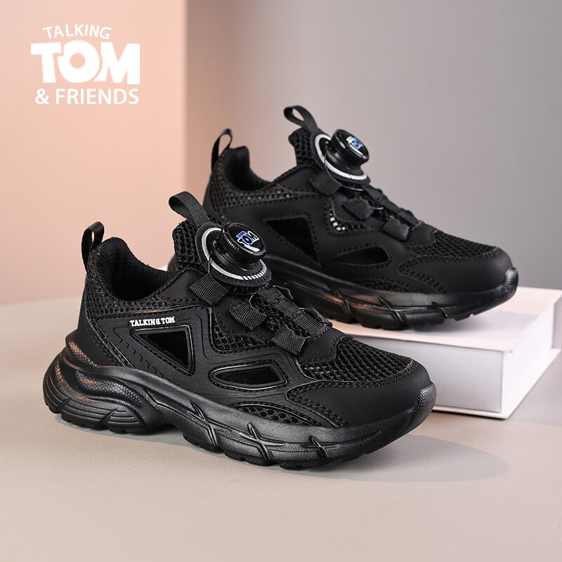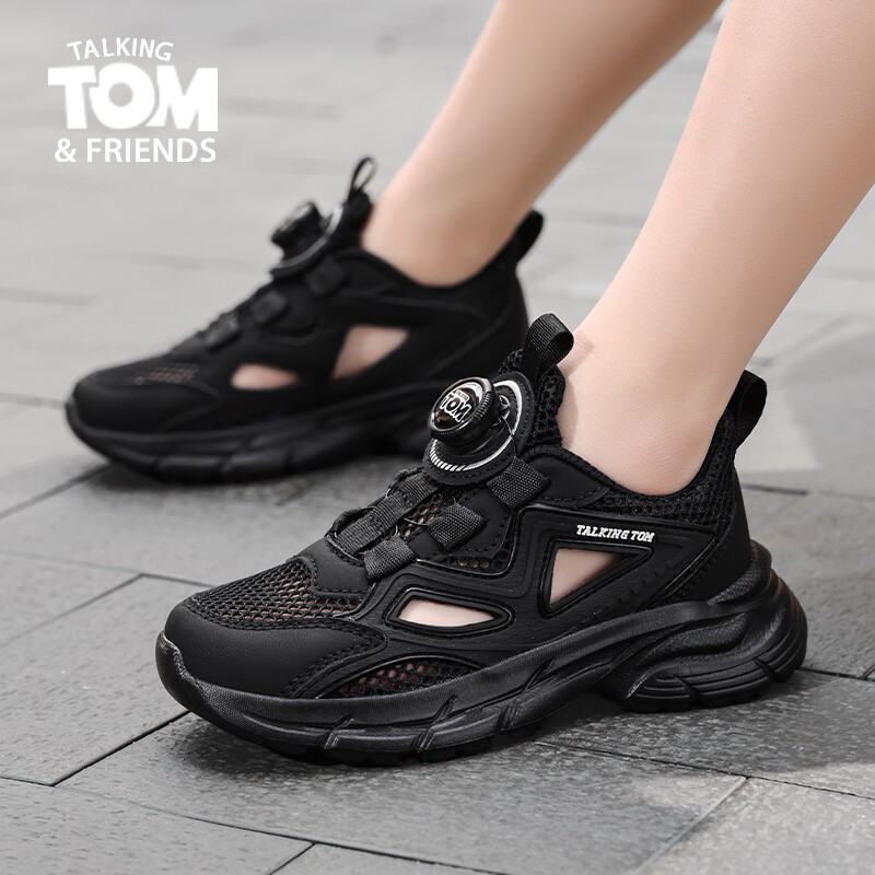 汤姆猫男童黑色运动鞋春夏季透气单网面镂空女孩子软底跑步小黑鞋