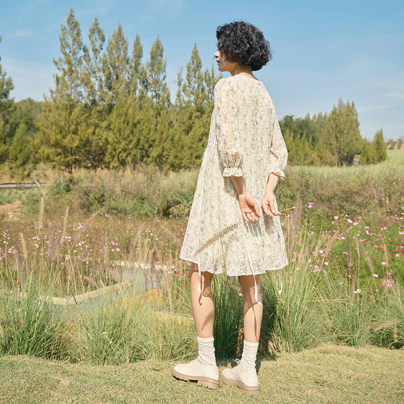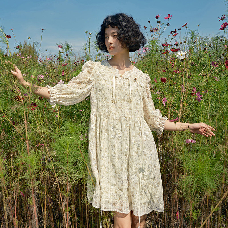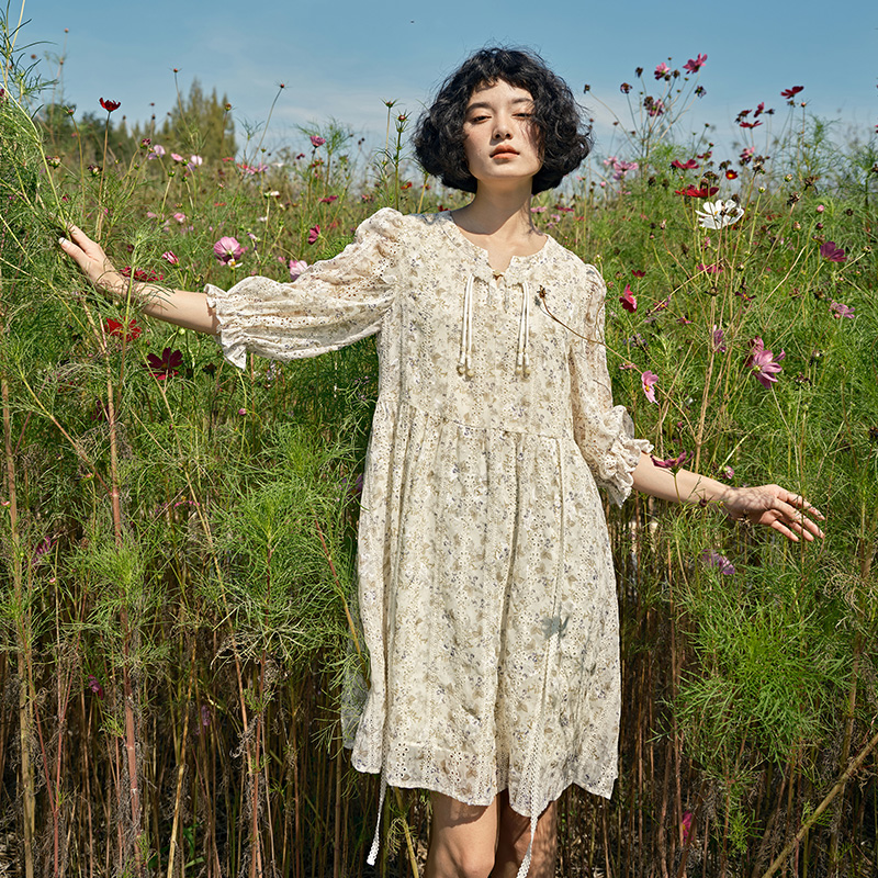 PIT复古V领长袖碎花连衣裙2025春季新款法式仙女风慵懒显瘦长裙