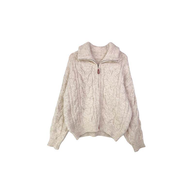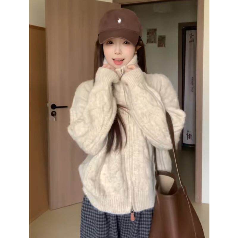 高领麻花拉链开衫毛衣女款2026新款春秋季加厚慵懒风立领针织外套