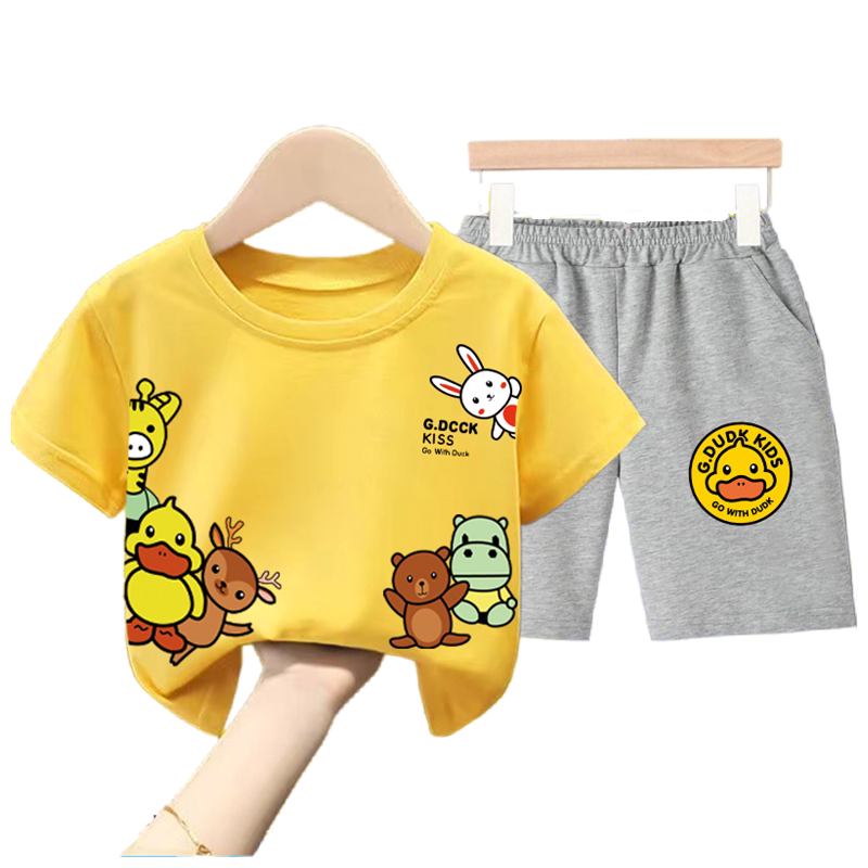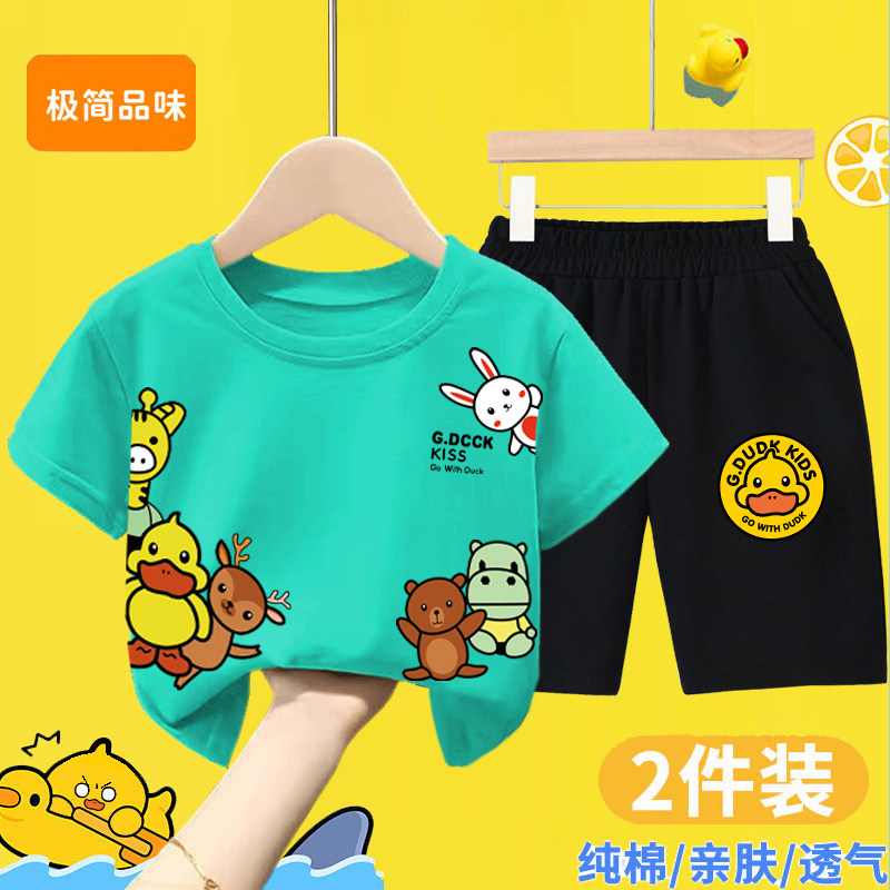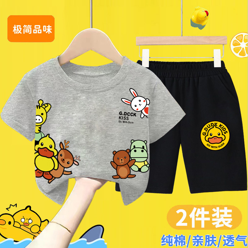 男童女童夏季套装宝宝纯棉短袖T恤2026新款儿童小黄鸭短裤两件套