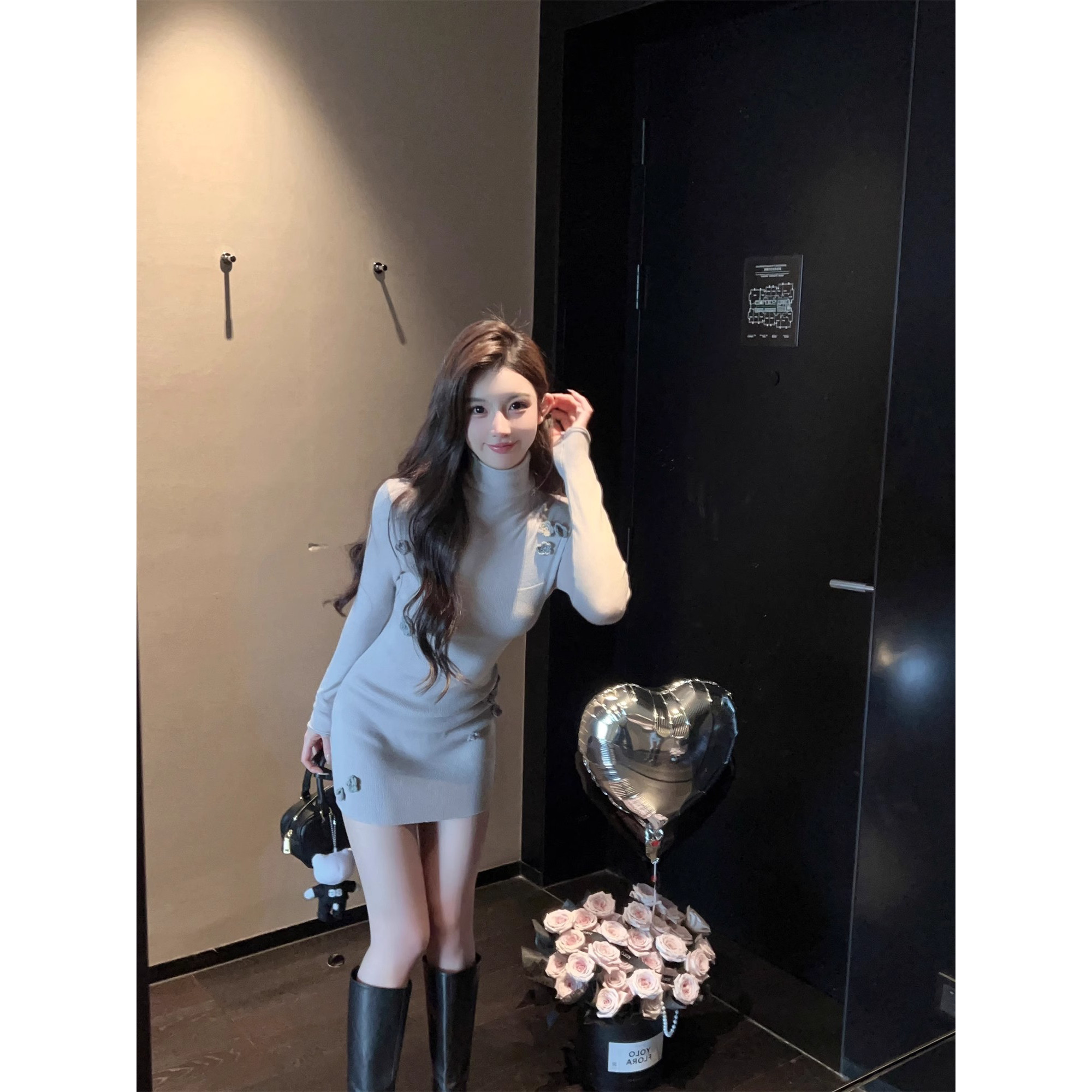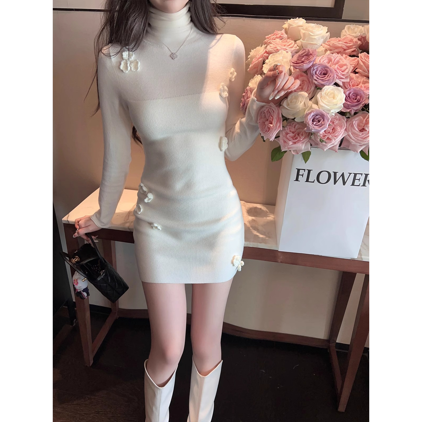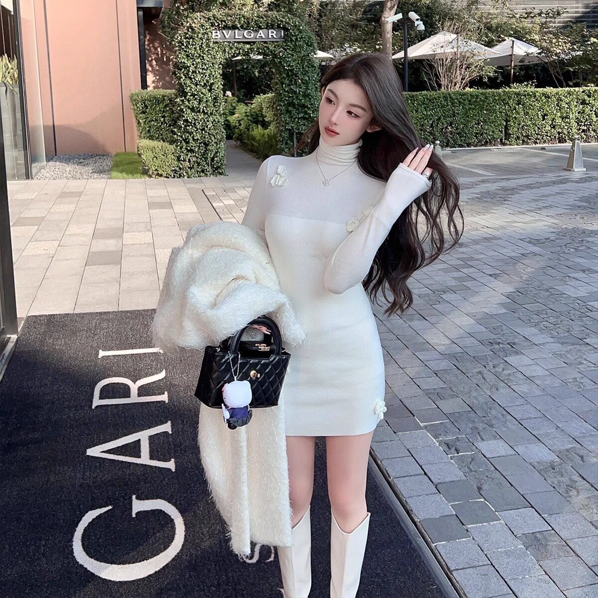 韩国FairyJiang 秋冬新款白色高领针织连衣裙短款修身包臀毛衣裙