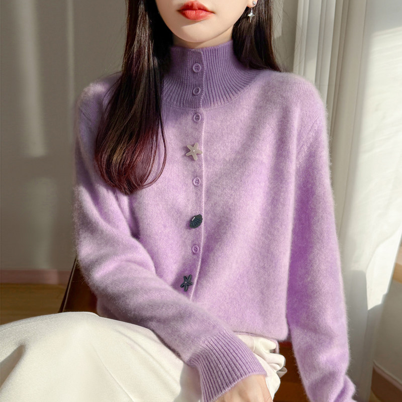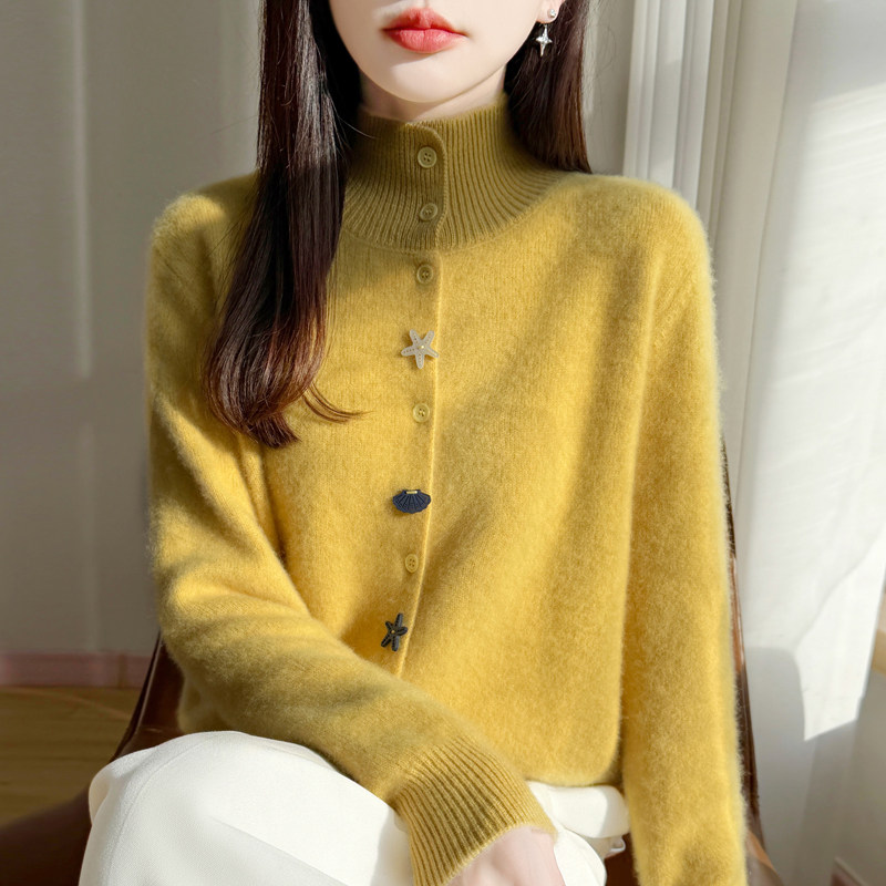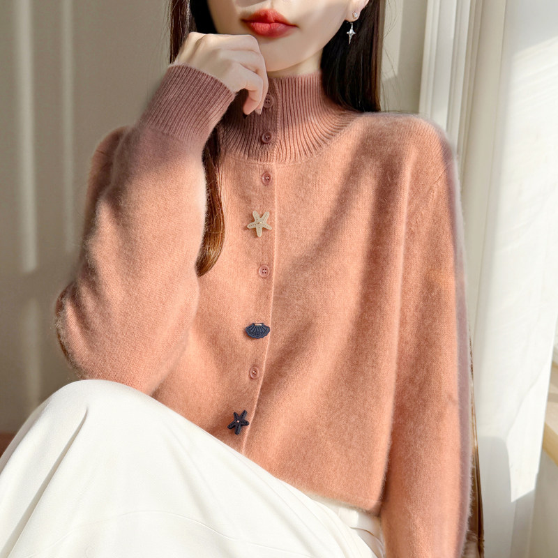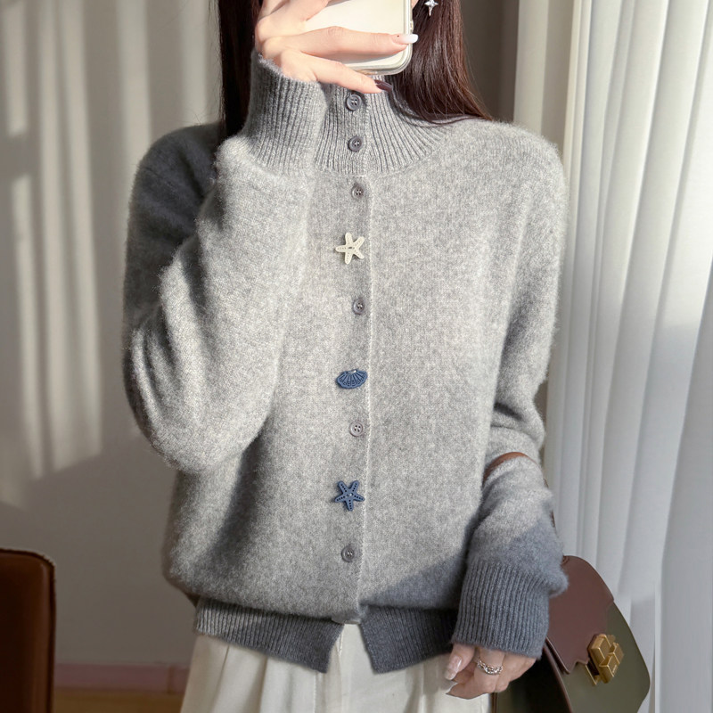 2026秋冬高领精纺羊毛开衫女加厚卡通纽扣针织毛衣宽松羊绒衫外套