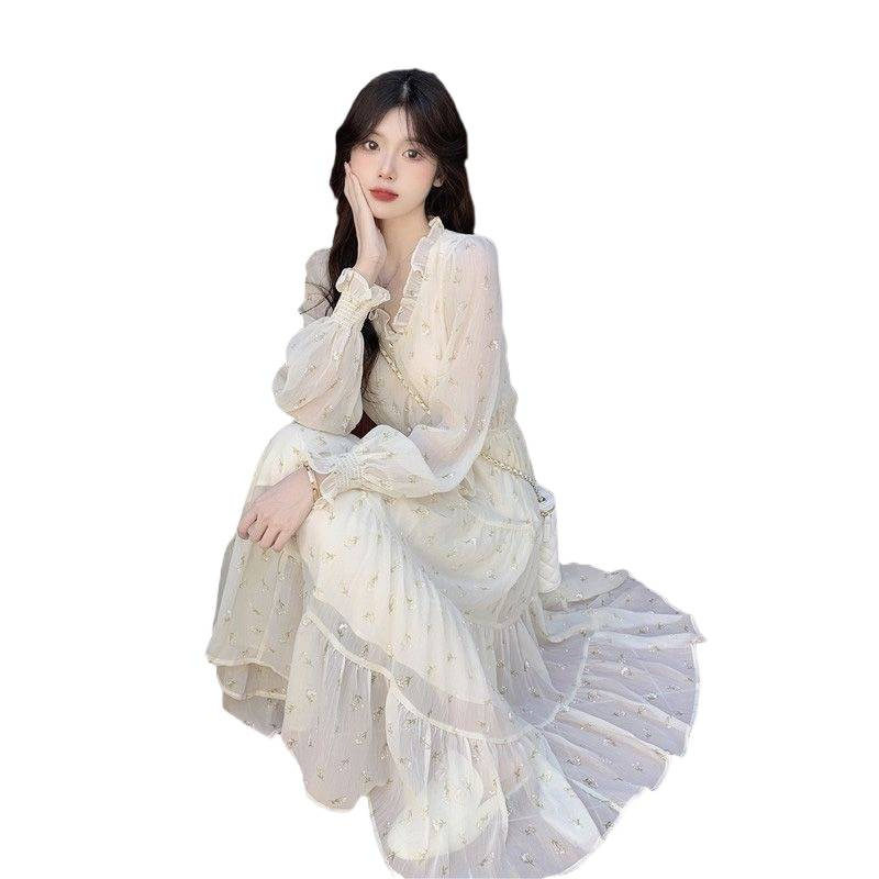 夏季2026新款女法式温柔风长袖蛋糕连衣裙春季长款感小众显瘦裙子