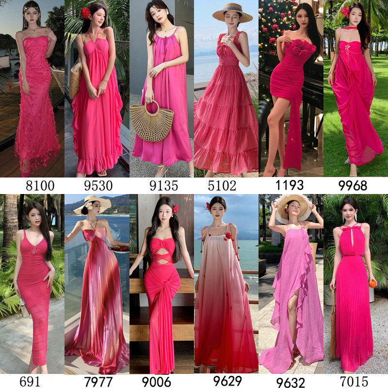 火龙果玫红粉色显瘦露背沙滩裙女夏季新款三亚海边旅游度假连衣裙