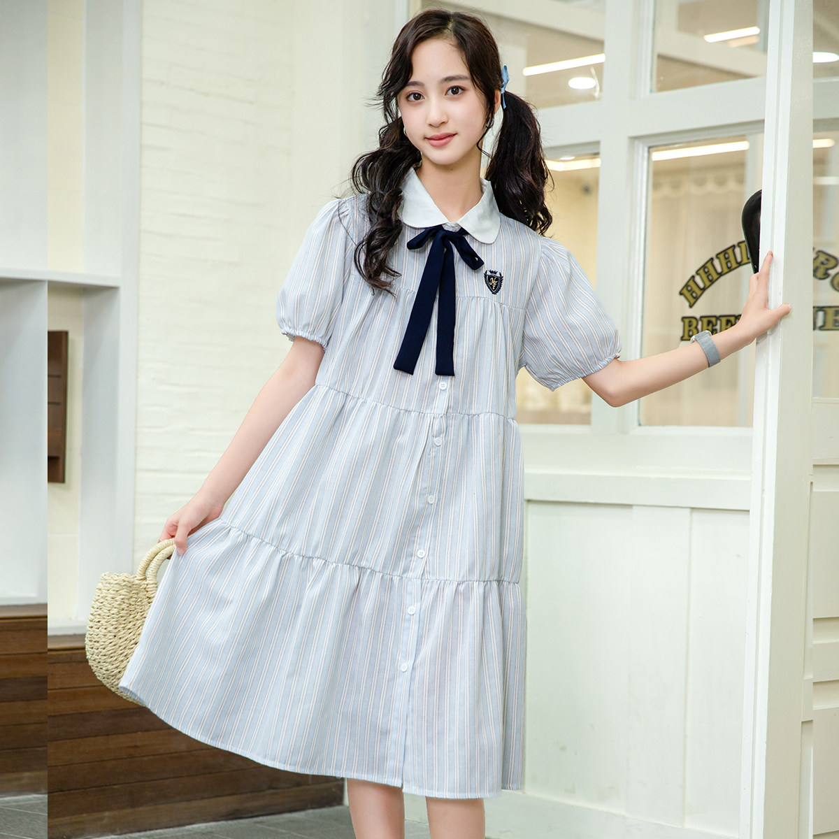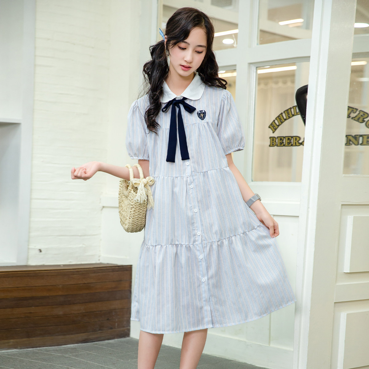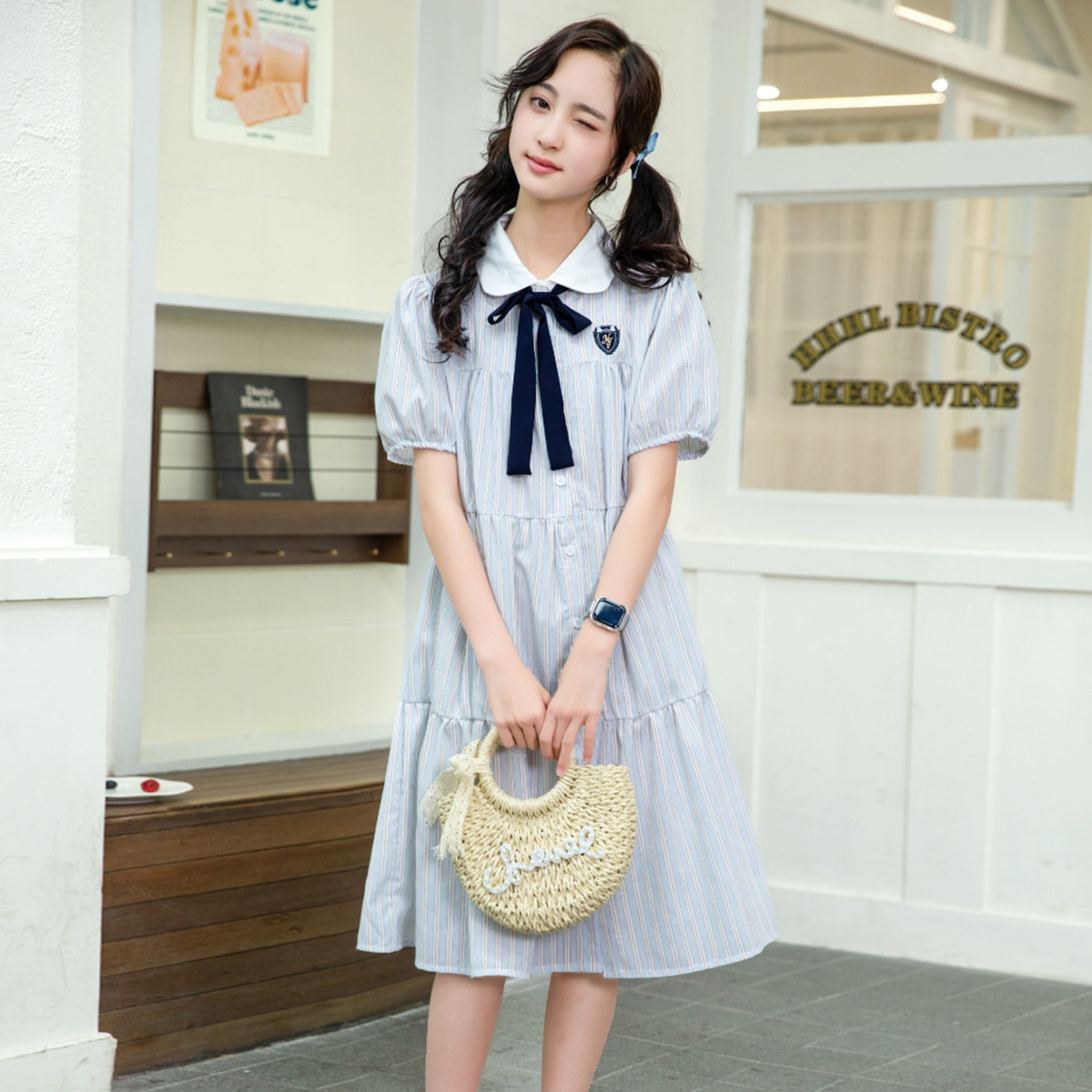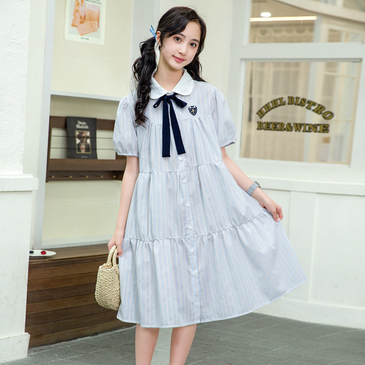 古力家夏季甜美学院风蝴蝶结衬衫连衣裙女大童初中生条纹蛋糕裙15