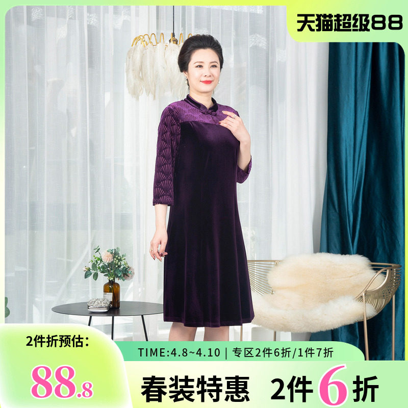 依佈中老年女士连衣裙2026春装新款丝绒礼服裙妈妈装高腰显瘦裙子