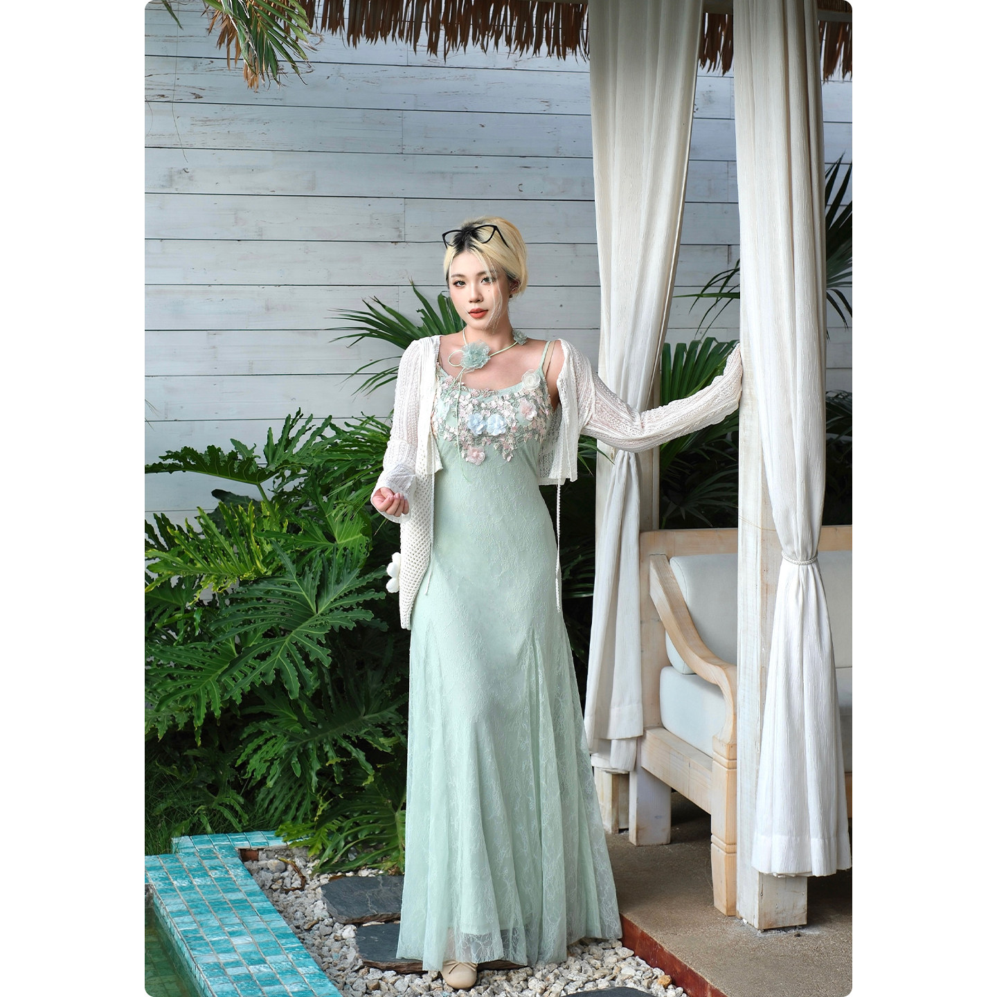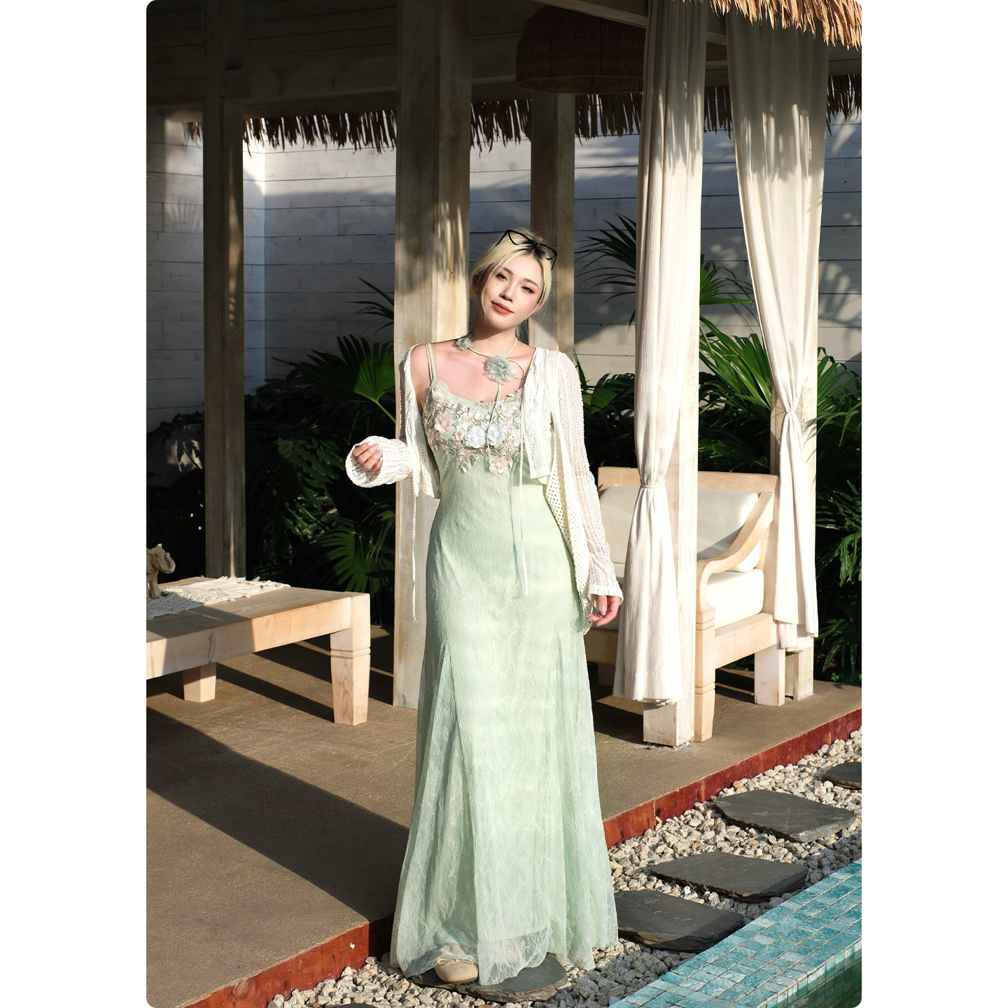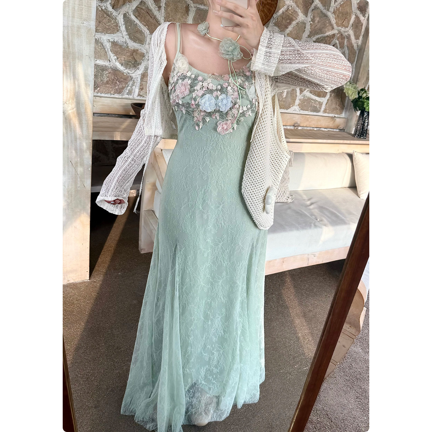 糯米子[绿境花灵]法式蕾丝吊带连衣裙女夏海边度假风微胖大码裙子