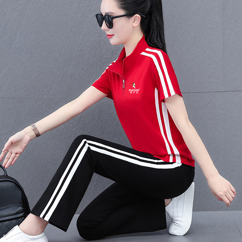 啄木鸟短袖运动套装女夏季2026新款中年妈妈时尚广场舞休闲两件套