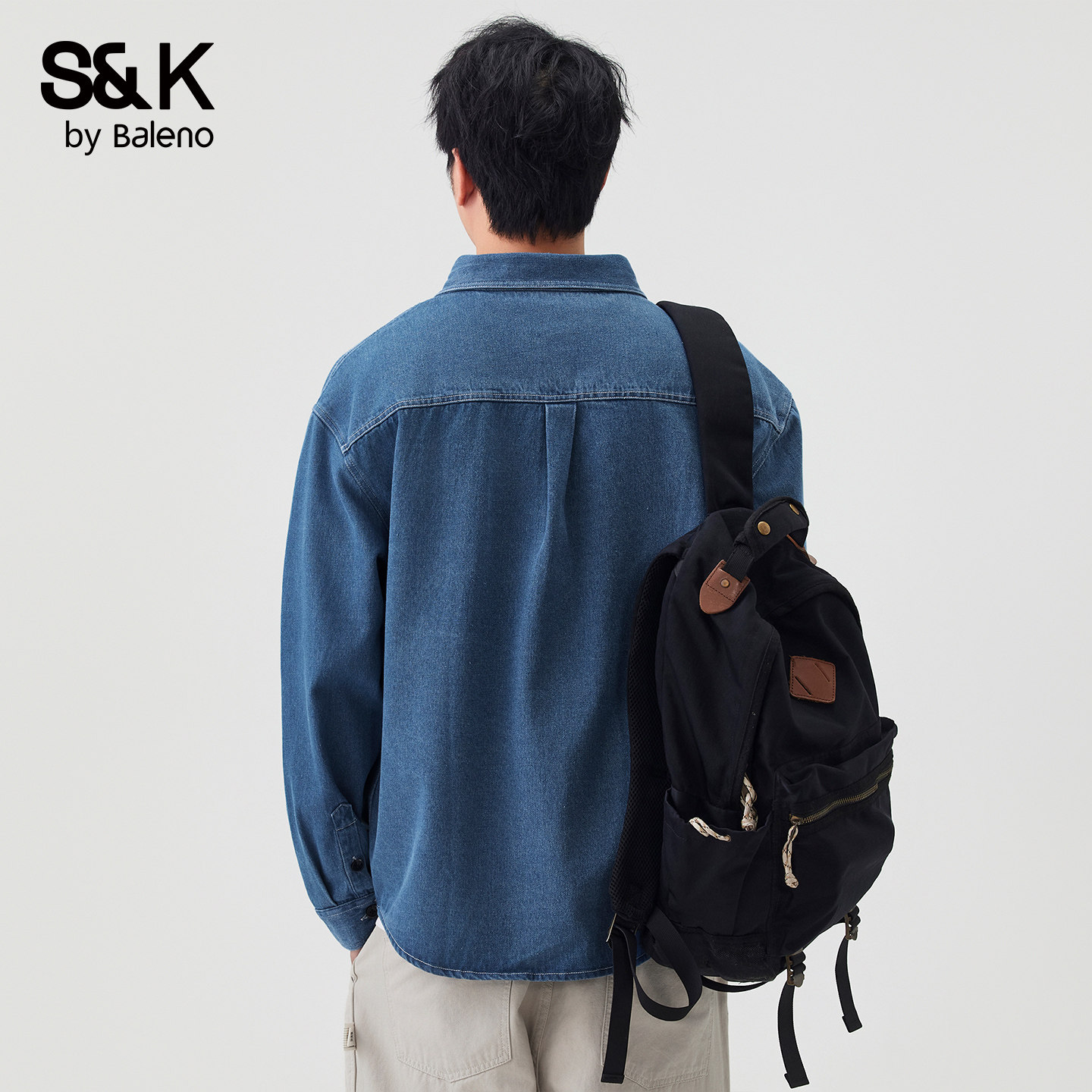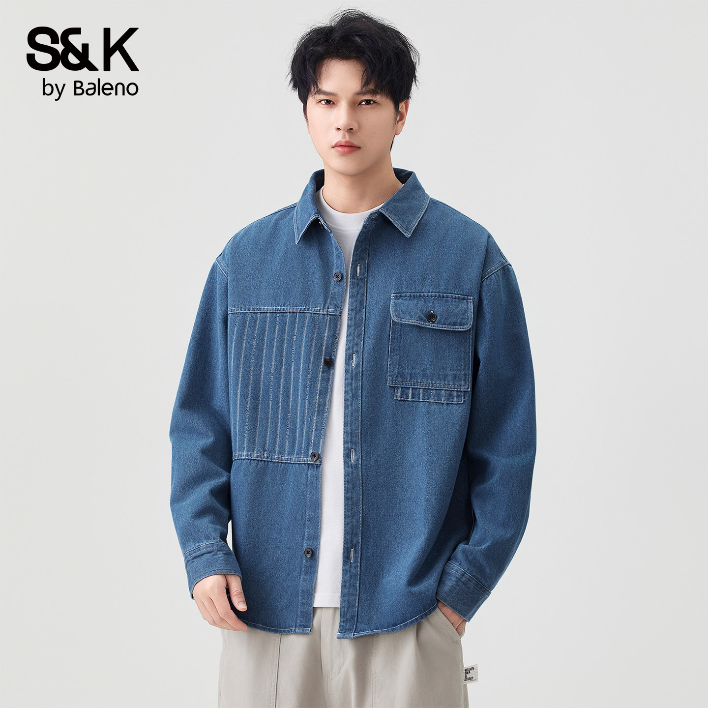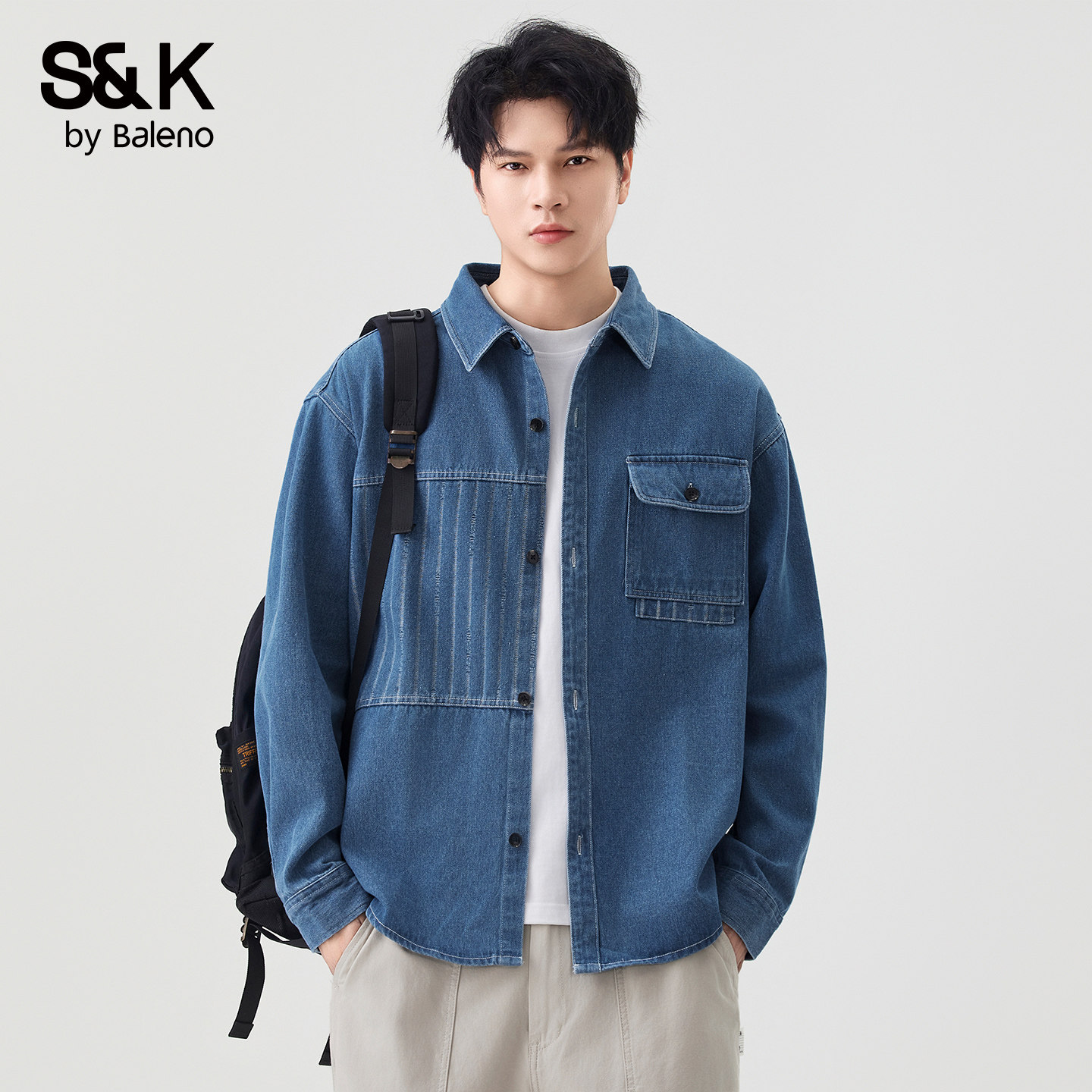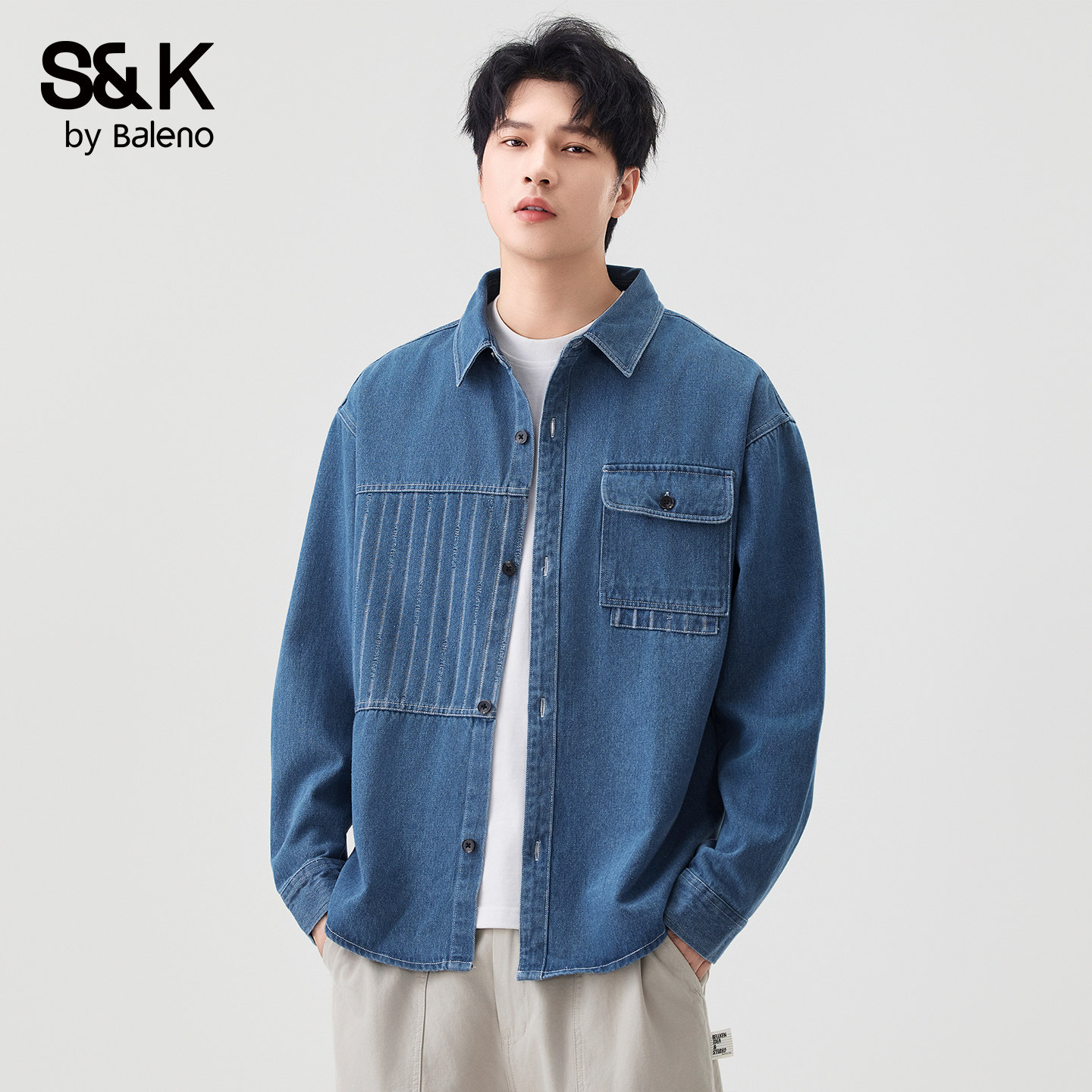 班尼路SK牛仔衬衫男款2026春夏纯棉长袖衬衣外套男工装蓝色上衣YS