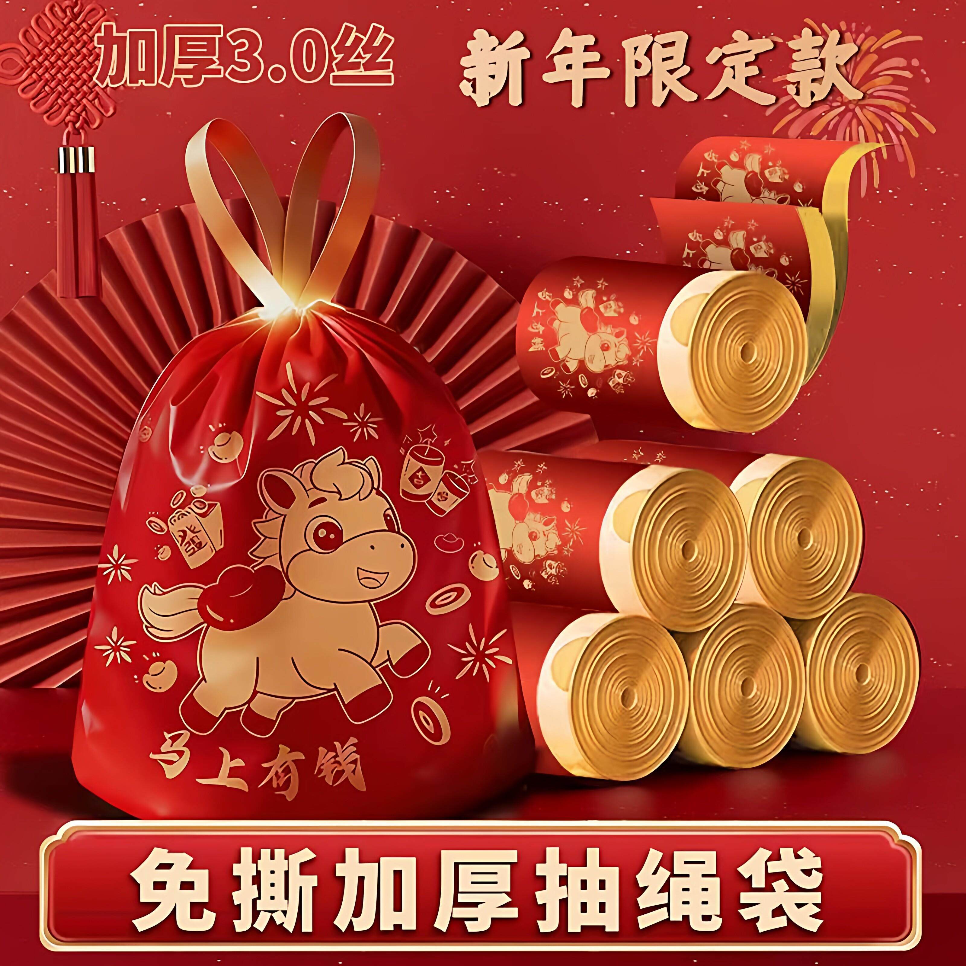 新年垃圾袋家用加厚手提式免撕大号抽绳超厚厨房用马年红色清洁袋
