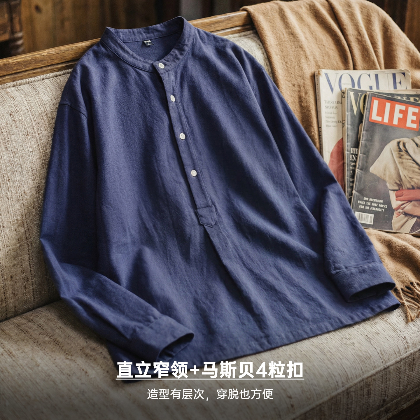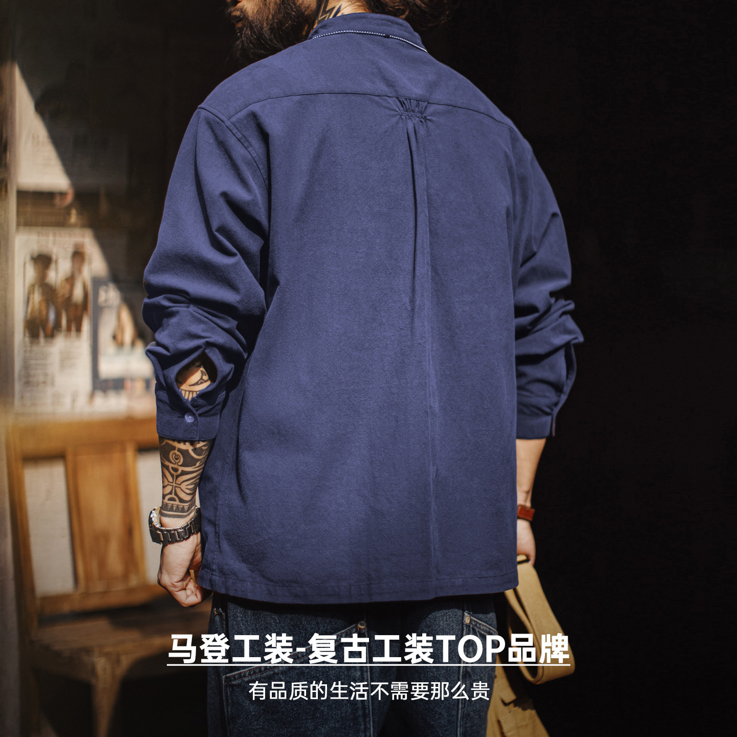 马登工装美式复古小立领长袖衬衫藏青色外穿纯棉半高领T恤男款春