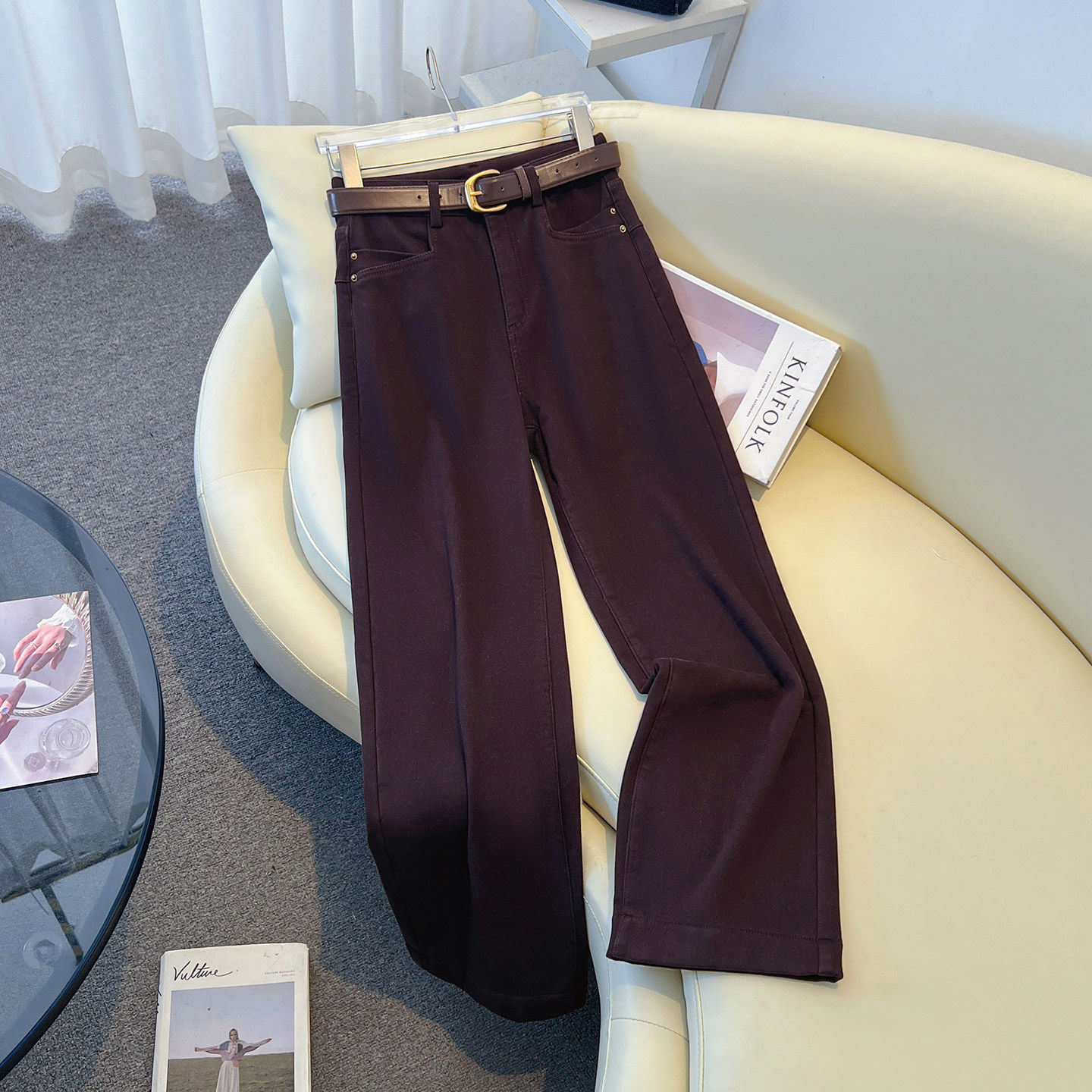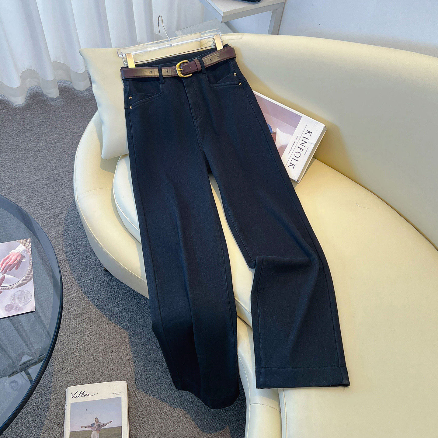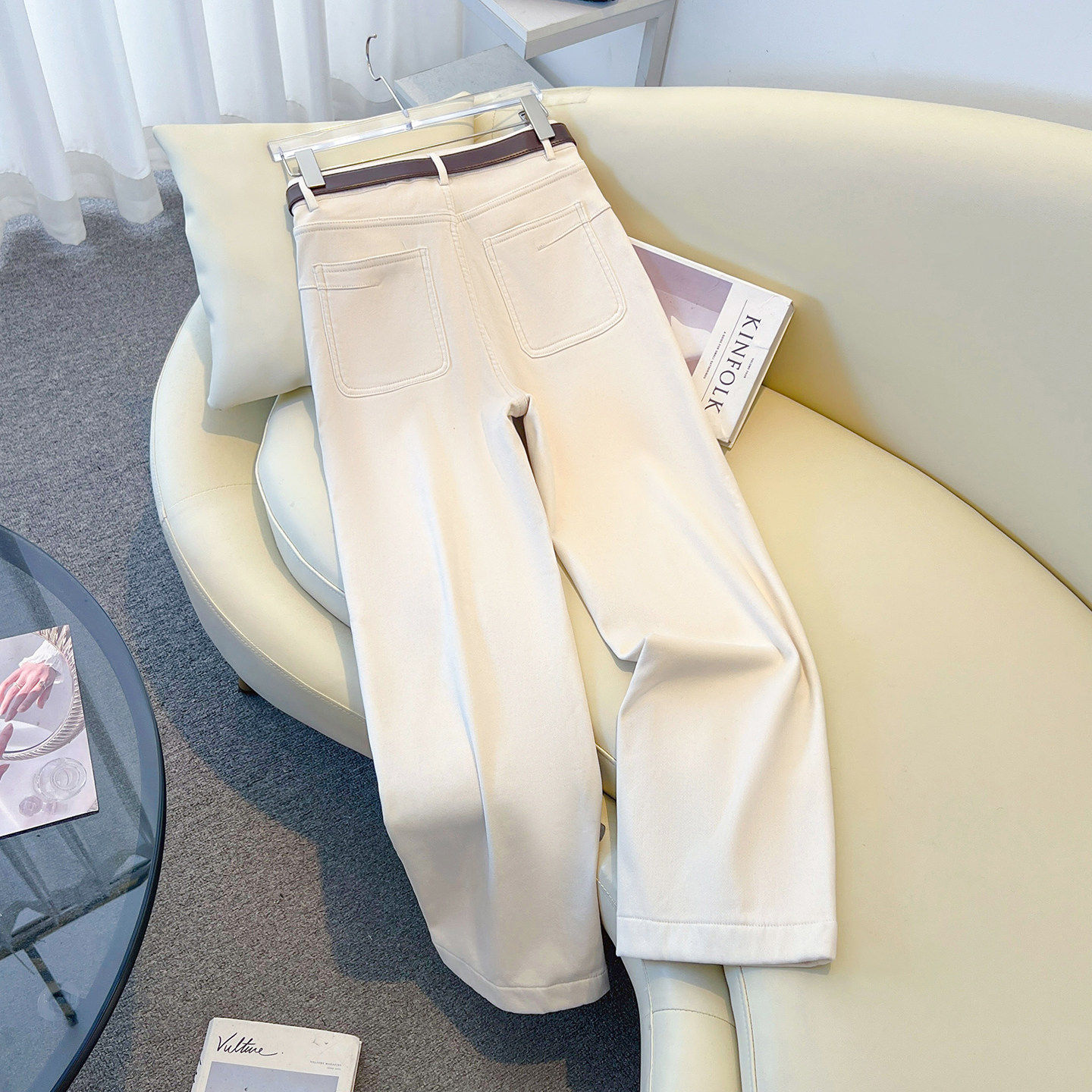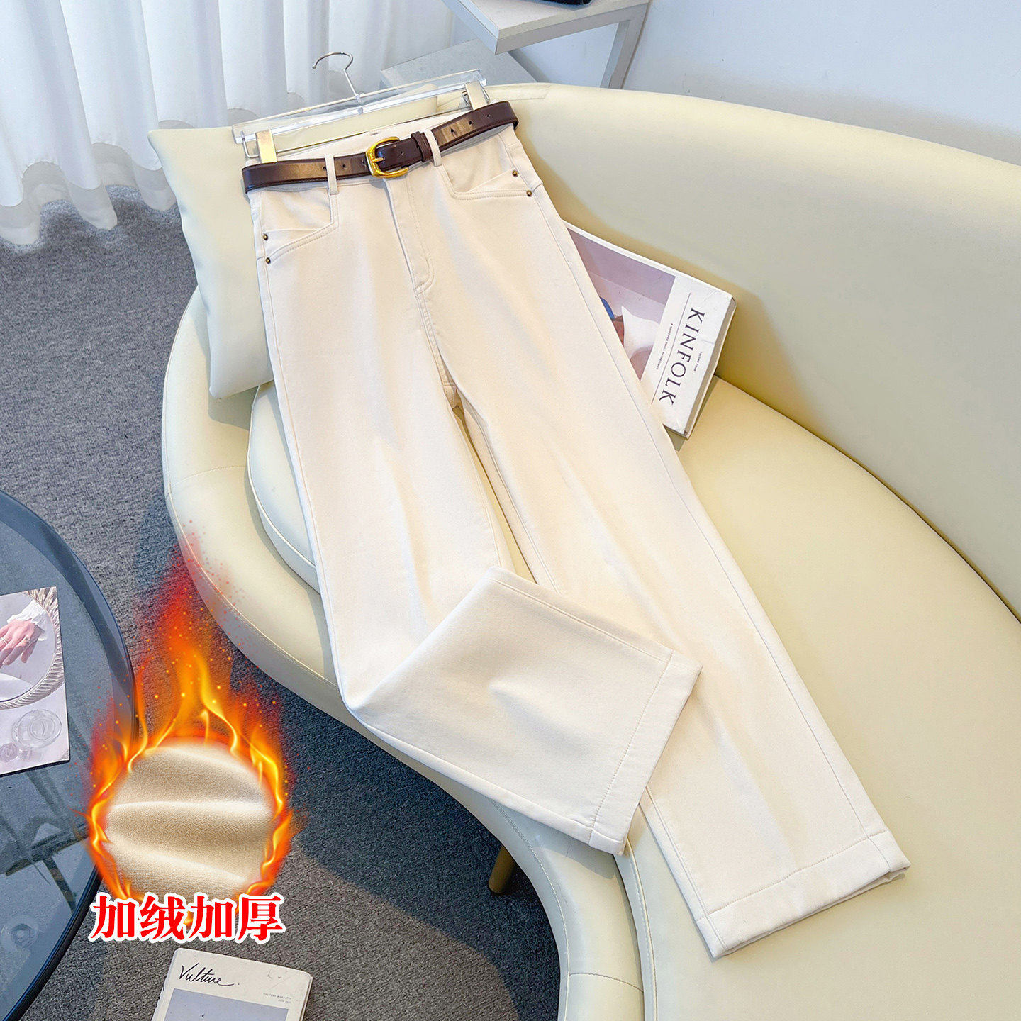 米白色阔腿牛仔裤女春款2026新款小个子高腰显瘦加绒休闲直筒裤子