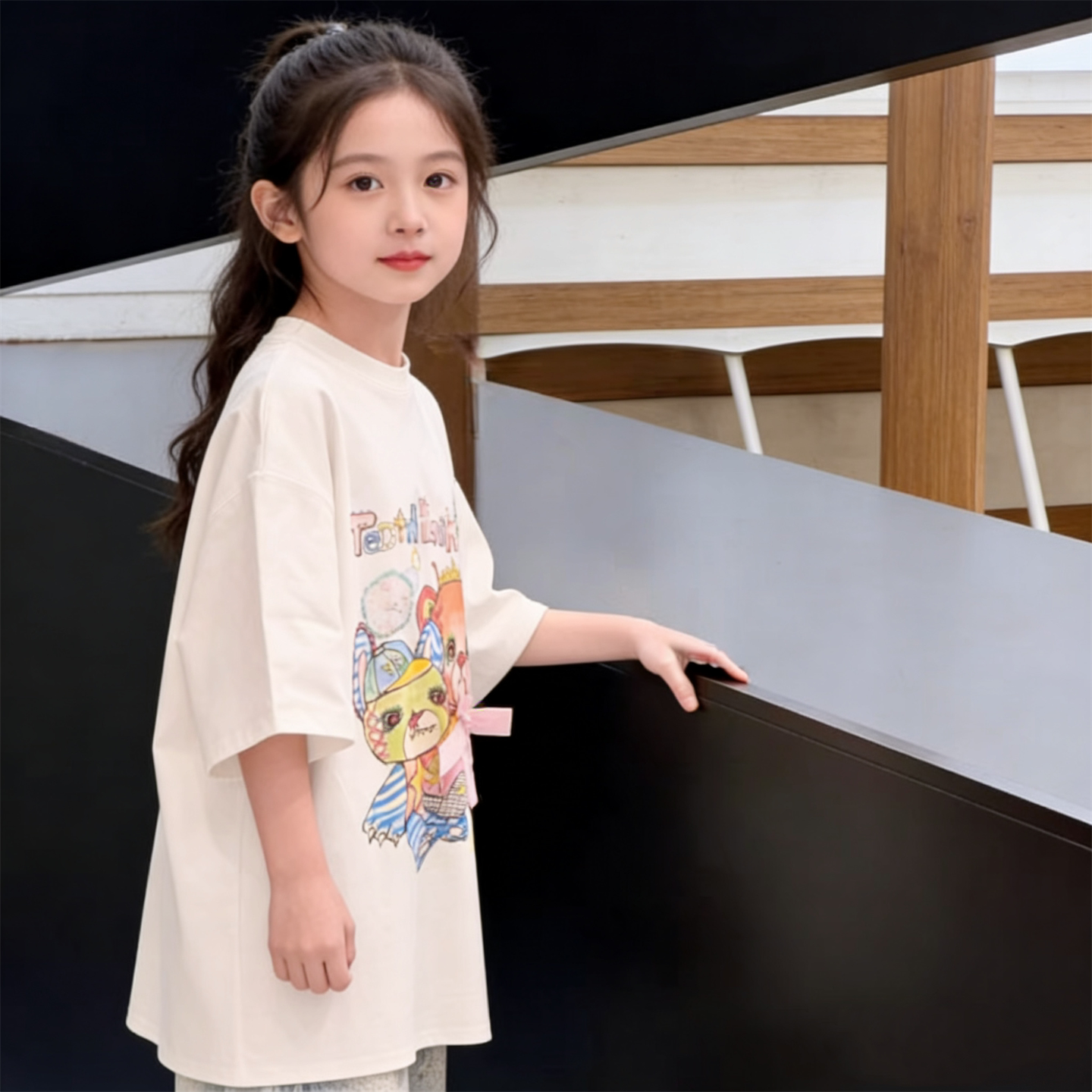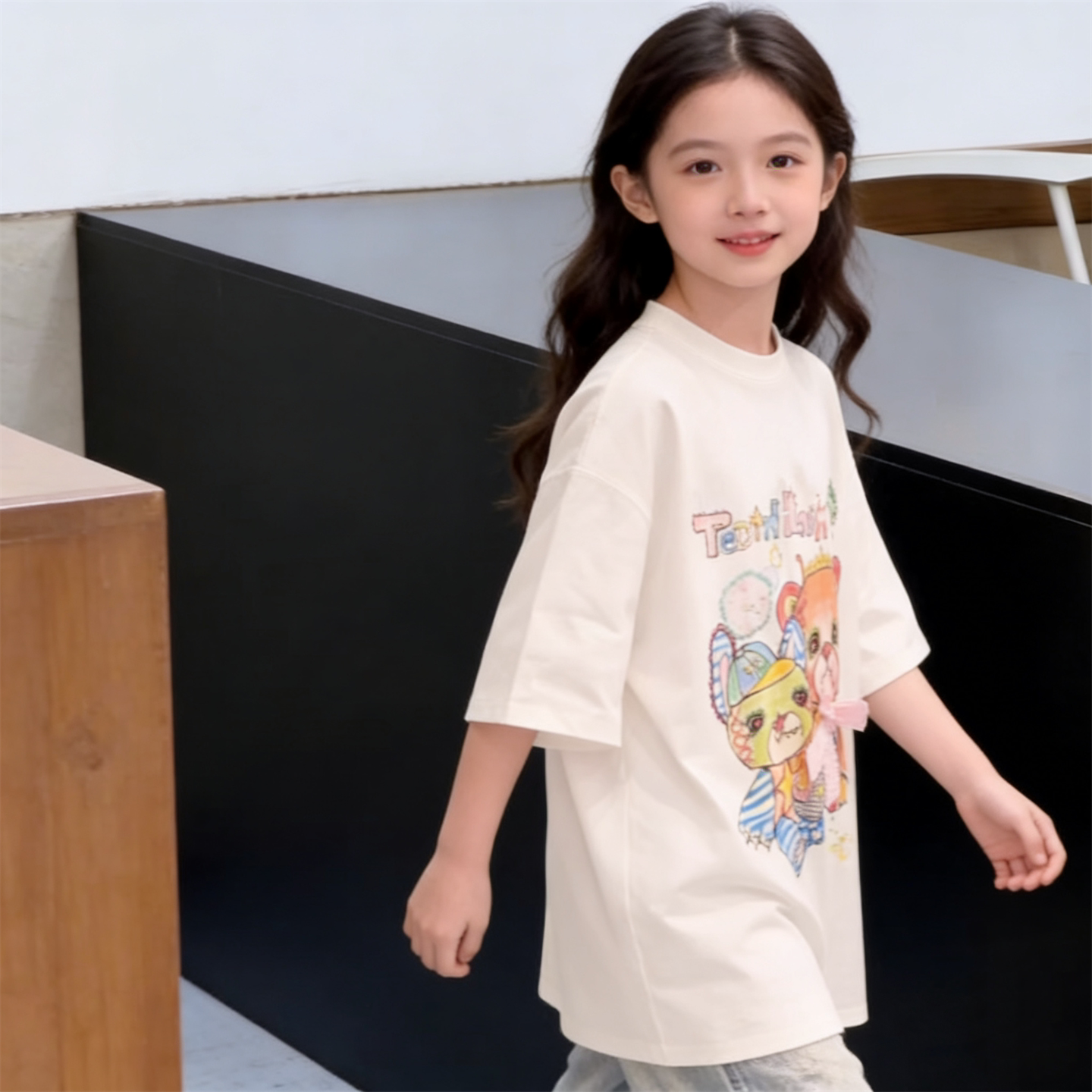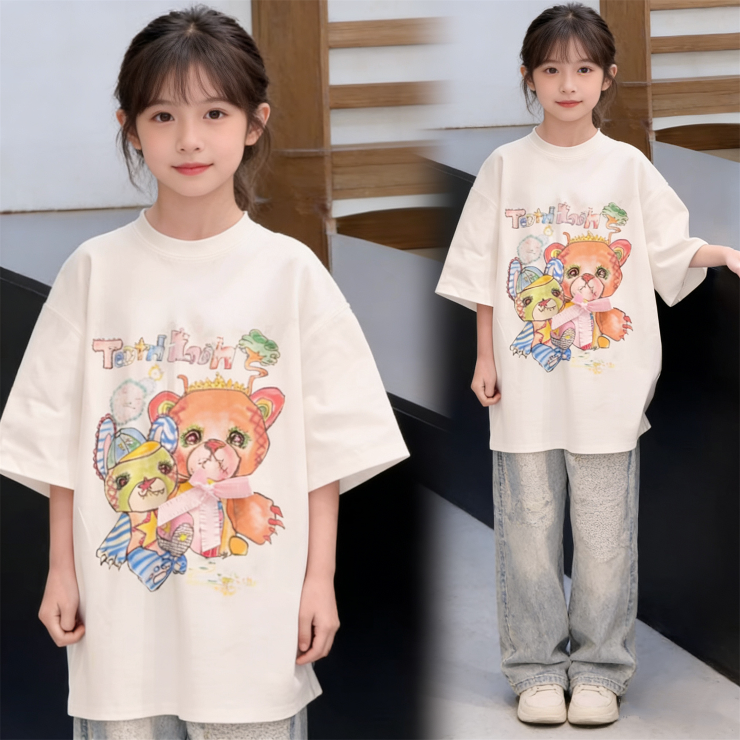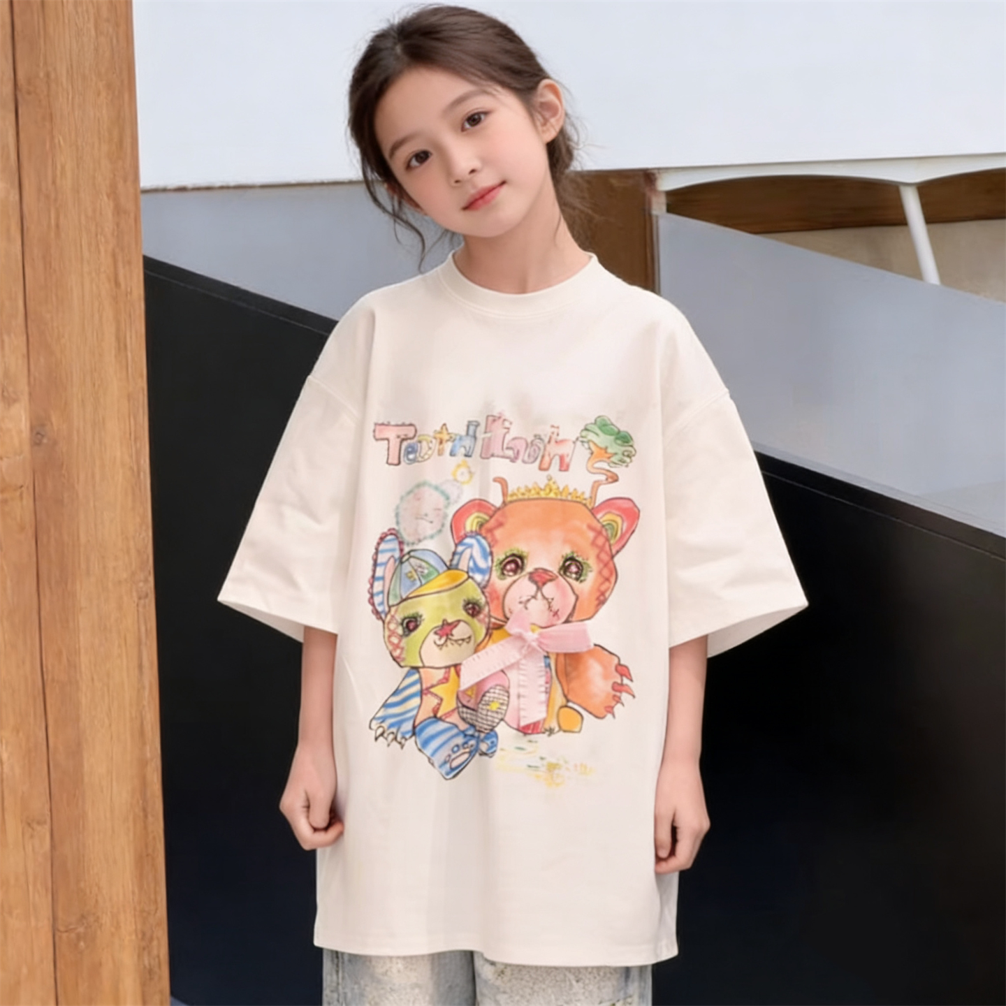 韩版童装夏新款女童潮酷小熊涂鸦宽松圆领休闲短袖T恤上衣打底衫