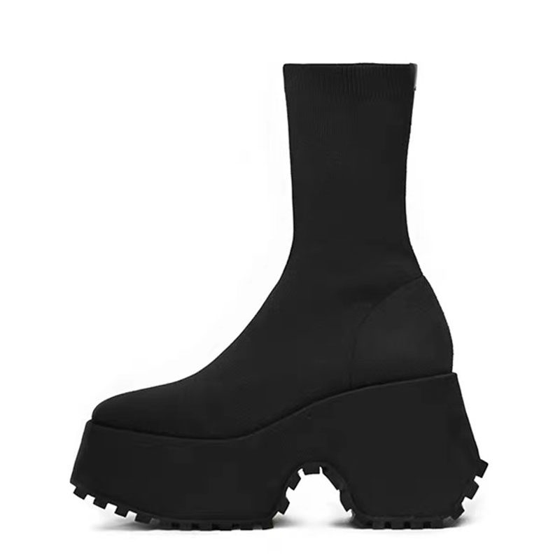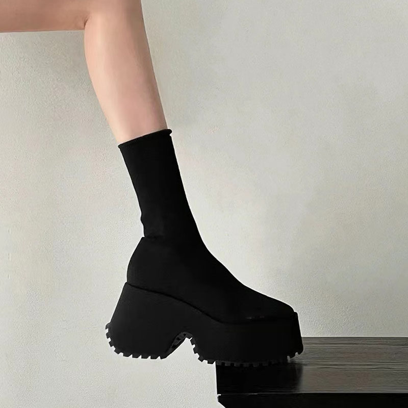 2026春秋新款弹力厚底袜子靴女松糕方头瘦瘦靴小个子增高短靴长靴