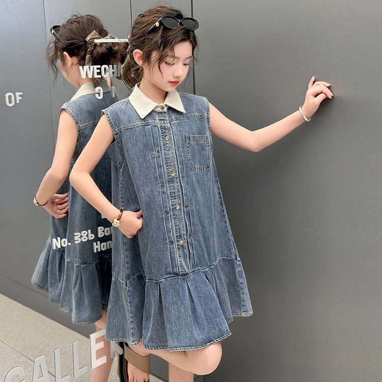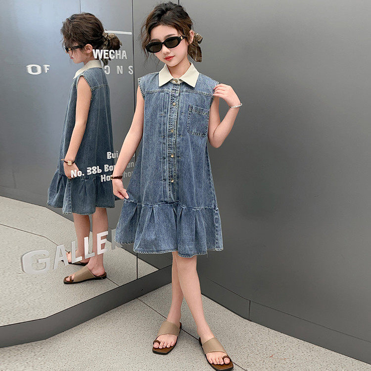 韩版polo领无袖牛仔连衣裙女童夏季A字裙小个子中裙2026透气薄款