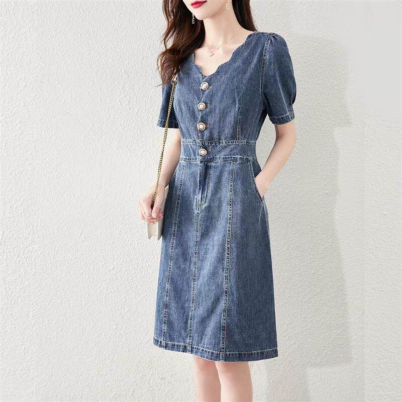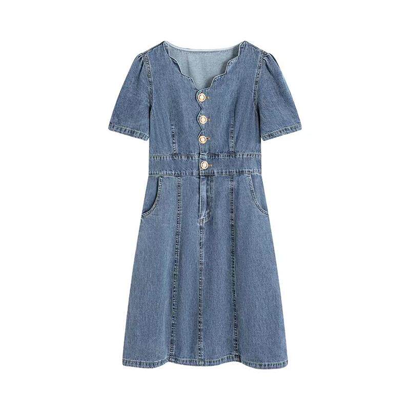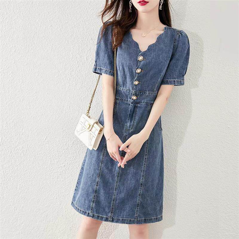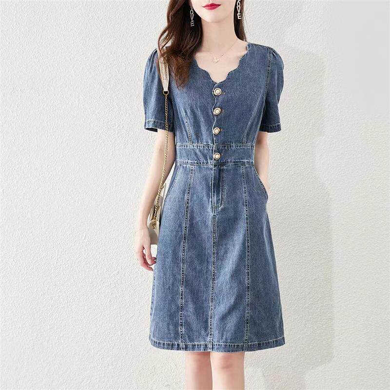 牛仔连衣裙女夏季薄款2024年新款小个子V领收腰显瘦气质别致裙子