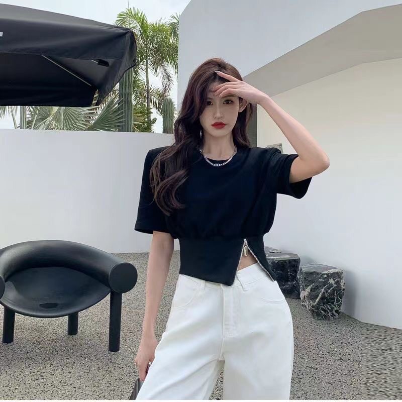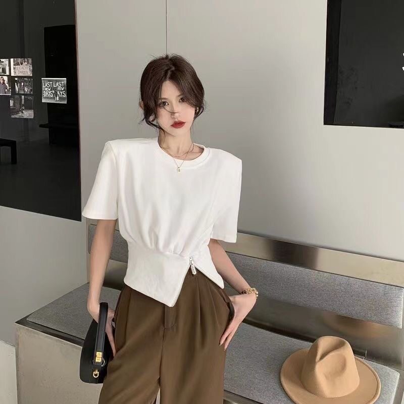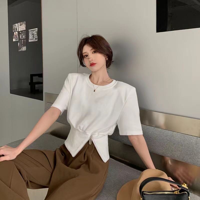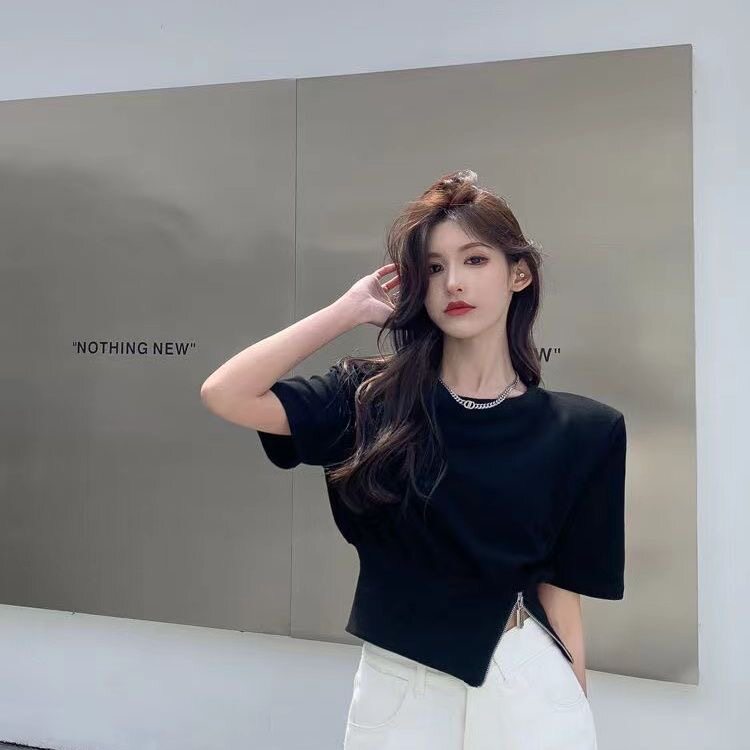 2026新款韩版时尚设计感宽松收腰显瘦拉链开叉短袖T恤女款上衣潮