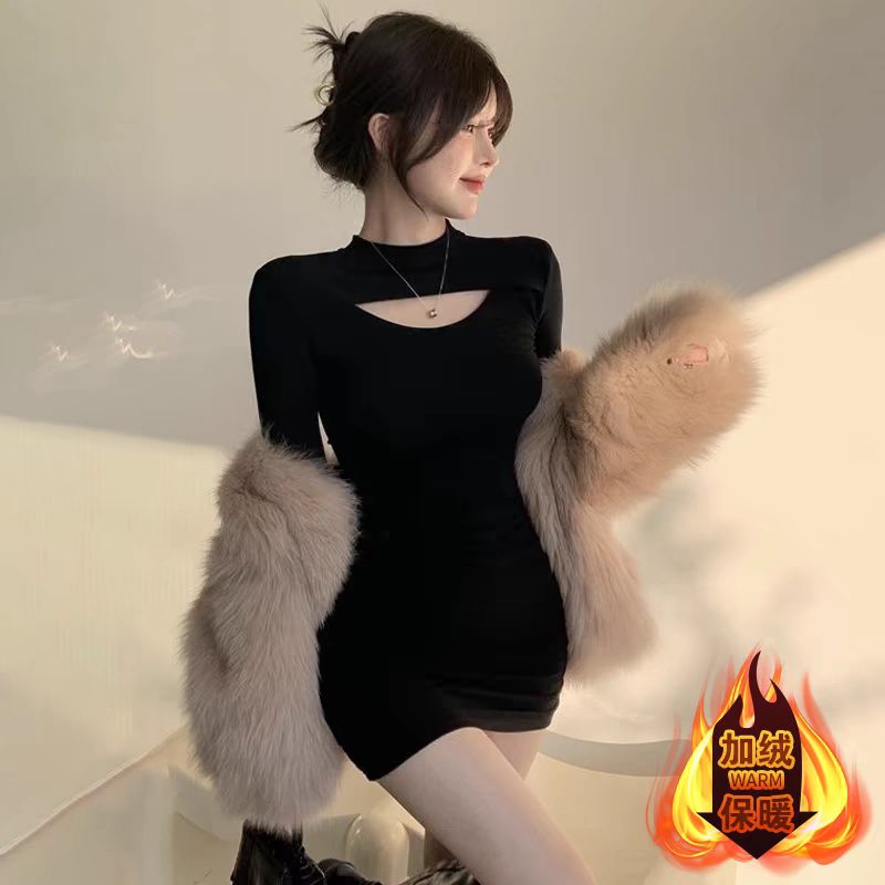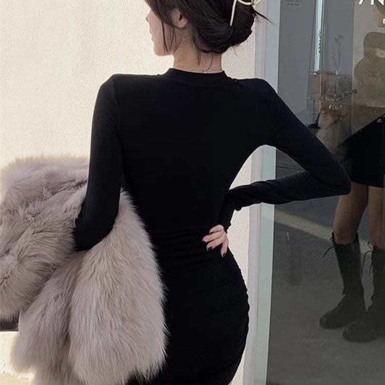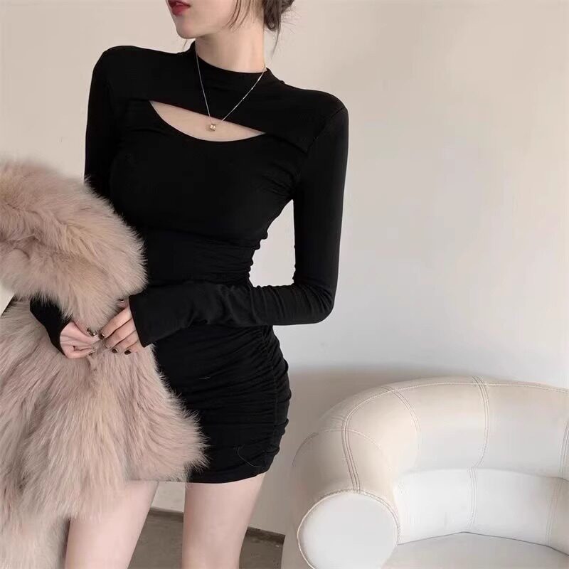 黑色显瘦中长款长袖T恤女性感镂空连衣裙修身辣妹包臀裙褶皱短裙