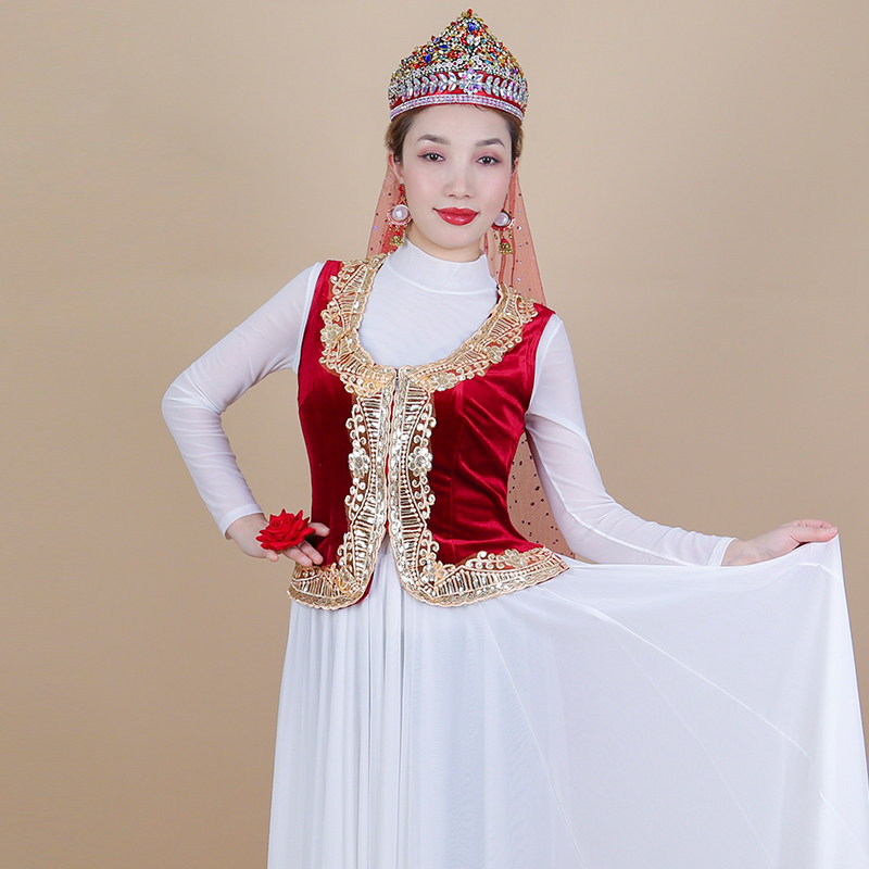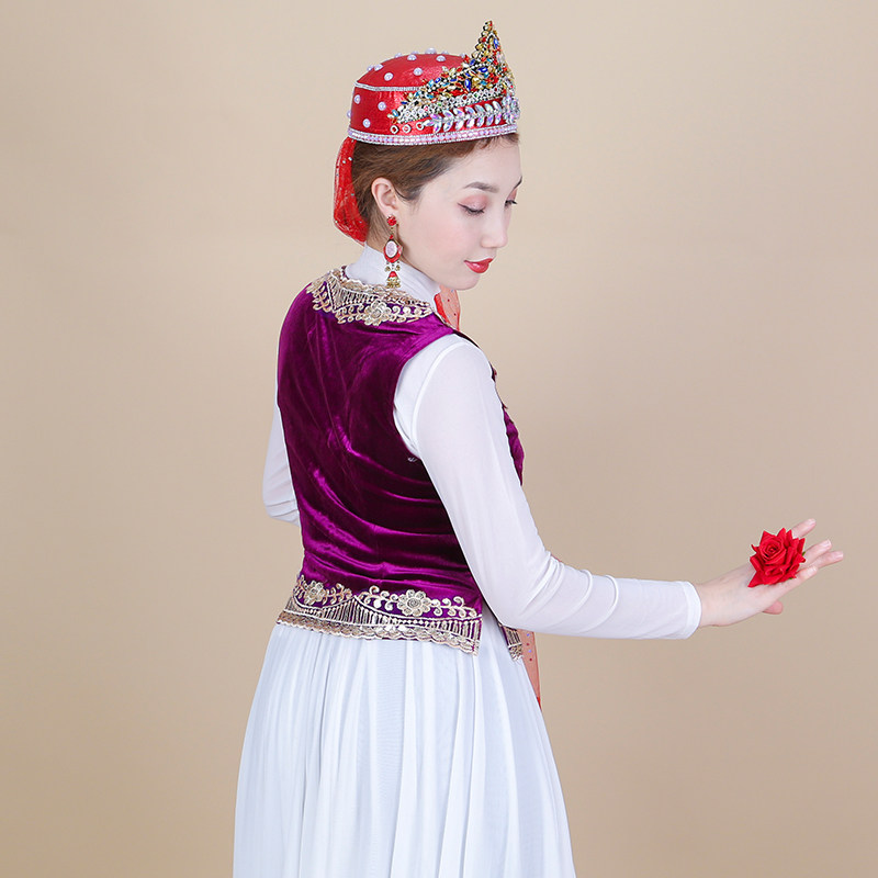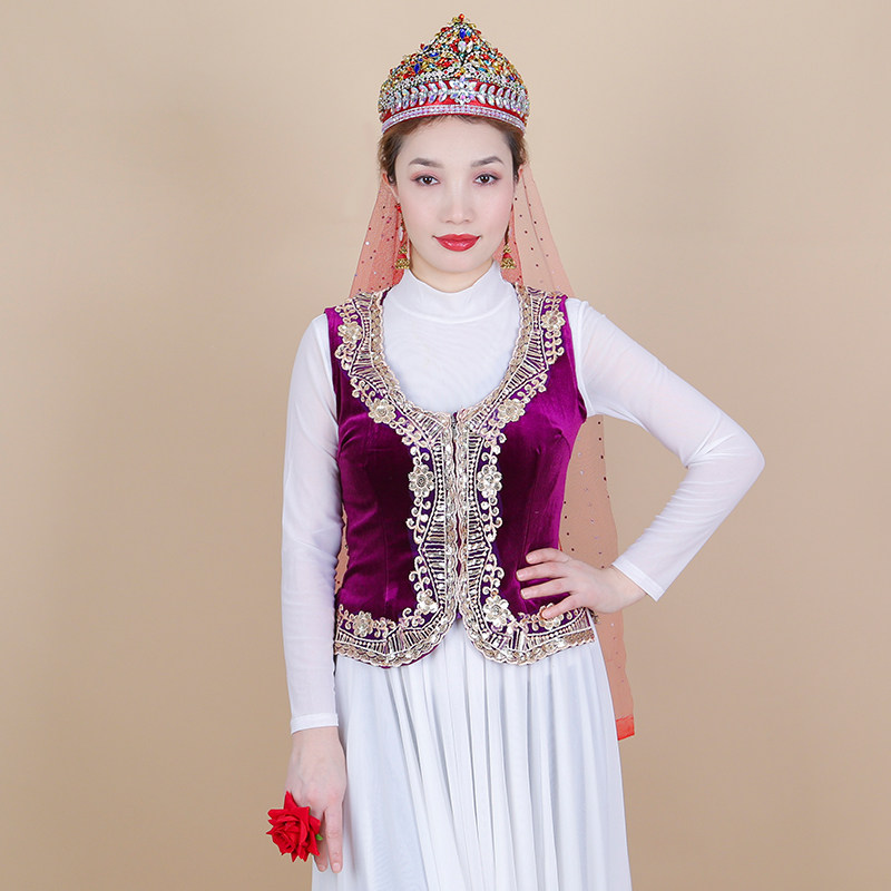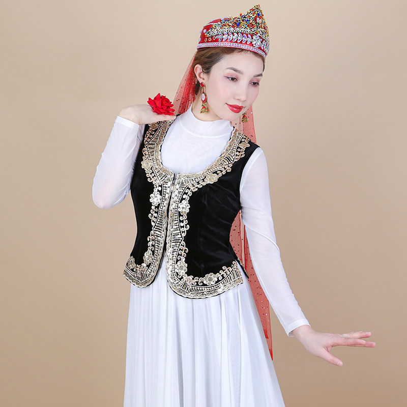 新舞蹈演出服成人短款背心金丝绒贴花坎肩广场舞服装维族舞马甲女