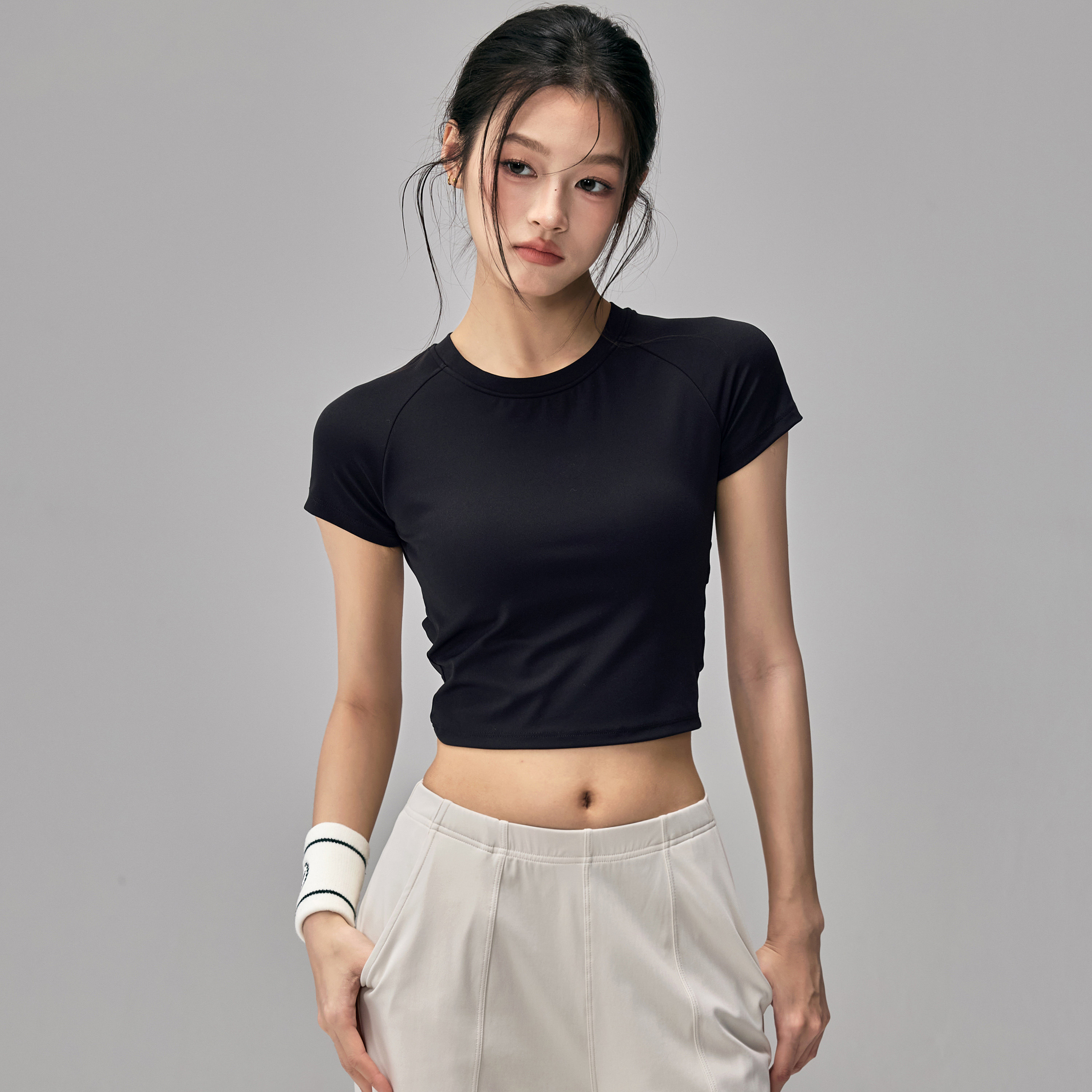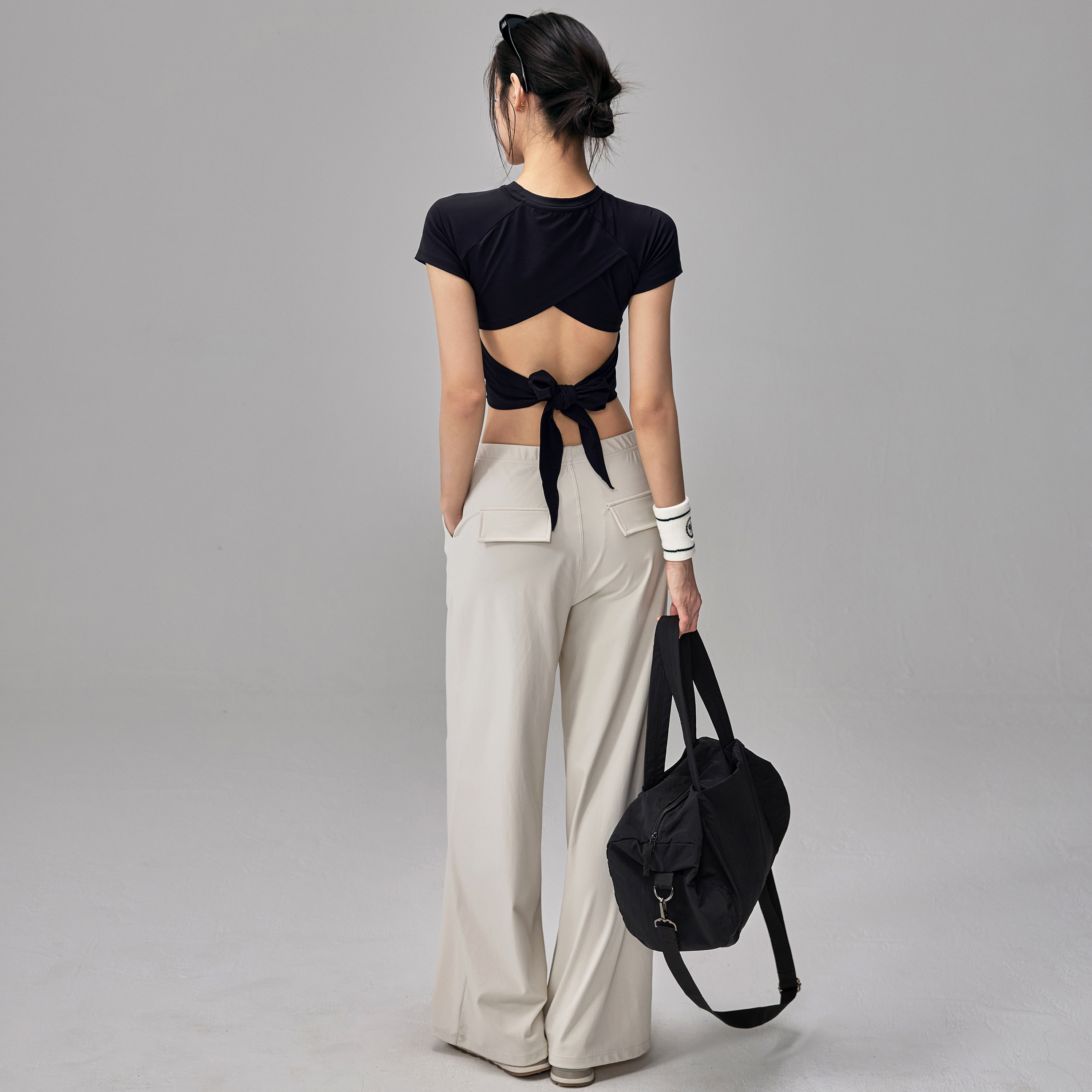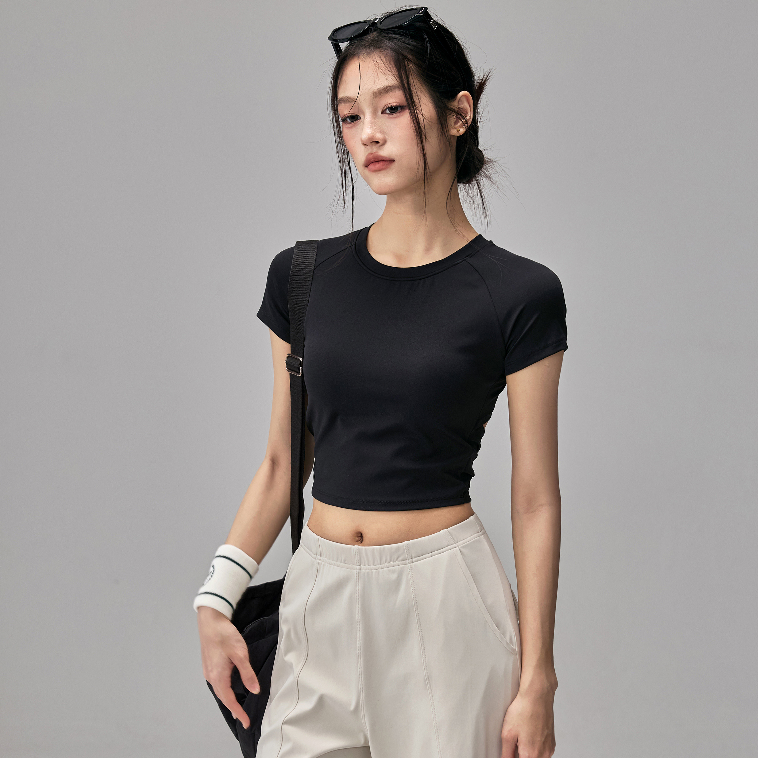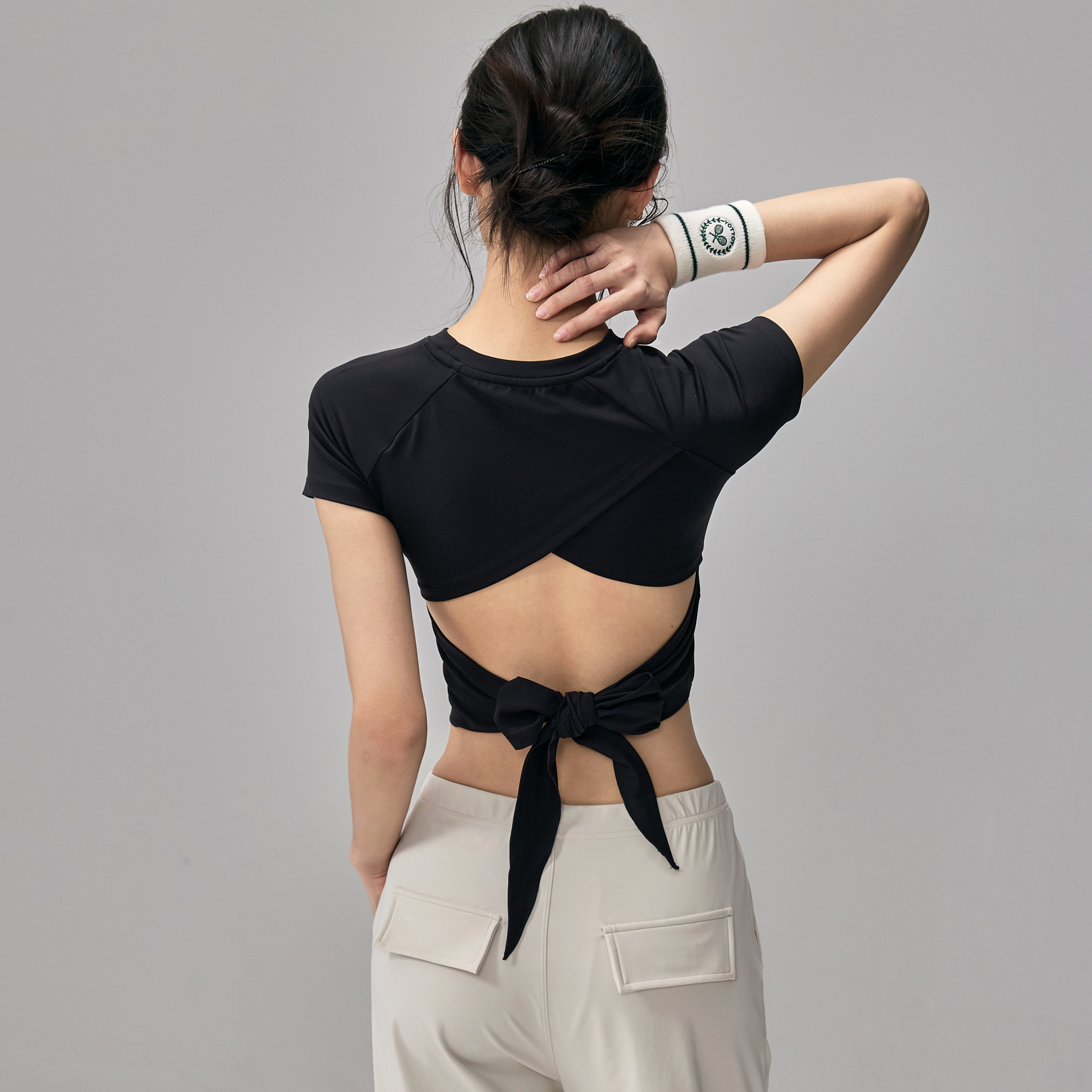 健身女孩带胸垫瑜伽服短袖纯欲系带美背跑步普拉提训练运动上衣夏
