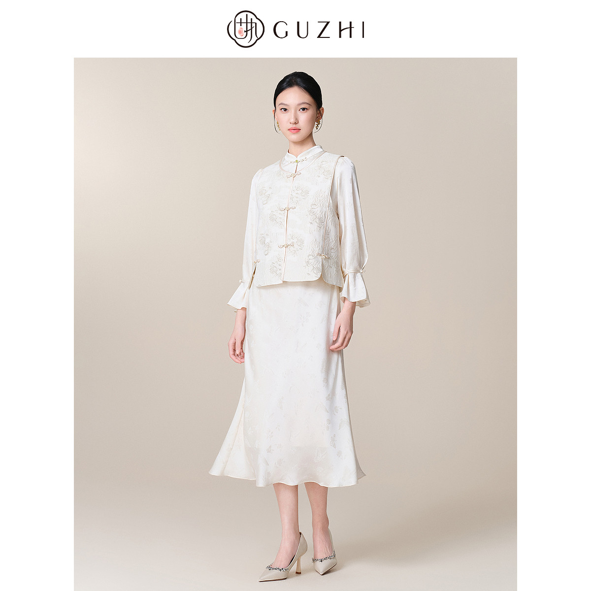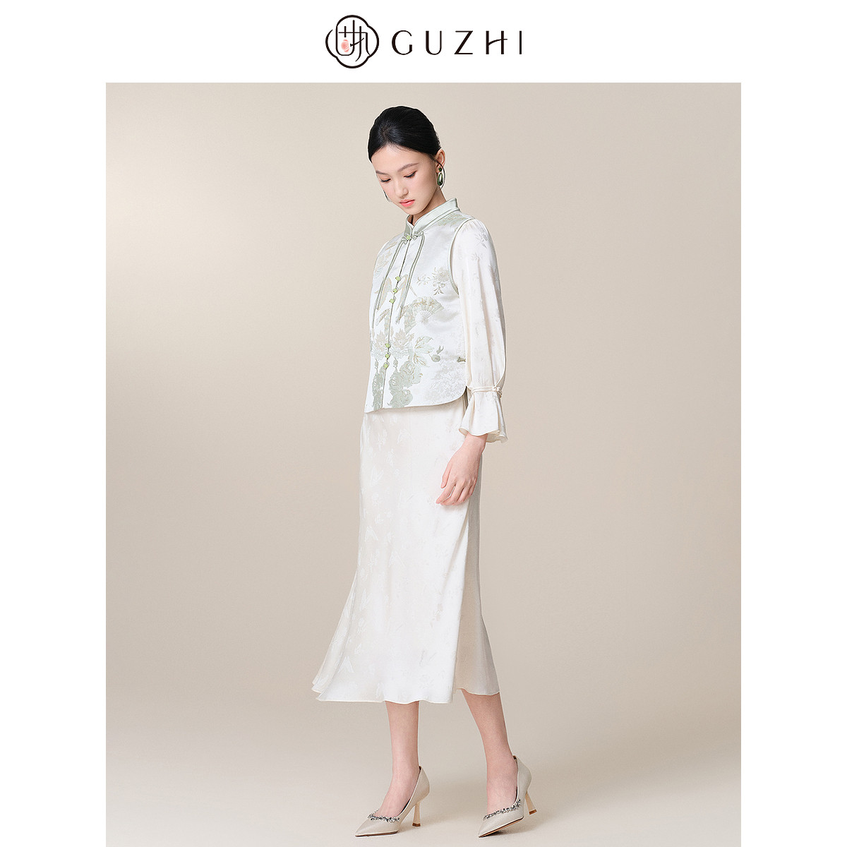 固执春季新款新中式立领提花高腰长袖鱼尾裙中长款旗袍连衣裙