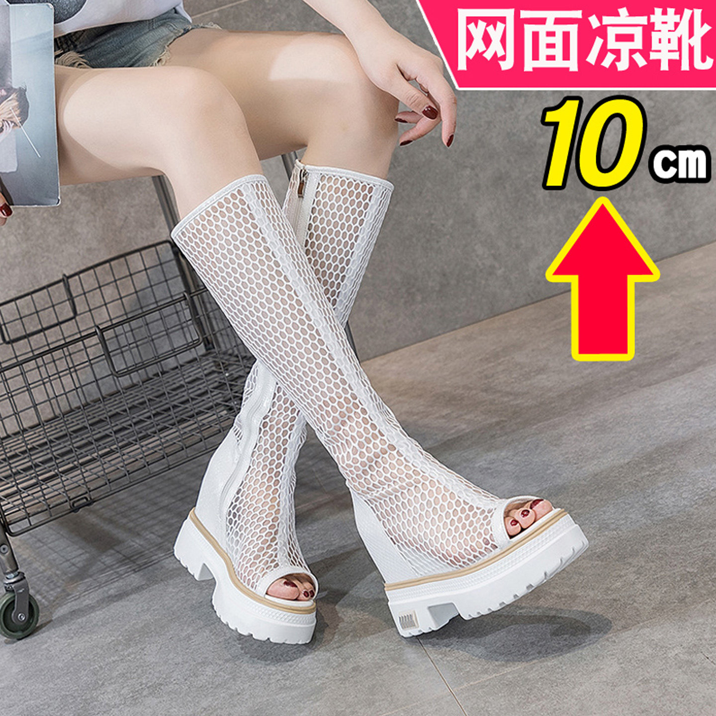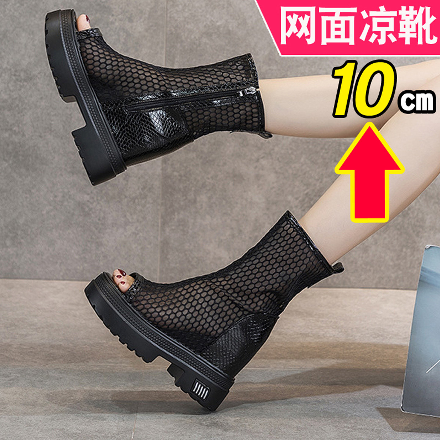 10cm内增高中筒靴小个子凉靴薄款网靴镂空透气网纱靴子女长靴夏天