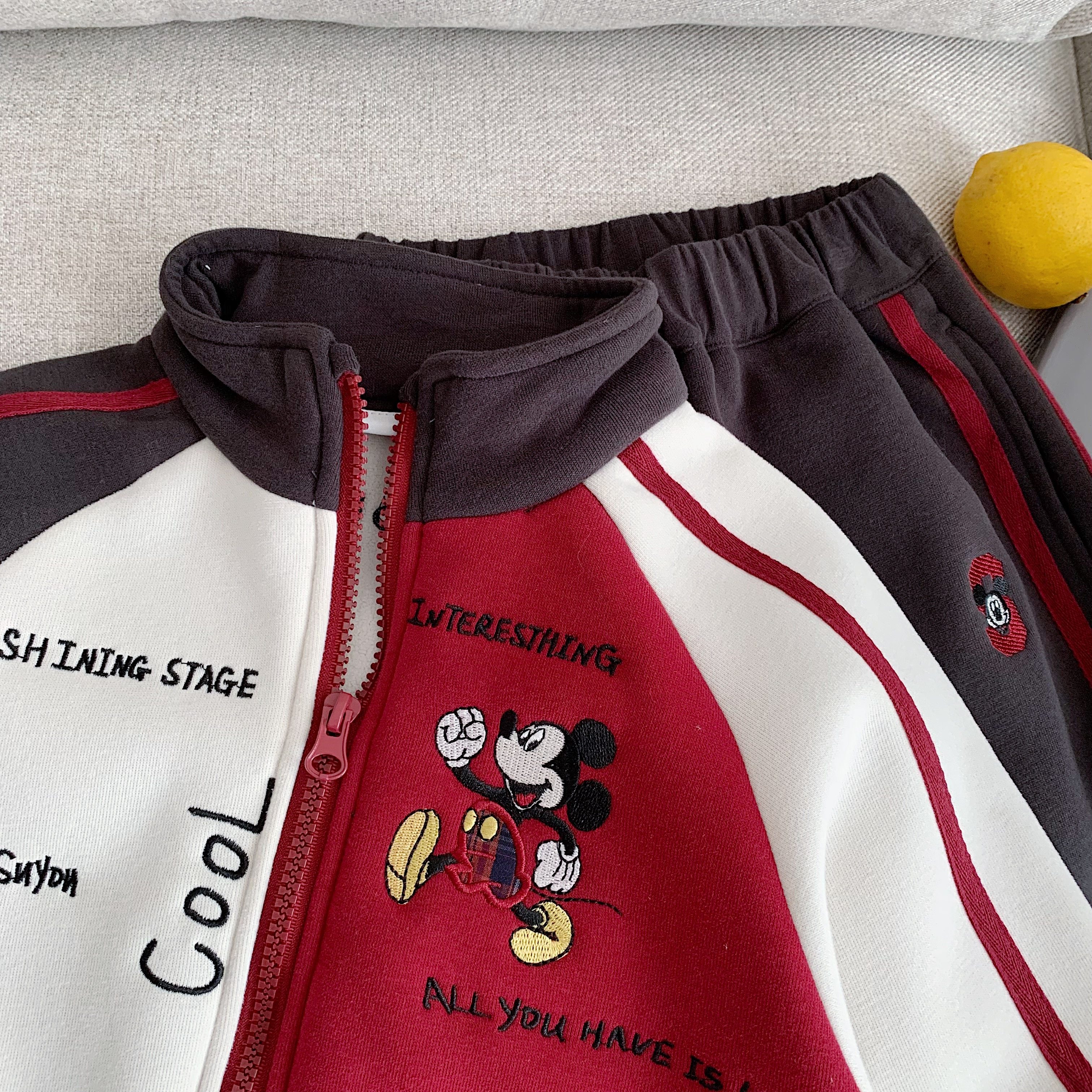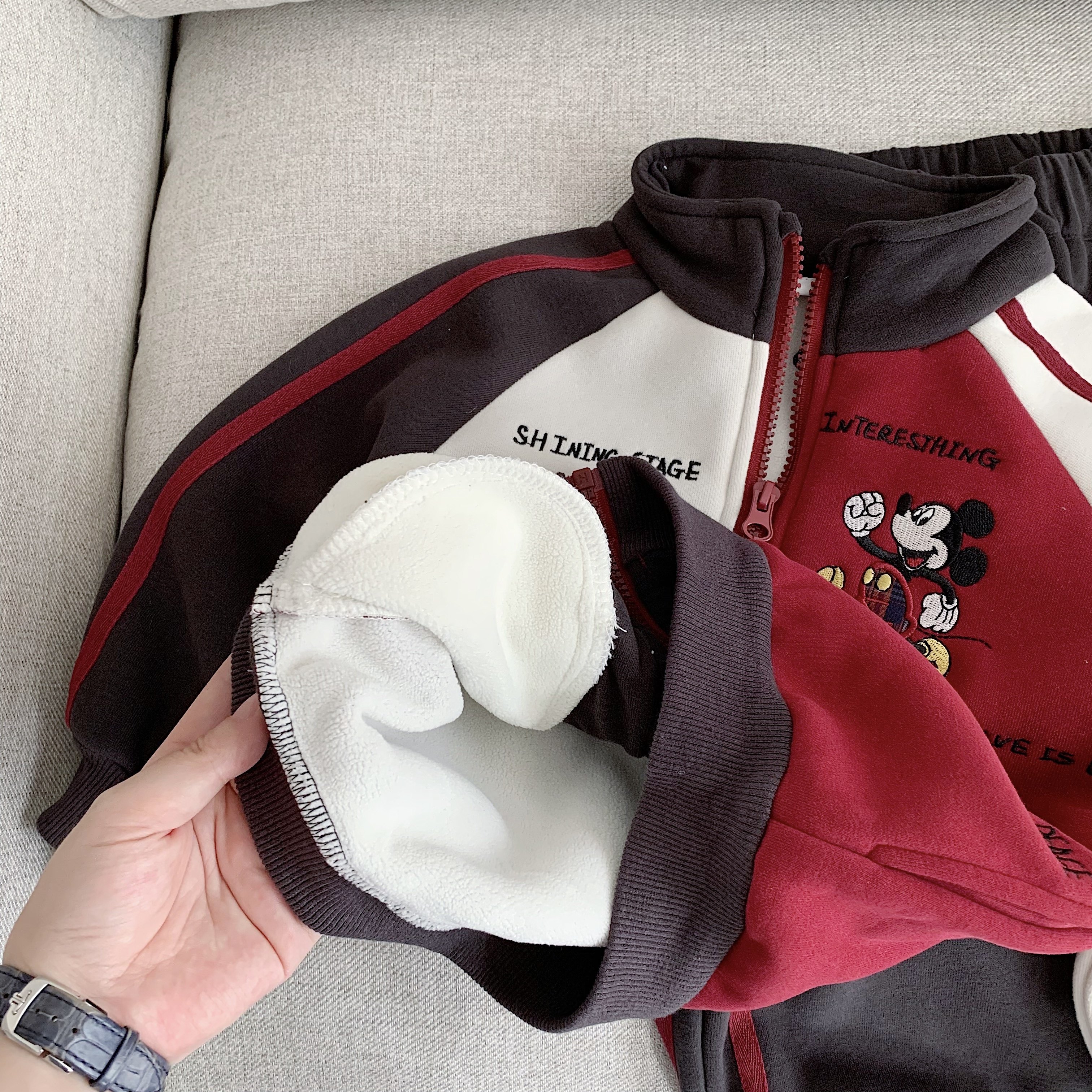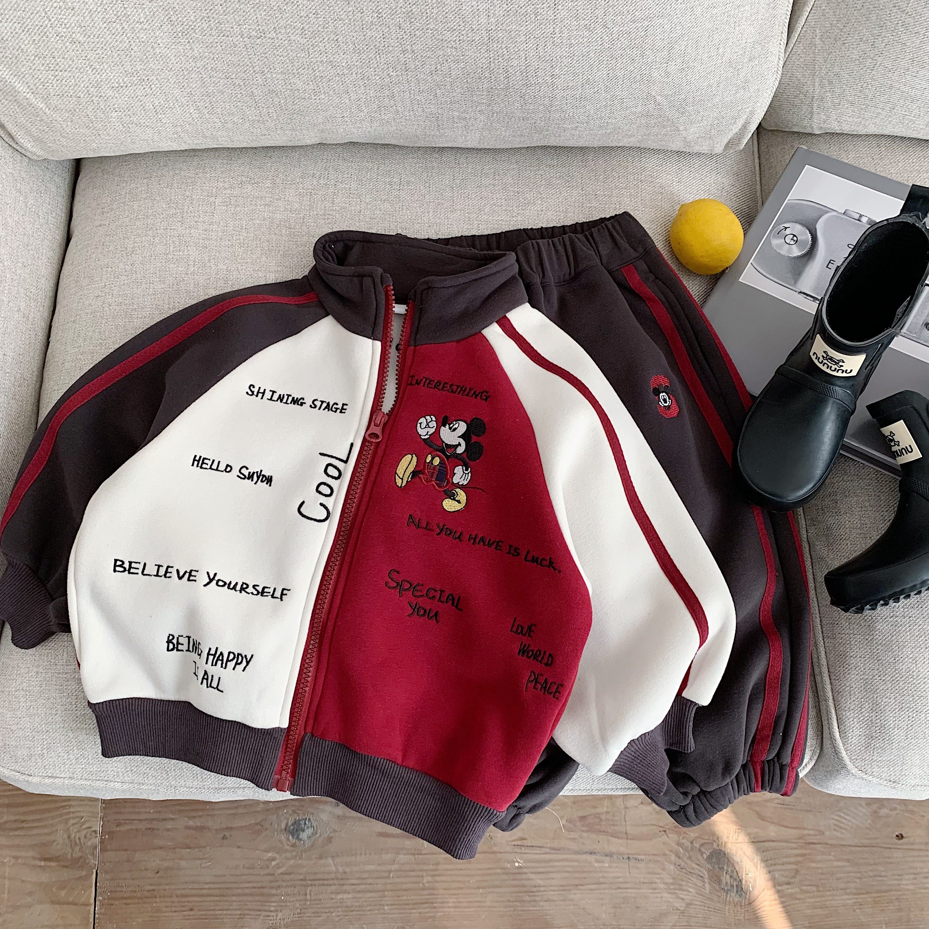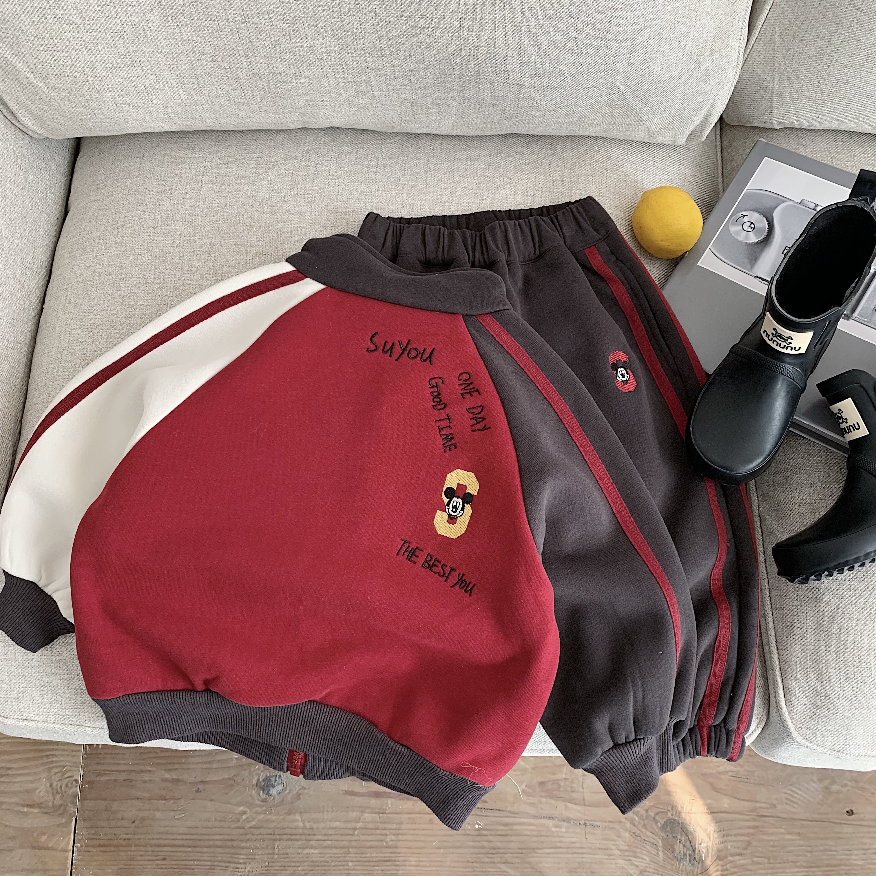 儿童加绒套装冬男童拼色两件套宝宝保暖运动装女童休闲装