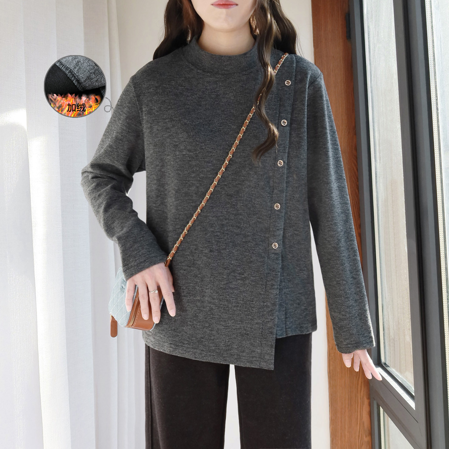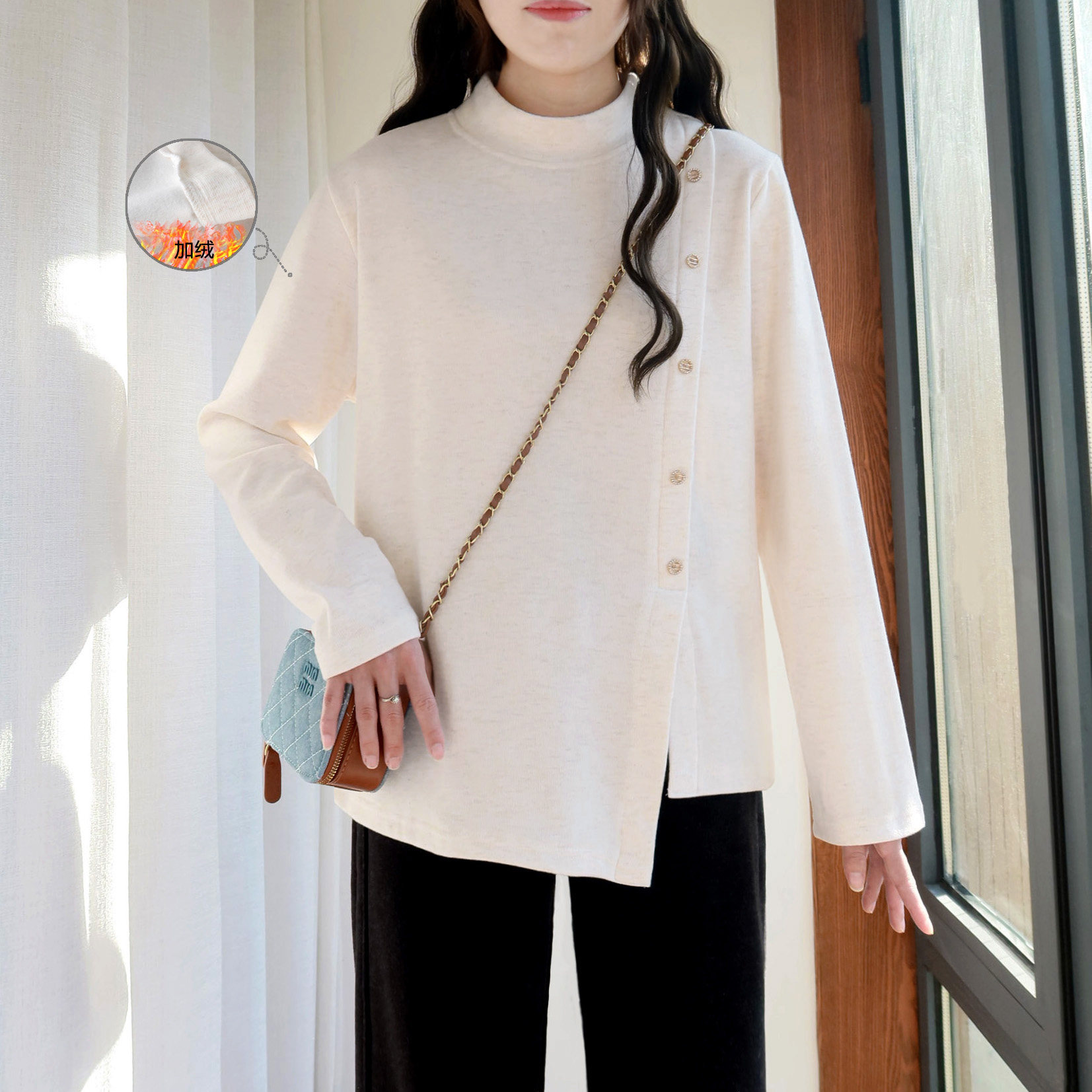大码加绒打底衫女款200斤胖mm可外穿秋冬立领宽松加厚不规则内搭