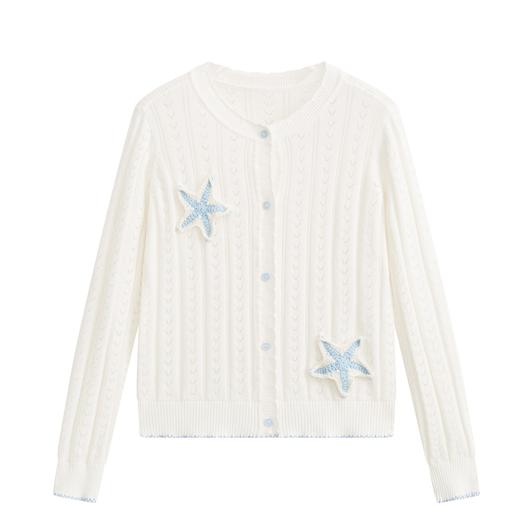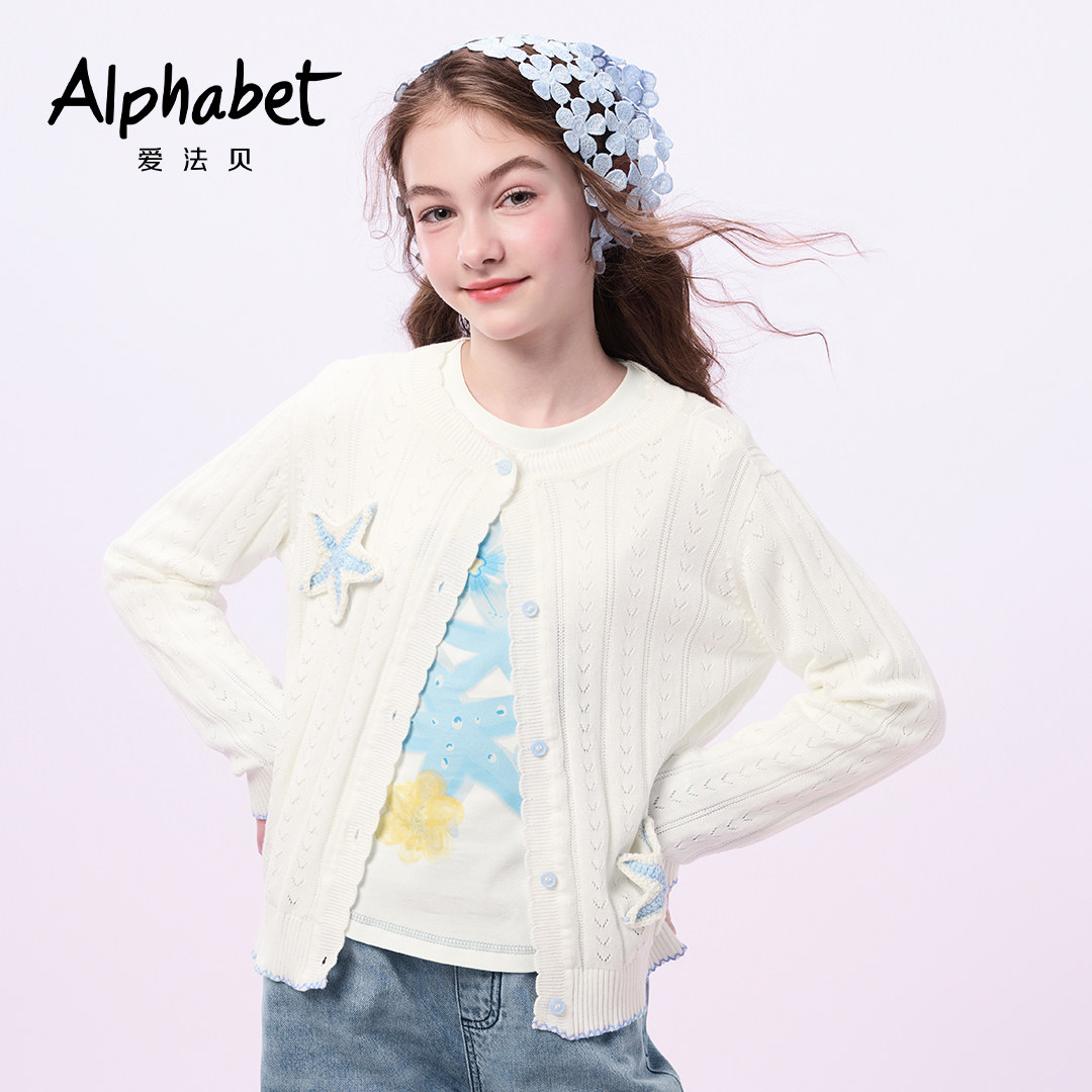 爱法贝春秋学院风麻花针织开衫女童白色纽扣毛衣外套少女感甜美