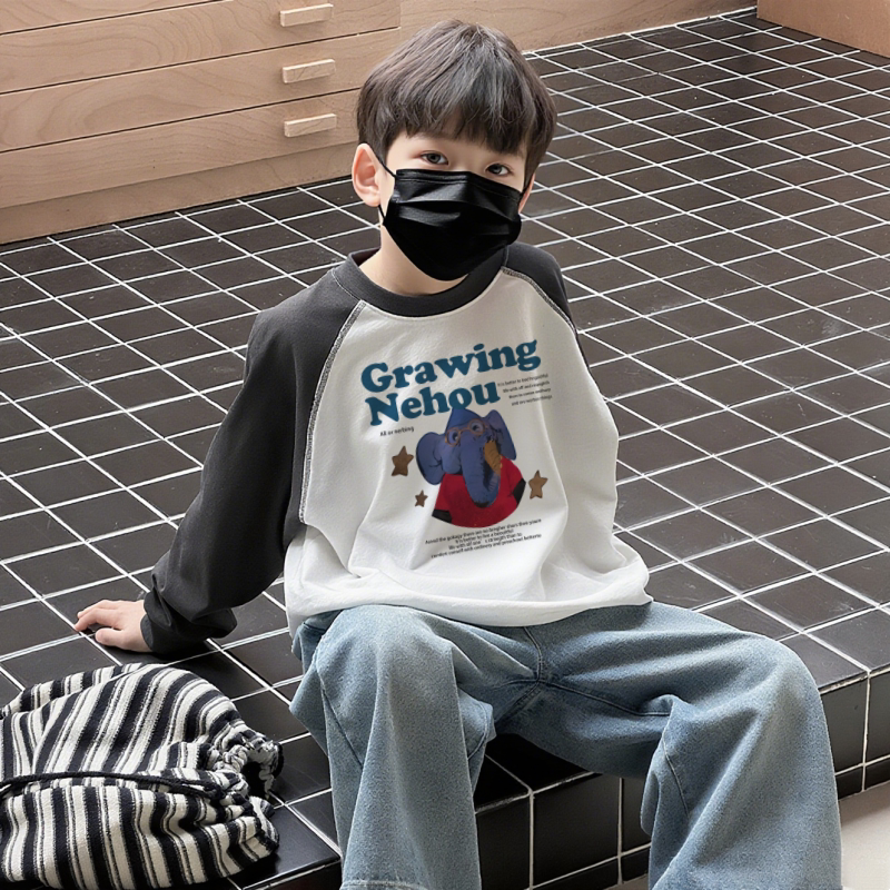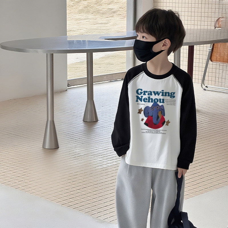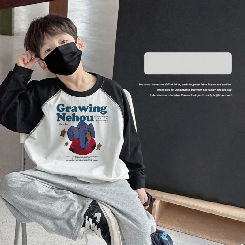 韩版男童纯棉长袖T恤2025早秋中大童休闲宽松百搭撞色圆领上衣潮
