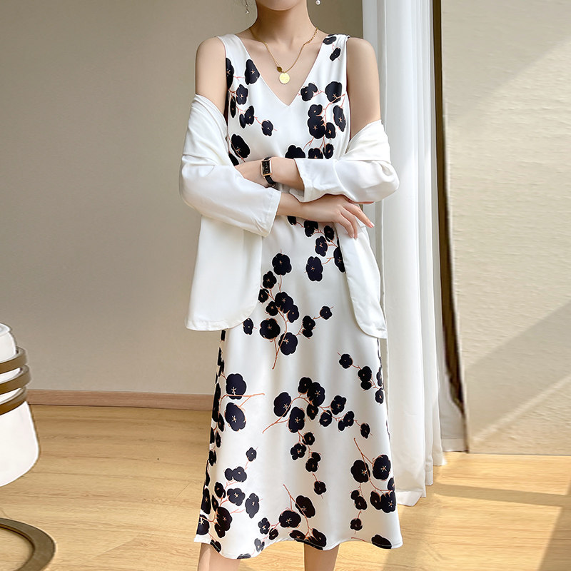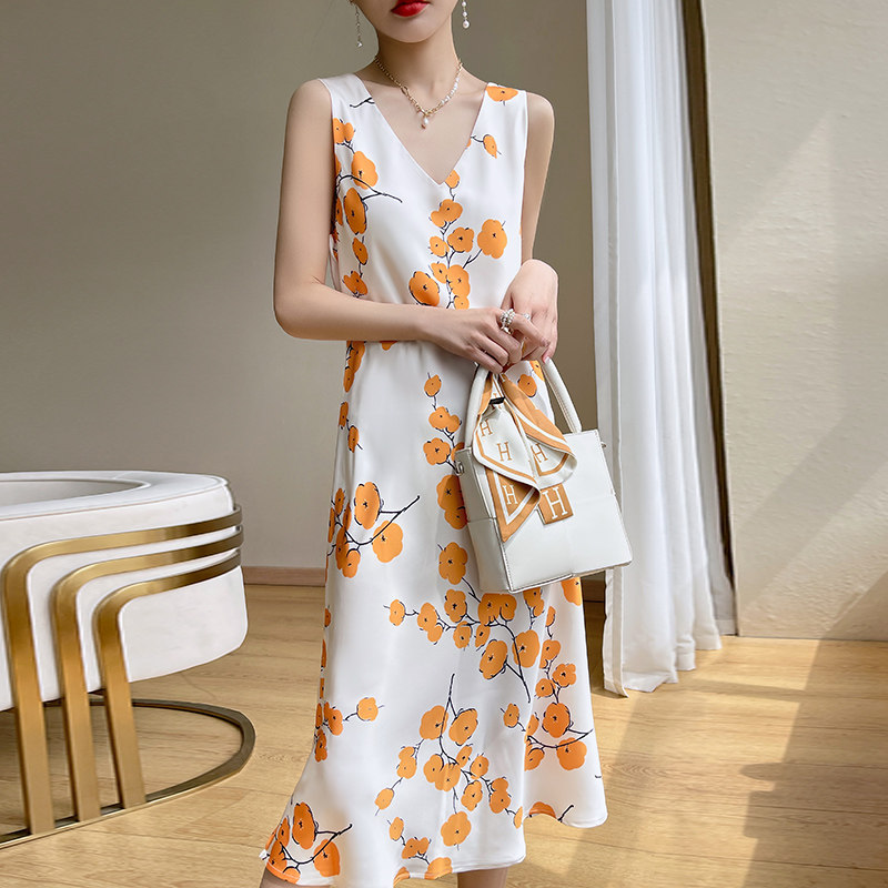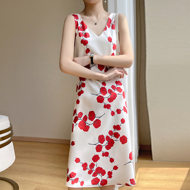 法式碎花吊带连衣裙女夏季醋酸真丝缎面高级感气质v领修身长裙子