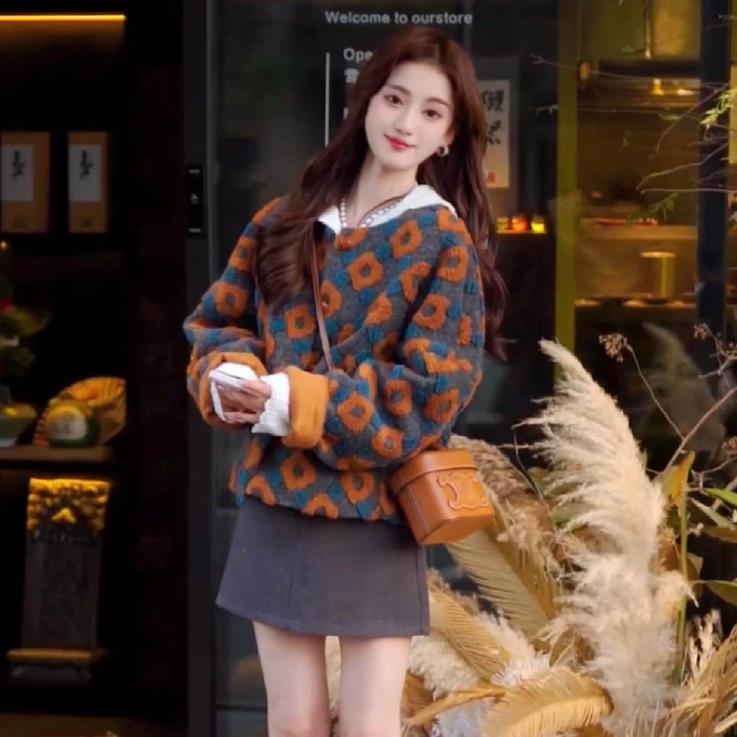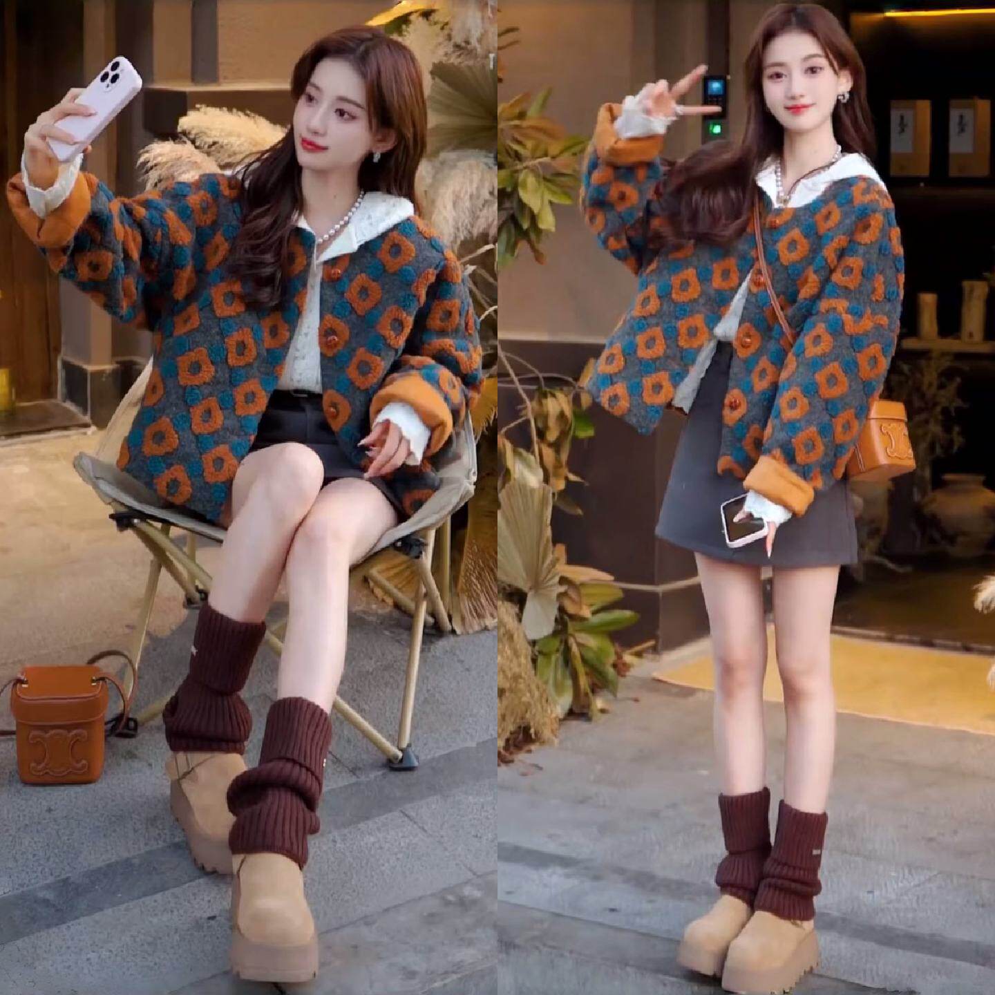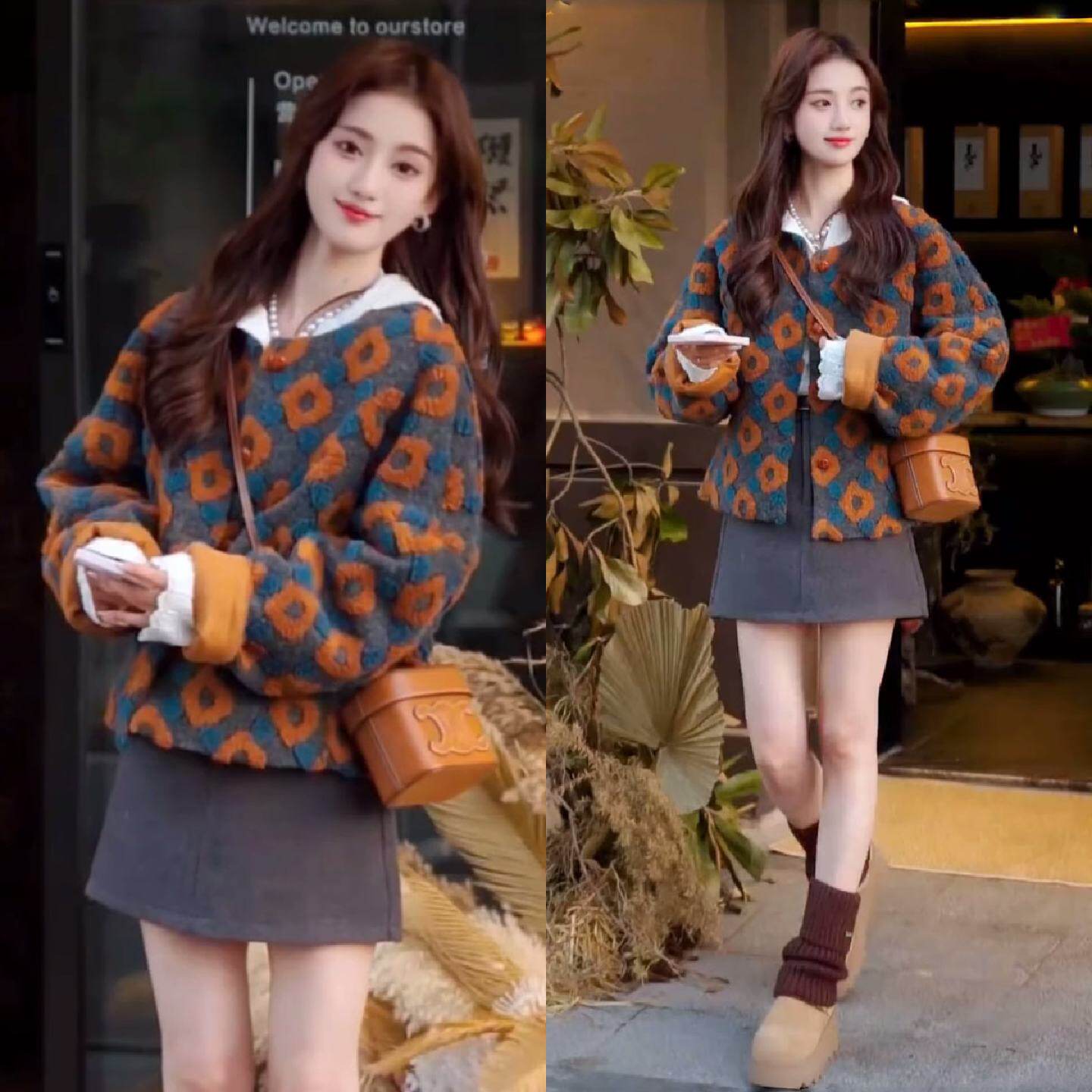 韩系搭配一整套冬装小香风时尚立体花朵外套针织衫半身裙三件套装