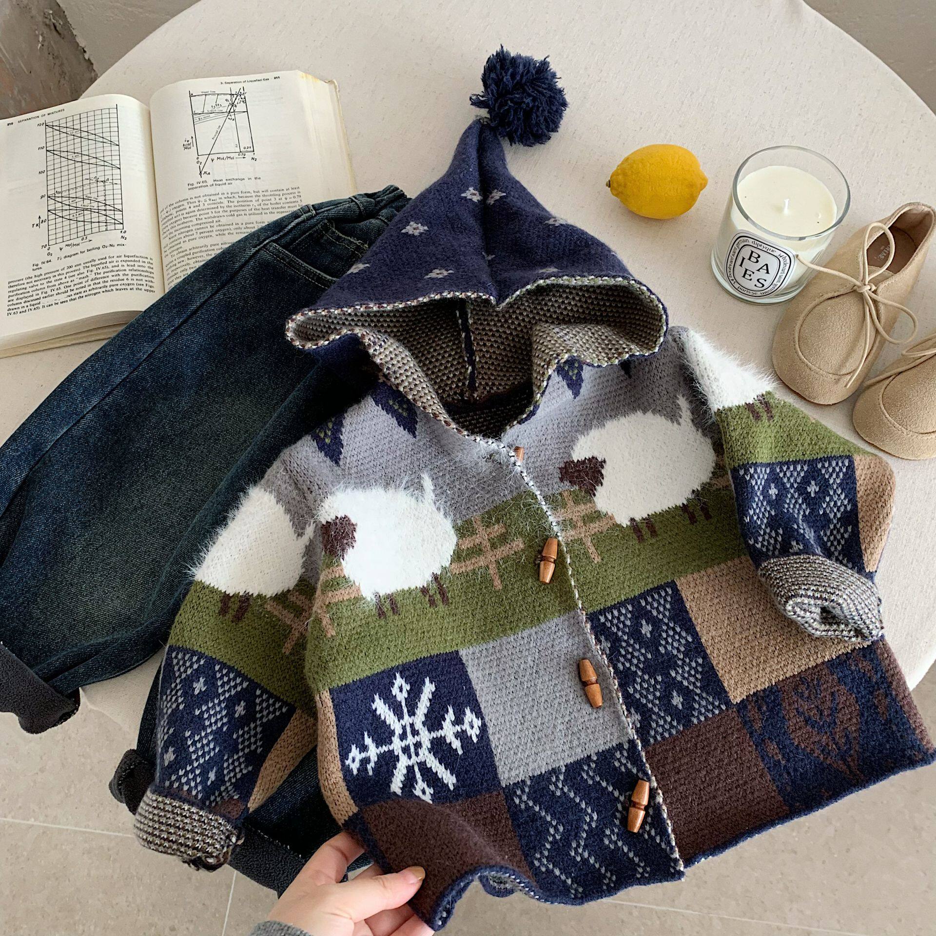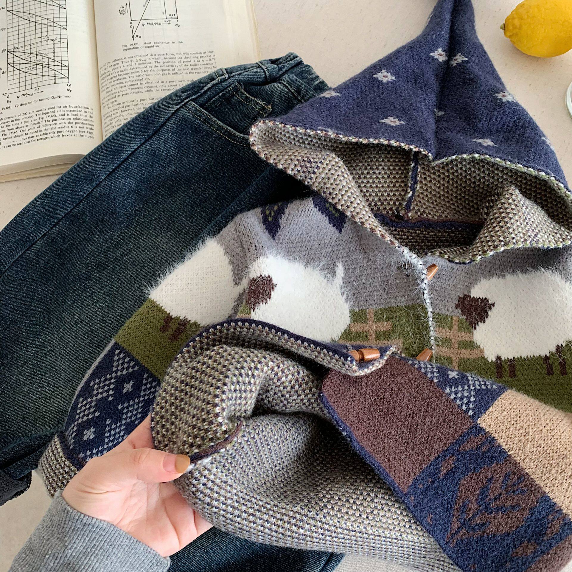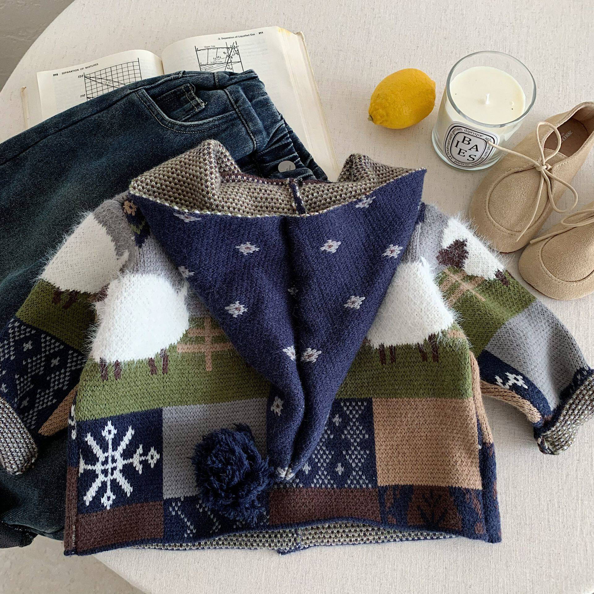 儿童连帽毛衣男加厚2025冬季新款小童拼色开衫宝宝针织外套女洋气