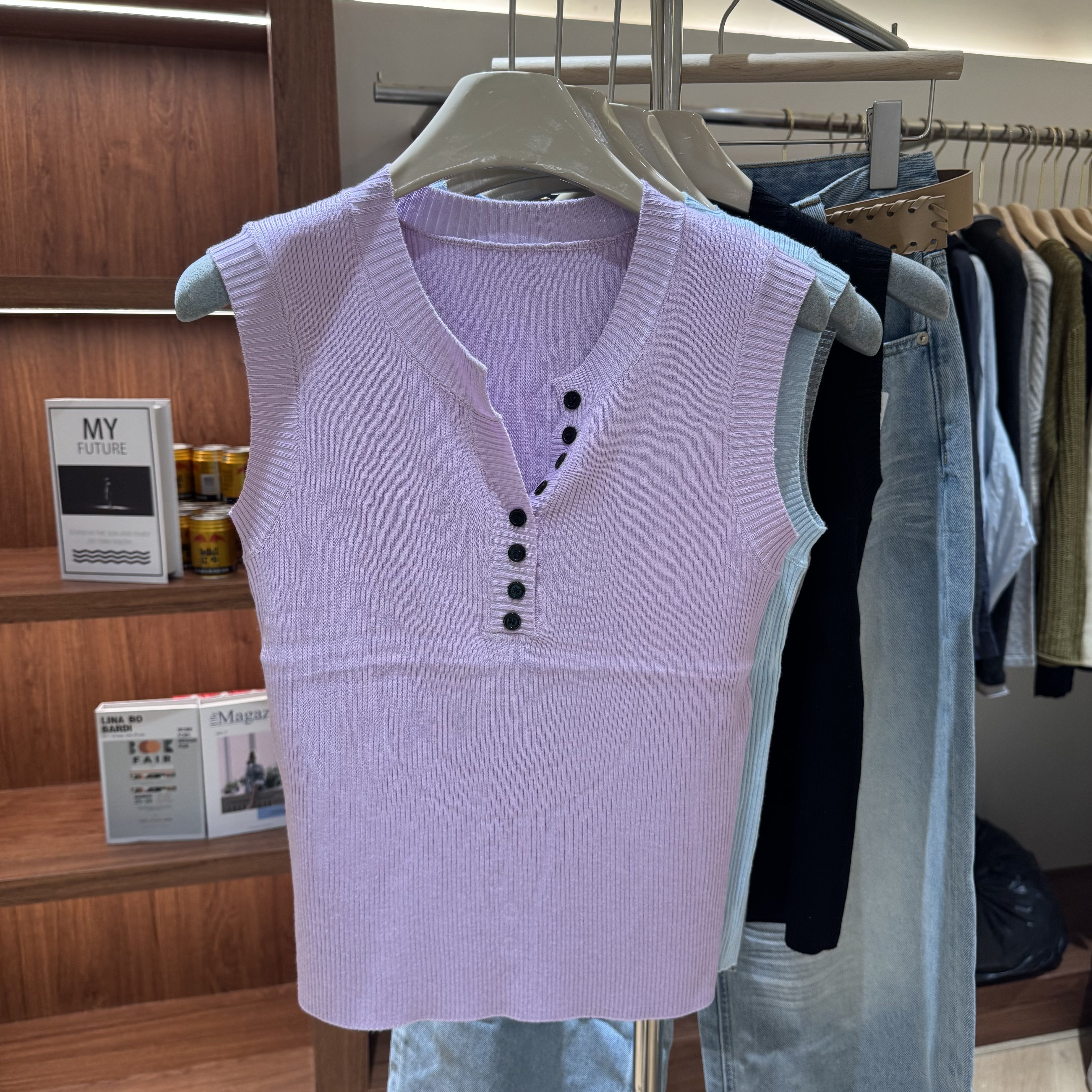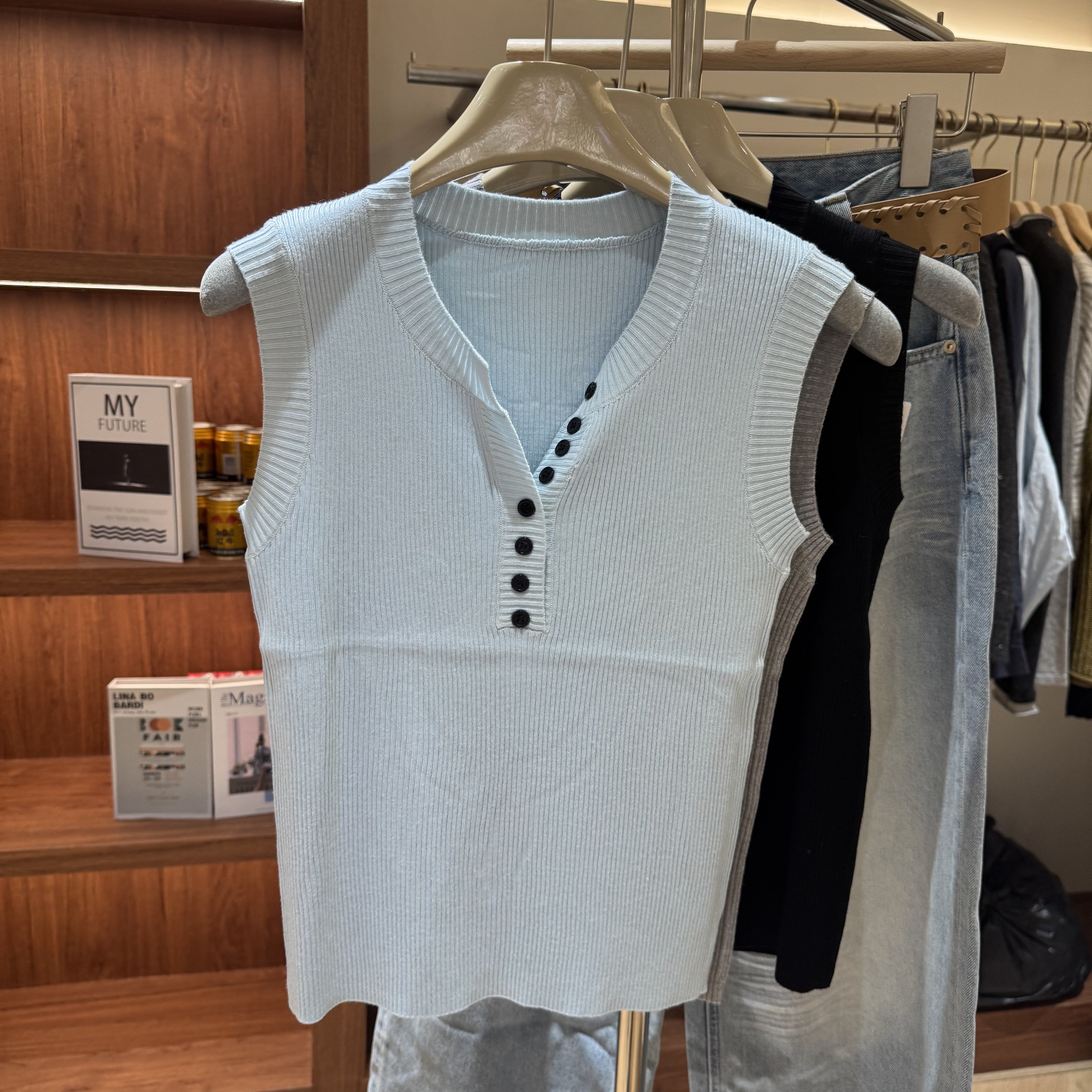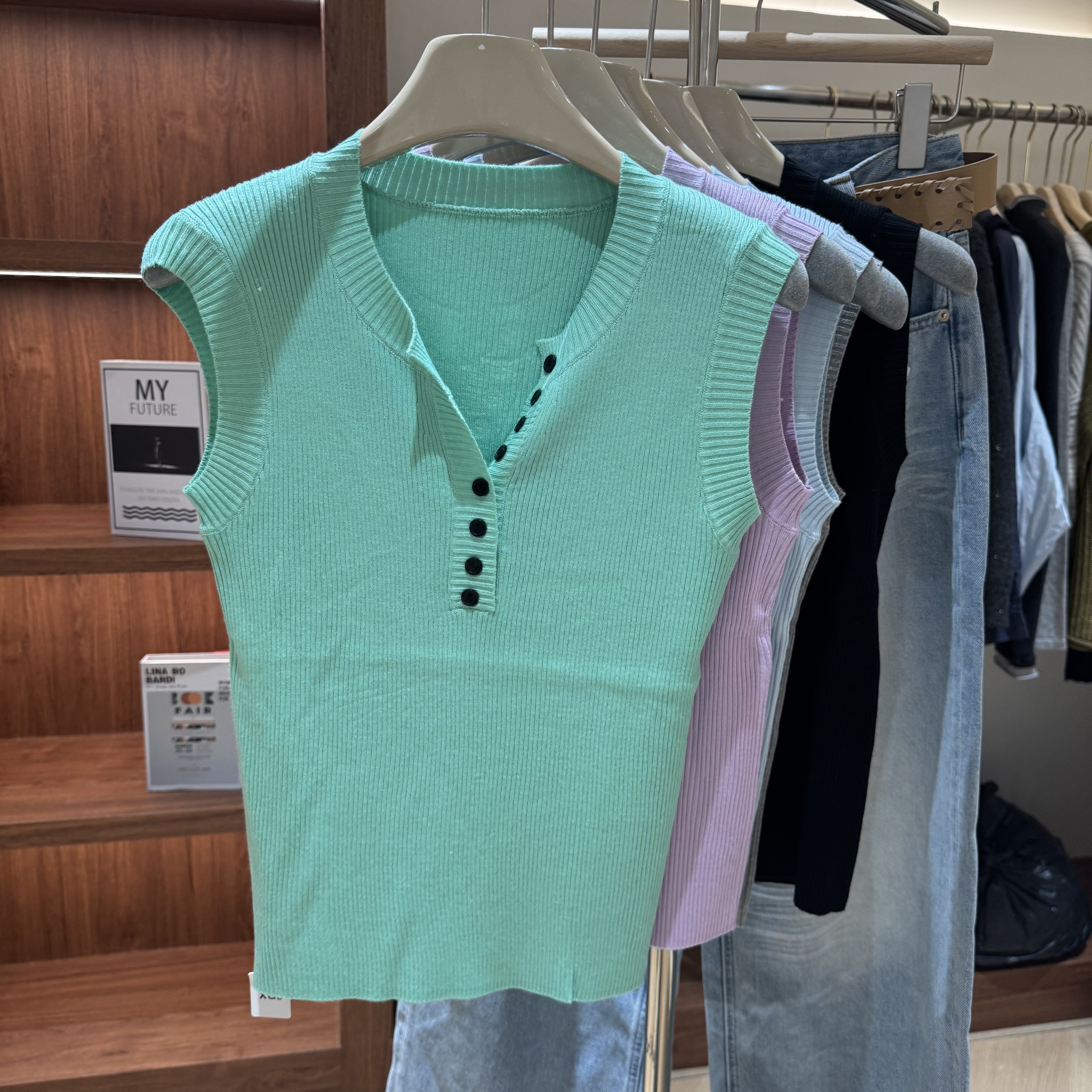 极简风纽扣针织背心女剪刀领纽扣无袖百搭修身显瘦上衣多色内搭