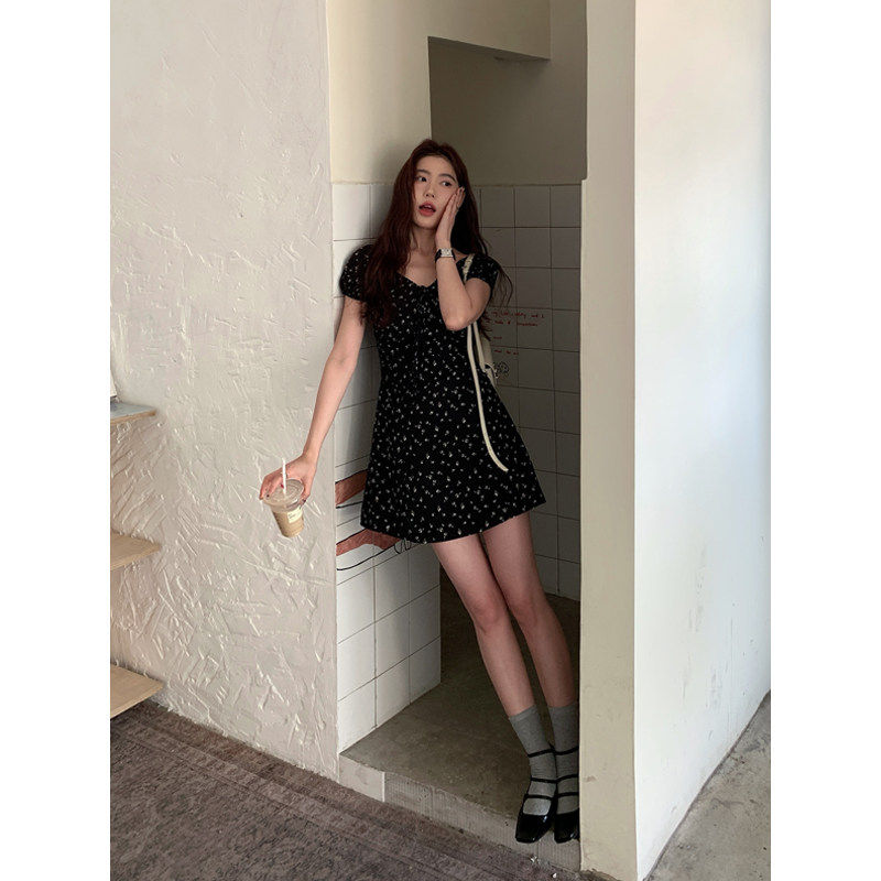 Halo Luu 茶歇法式黑色碎花连衣裙女夏季韩系绝美收腰短款a字裙子