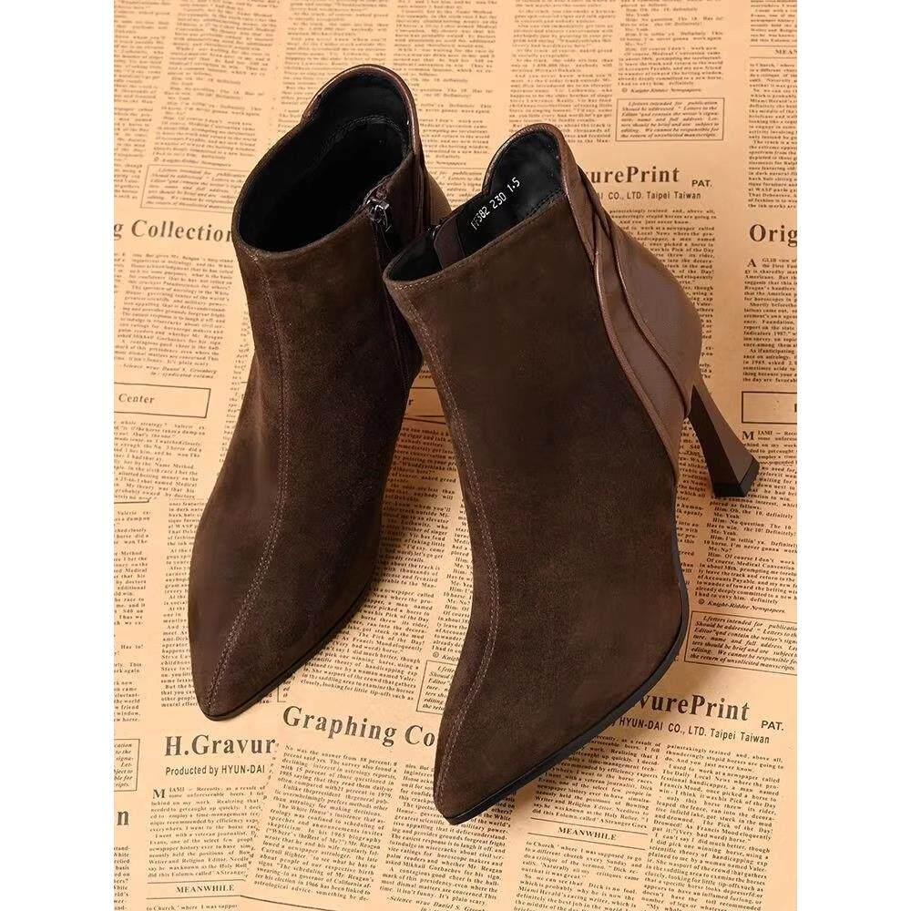 品牌撤柜真皮法式气质高跟鞋女秋冬尖头细跟短靴女时尚百搭马丁靴