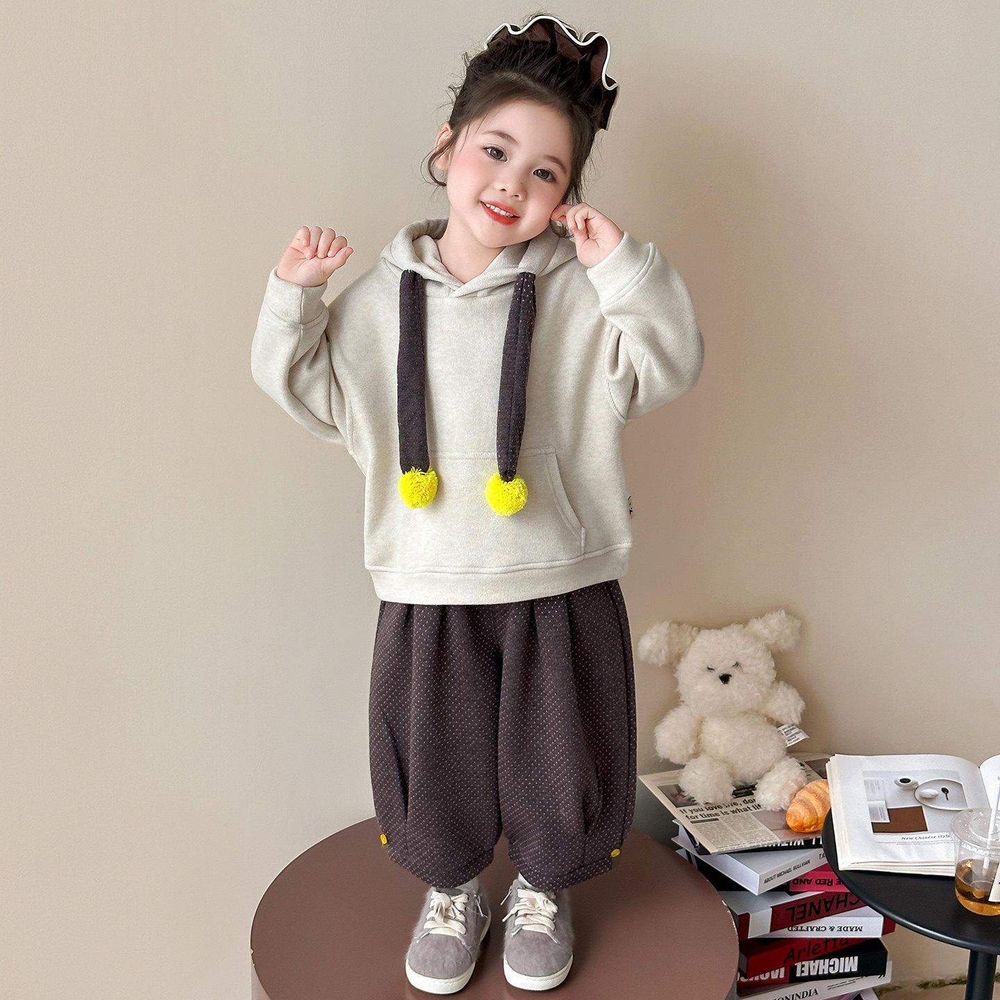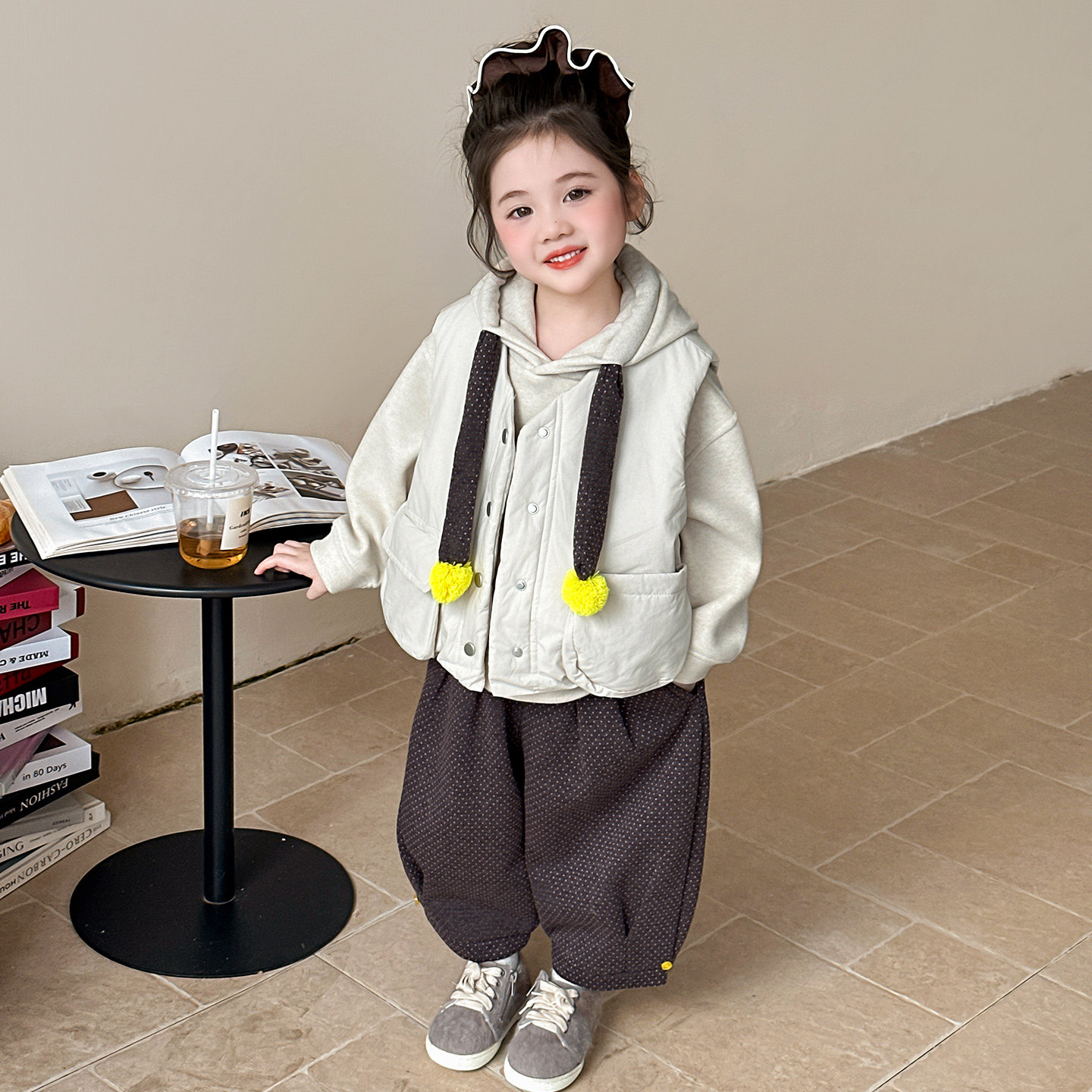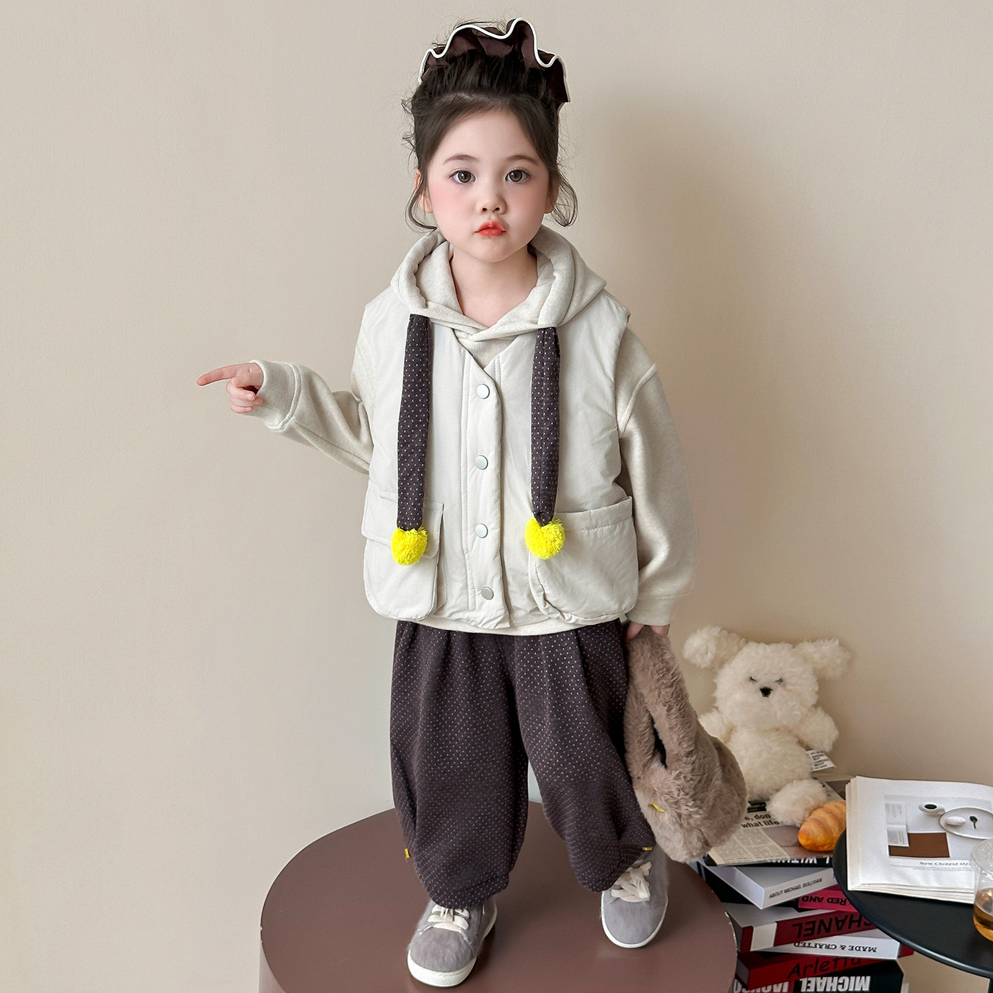女童加绒套装秋冬季2026新款洋气女宝宝马甲三件套儿童装冬装毛球