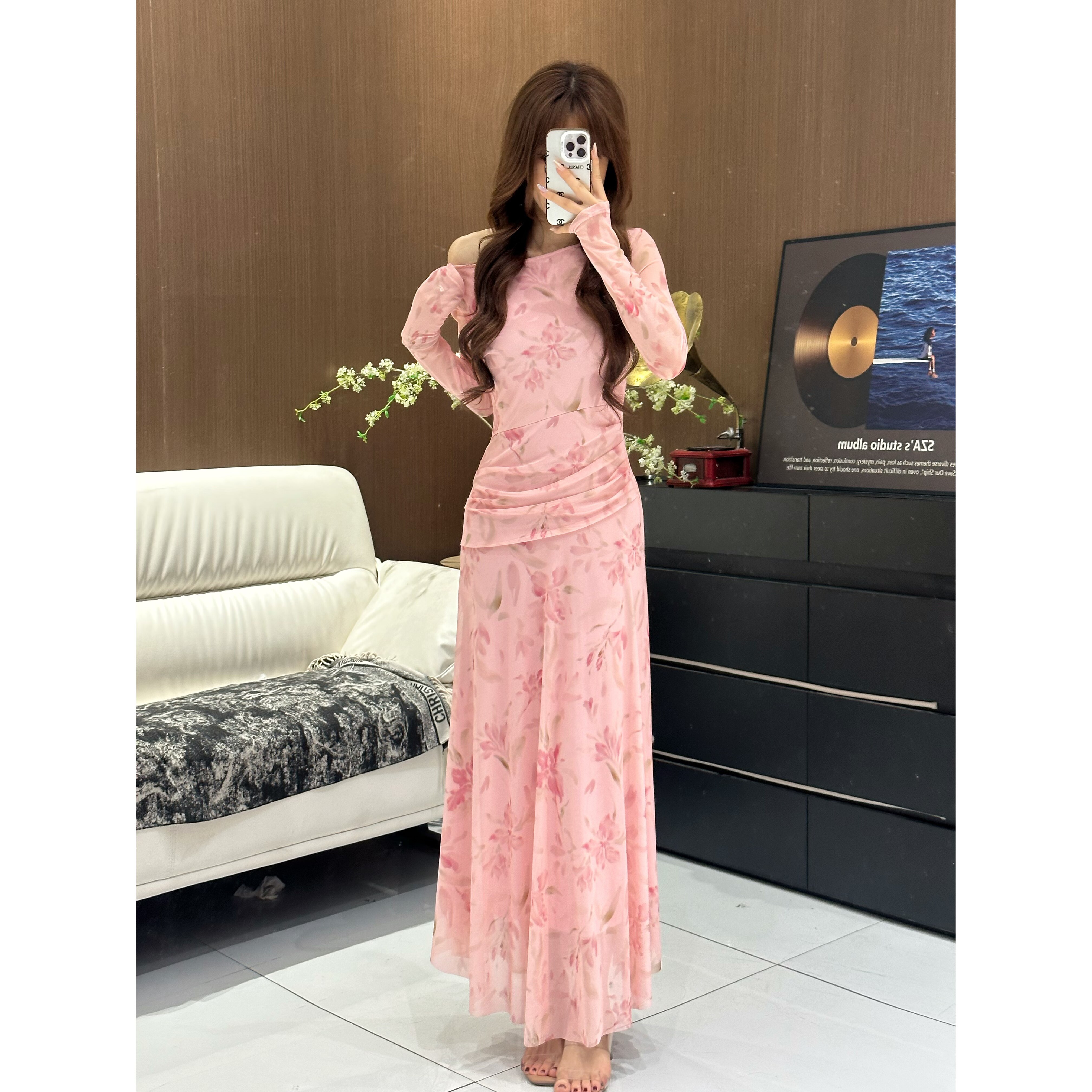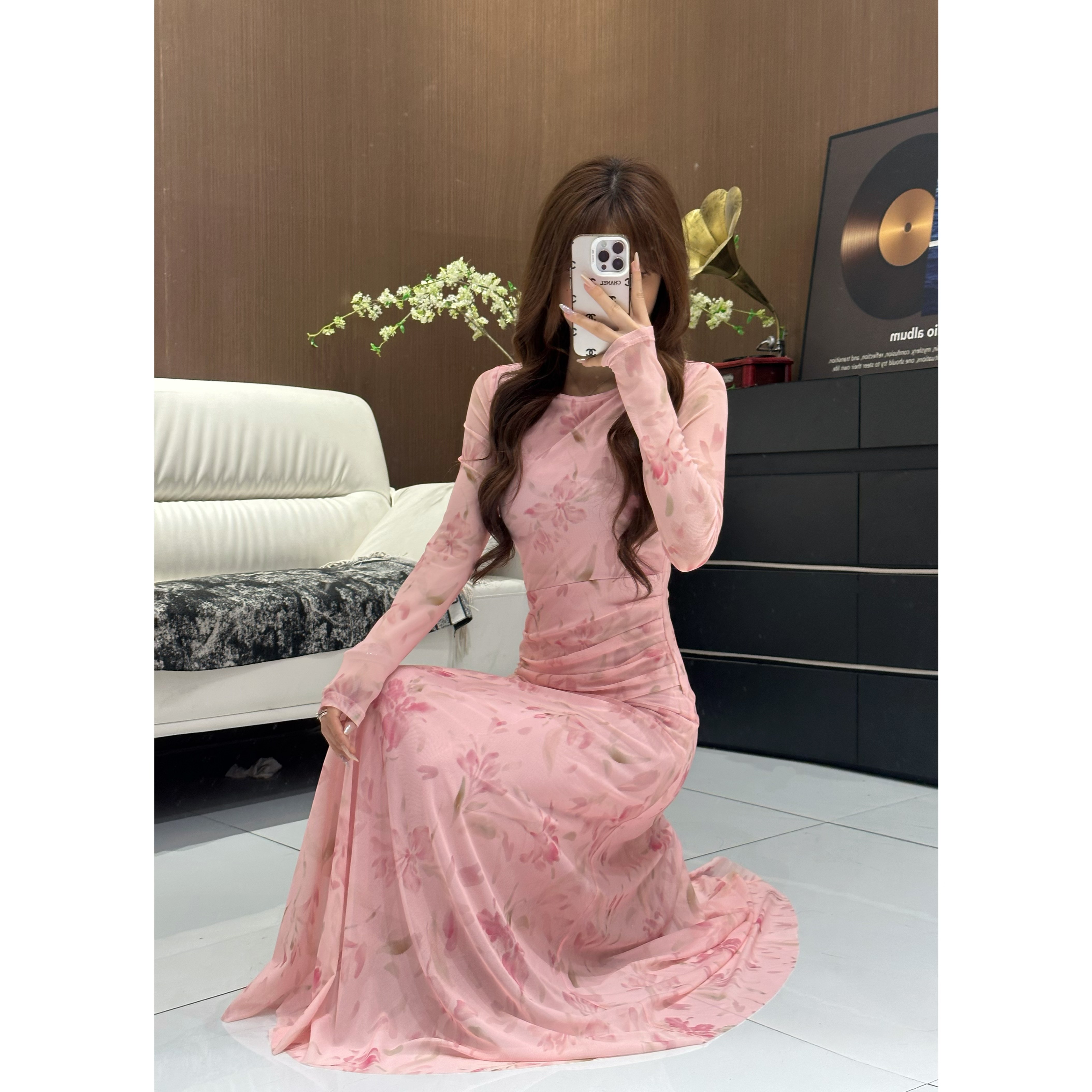 2026春季长袖气质印花常规长款高弹力长裙印花修身连衣裙碎花426