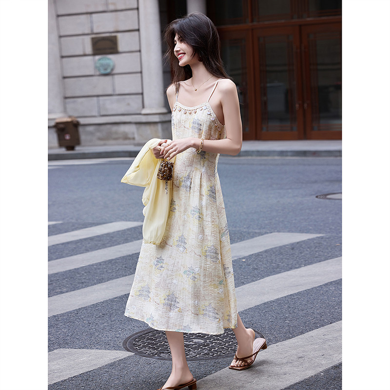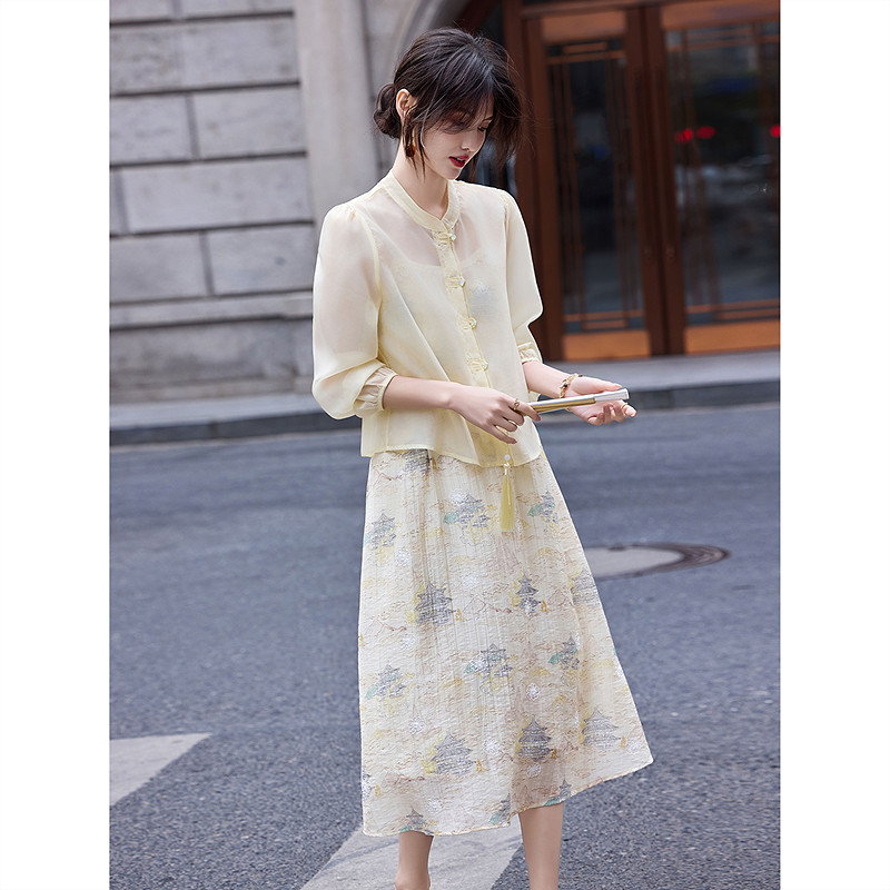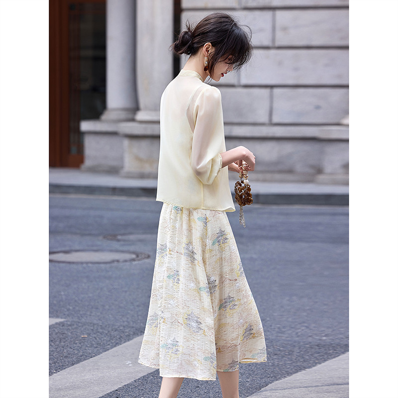 苏醒家新中式国风立领长袖雪纺衫长款吊带连衣裙两件套装