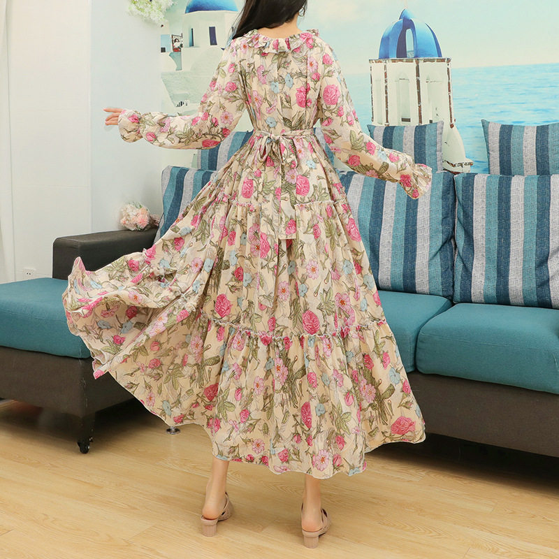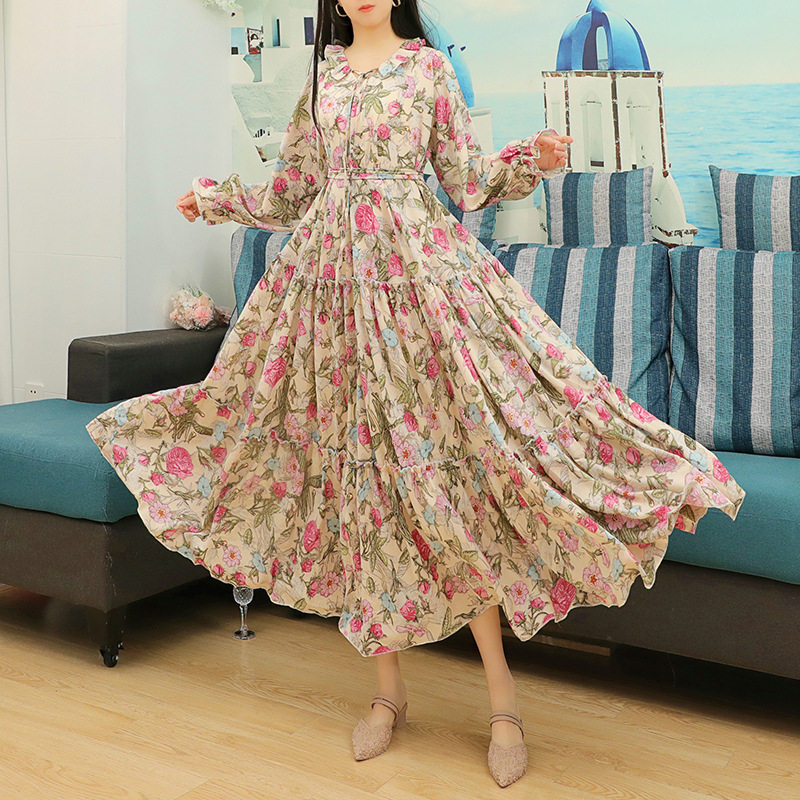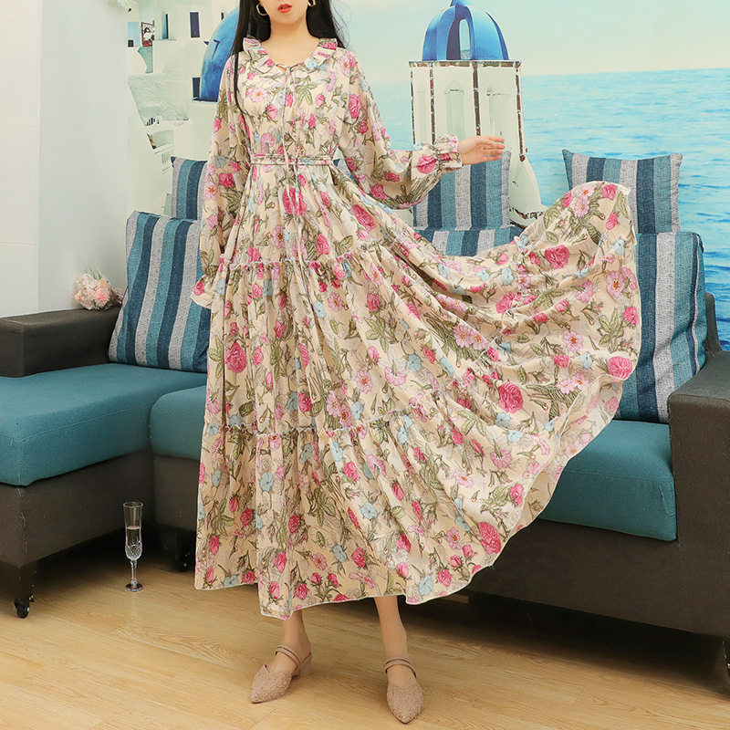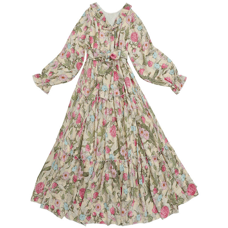 2026春季新款法式连衣裙碎花雪纺长袖大码长款显瘦度假微胖长裙仙