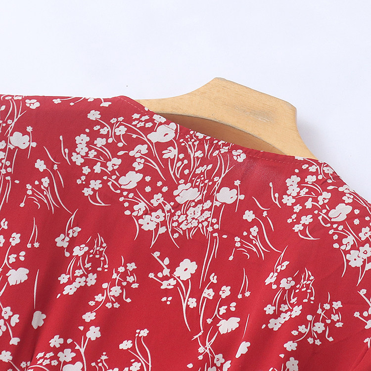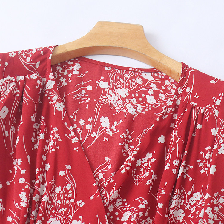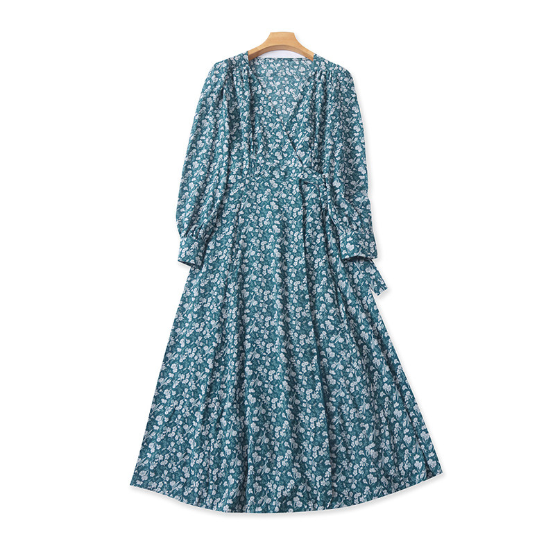 雪纺碎花长款连衣裙 夏季长袖系带百搭A字裙显瘦外贸女裙子 19344