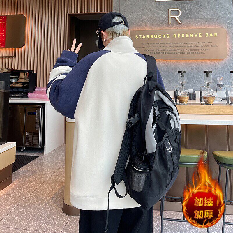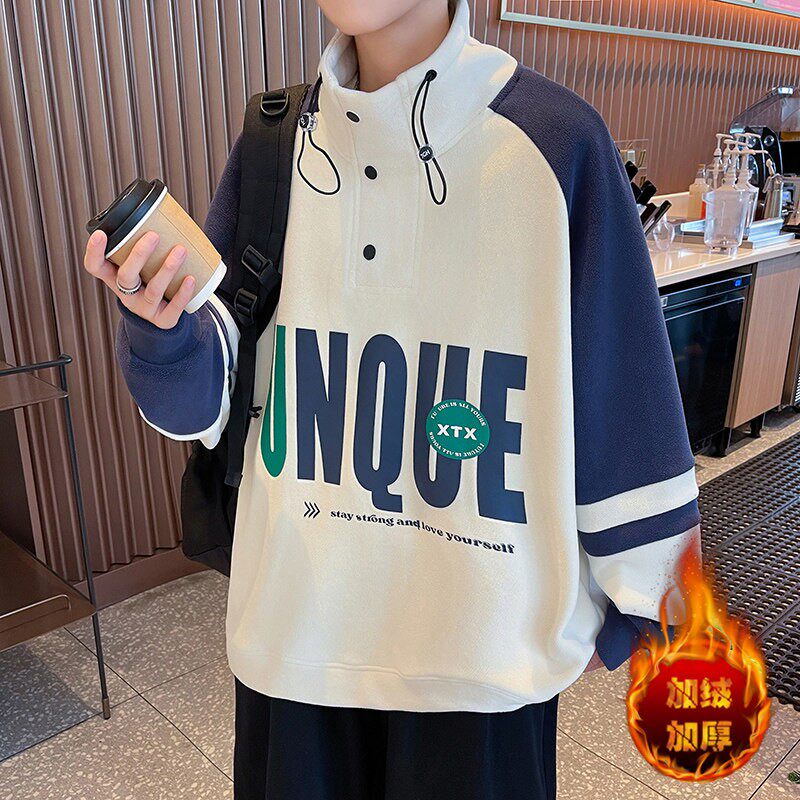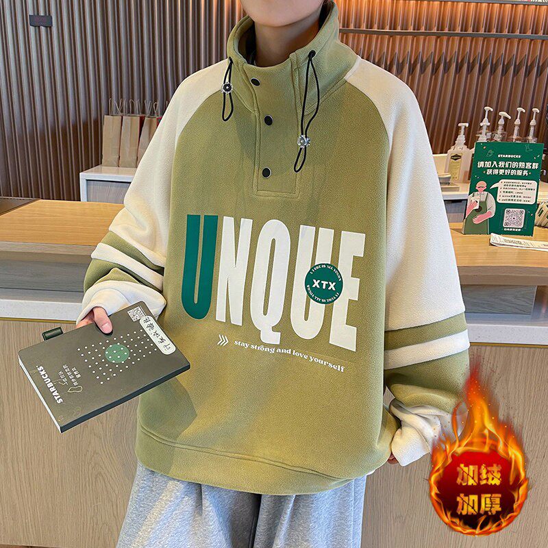 冬款青少年双面奥粒绒卫衣男生帅气印花加绒加厚长袖T恤大童外套