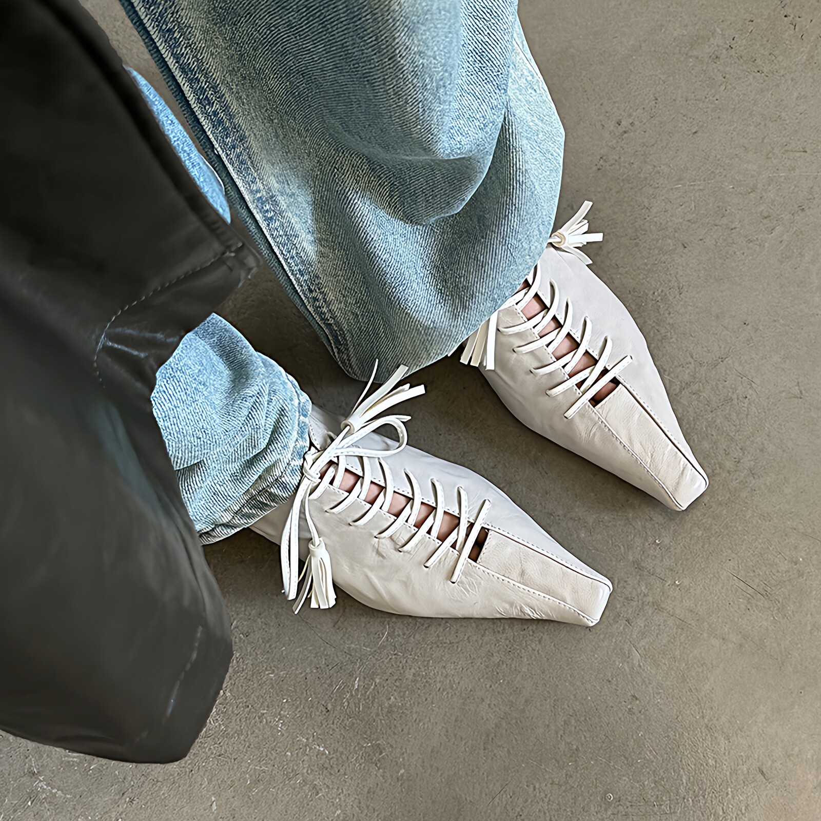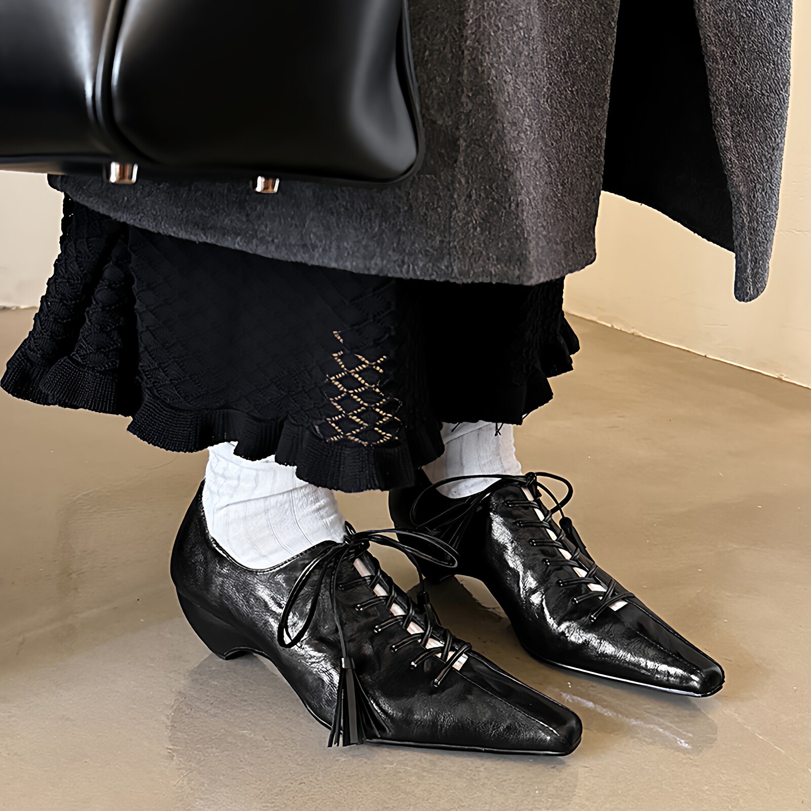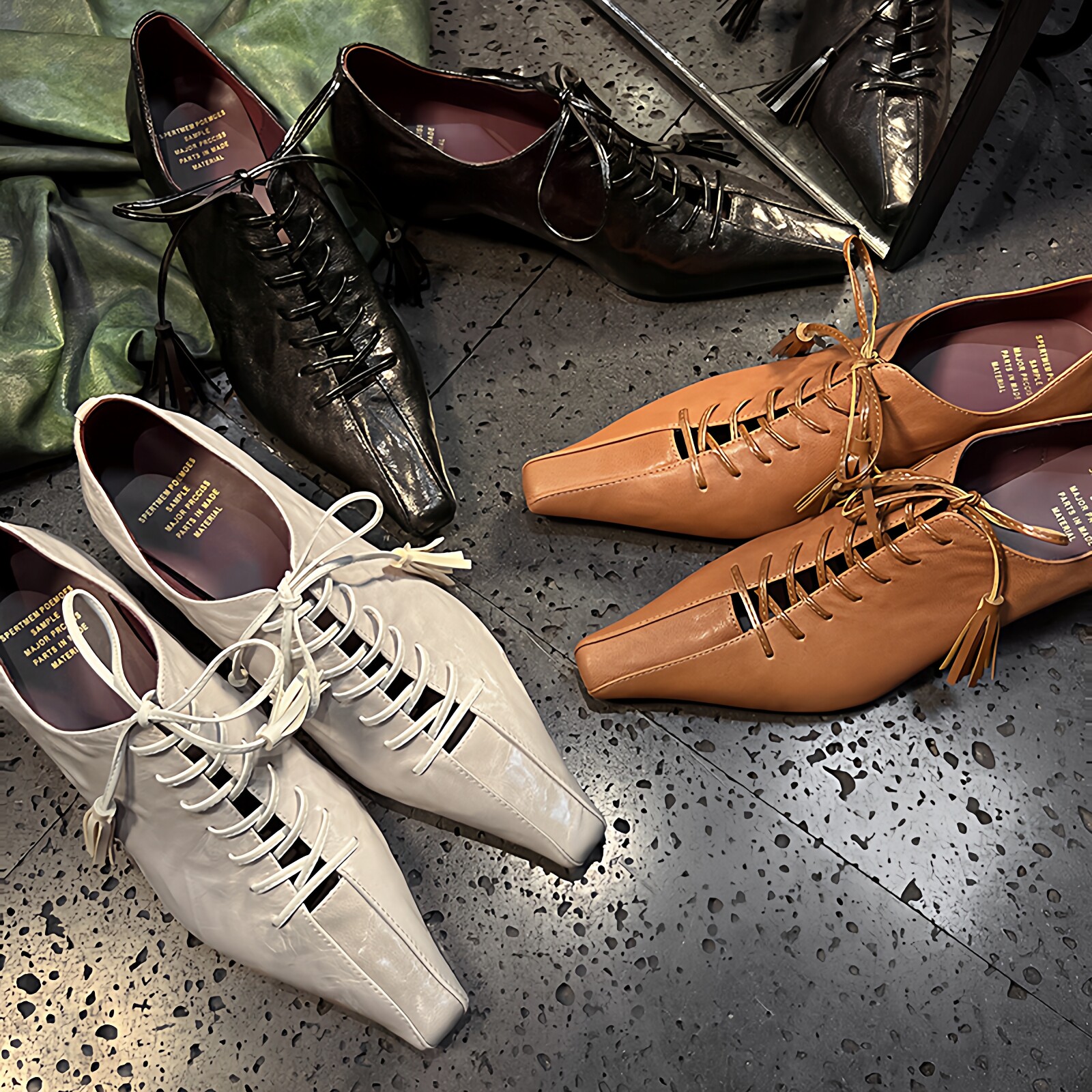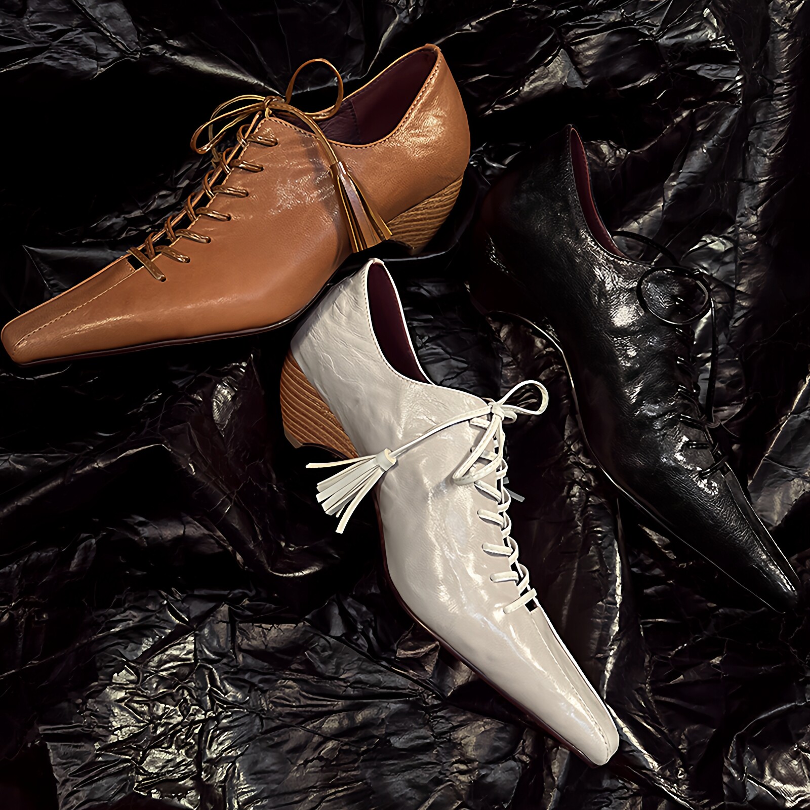强推 Vintage复古小方头显瘦修腿绑带单鞋中跟女鞋单鞋真皮羊皮
